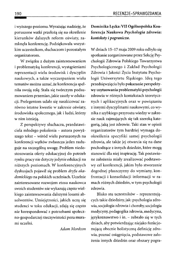 RECENZJE-SPRAWOZDANIA 190 i wyższego poziomu. Wyrażając nadzieję, że Dominika Łęcka: VII Ogólnopolska Kon- poruszone watki przełożą się na określenie ferencja Naukowa Psychologia kierunków dalszych reform oświaty, za- konteksty i zdrowia: pogranicza. mknęła konferencję. Podziękowała wszystkim uczestnikom, słuchaczom i pozostałym W dniach 15-17 maja 2009 roku odbyło się spotkanie zorganizowane przez Sekcję Psy- organizatorom. W związku z dużym zainteresowaniem chologii Zdrowia Polskiego Towarzystwa i problematyką konferencji, wystąpieniami Psychologicznego i Zakład Psychologii reprezentacji wielu środowisk i dyscyplin Zdrowia i Jakości Życia Instytutu Psycho- naukowych, a także wyczerpaniem wielu logii Uniwersytetu Śląskiego. Ideą tego tematów można uznać, że konferencja speł- przedsięwzięcia było pokazanie perspekty- niła swoją rolę. Stała się twórczym podsu- wy usytuowania problematyki psychologii mowaniem przemian, jakie zaszły w eduka- zdrowia w różnych kontekstach teoretycz- cji. Prelegentom udało się naszkicować za- nych i aplikacyjnych oraz w powiązaniu równo istotne kwestie w zakresie oświaty, z innymi dyscyplinami naukowymi, co wy- środowiska społecznego, jak i ludzi, którzy nika z szybkiego przyrostu wiedzy w zakresie nauk zajmujących się tak szeroką kate- w nim istnieją. Z perspektywy słuchacza, przedstawi- gorią, jaką jest zdrowie. Taki stan w opinii ciela młodego pokolenia - autora powyż- organizatorów tym bardziej wymaga do- szego tekst - wśród wielu poruszonych na określenia specyfiki samej psychologii konferencji wątków zwłaszcza jeden zasłu- zdrowia, ale także jej otwarcia się na dane guje na szczególną uwagę. Problem niedo- pochodzące z innych dziedzin, które mogą stosowania oferty edukacyjnej do potrzeb stanowić dla niej inspirację. Tak postawio- rynku pracy nie dotyczy jedynie edukacji na ne założenia miały zrealizować podstawo- niższych poziomach. W konferencyjnych wy cel konferencji, jakim było stworzenie dyskusjach pojawił się problem dryfu aka- dogodnej płaszczyzny do wymiany, kon- demickiego na polskich uczelniach. Uczelnie frontacji i konsolidacji informacji w ra- zainteresowane rozwojem etosu naukowca mach różnych dziedzin, w tym psychologii swoich studentów nie wykazują często wiel- zdrowia. kiego zainteresowania dalszymi losami ab- Blisko stu uczestników - reprezentują- solwentów. Umiejętności, jakich uczą się cych takie dziedziny, jak: psychologia zdro- studenci w toku edukacji, zdają się często wia, socjologia zdrowia i choroby, socjologia nie korespondować z potrzebami społecz- medycyny, pedagogika zdrowia, medycyna, no-gospodarczej rzeczywistości poza mura- językoznawstwo i in. - zebrało się w tych mi uczelni. dniach, aby potwierdzając niejako funkcjoAdam Mordzon nującą obecnie holistyczną definicję zdrowia, poznać osiągnięcia, podstawowe założenia innych dziedzin oraz obszary pogra- 191 RECENZJE-SPRAWOZDANIA niczne, które w przyszłości stanowić mogą wych, którzy przedstawiali zdrowie i zagad- podstawę współpracy interdyscyplinarnej. nienia z nim związane w perspektywie Wyjaśnieniem i niejako inspiracją do reali- własnych dziedzin. Przedstawicielką psy- zacji tych zadań był otwierający konferencję chologii zdrowia była dr hab. Helena Wro- wykład wygłoszony przez przewodniczącą na-Polańska (UP Kraków), która zaprezen- Komitetu Naukowego, dr hab. Małgorzatę towała wystąpienie pt. Psychologia Górnik-Durose, prof. UŚ. pt. Psychologia w kontekście medycyny i edukacji, przedsta- zdrowia: konteksty i pogranicza. Umieszcza- wiając swoje doświadczenia ze współpracy zdrowia jąc psychologię zdrowia w centrum zainte- z dr. Julianem Aleksandrowiczem, który resowań, wskazała jednocześnie, że nie jest otworzył medycynę na współpracę z innymi ona wyspą - jedyną dziedziną zajmującą się dziedzinami nauki. Reprezentantami socjo- tym zagadnieniem. Tak postawione założe- logii byli dr Krzysztof Puchalski (SWPS nie wymaga zatem od tej dyscypliny uela- Warszawa) z referatem Psychologia stycznienia się na dane pochodzące z innych logia wobec współczesnych i socjo- przejawów pro- obszarów, uwrażliwienie i otwarcie się na mocji zdrowia, w którym podkreślał znacze- poszukiwanie innych kontekstów, zwłaszcza nie i potrzebę określenia tożsamości psy- na styku różnych dyscyplin, co może uła- chologii zdrowia jako dyscypliny naukowej twiać budowanie partnerstwa. Kontekst ro- w dyskursie społecznym, oraz mgr Domini- zumiany tutaj jako zespół odniesień nie- ka Łęcka (UMK Toruń) z wystąpieniem zbędnych do zrozumienia zdrowia wymaga Socjosomatyka od uczestnika nabycia kompetencji kontek- somatyki... stualnych, które autorka przedstawiła wia możne uzyskać od socjologii w trakcie swojego wystąpienia. Przedstawi- i choroby, która przedstawiła zjawisko so- ła ona także potencjalne obszary pogranicz- matyzacji jako potencjalny obszar współ- - odzyskana siostra psycho- czyli o tym, co psychologia zdrozdrowia ne, które mogą wynikać z tak postawionego pracy obu dziedzin. Następnie dr hab. Ele- założenia: między psychologią zdrowia a in- onora Bielawska-Batorowicz (UŁ Łódź) nymi subdyscyplinami psychologii (p. roz- wskazała możliwości współpracy interdy- wojową, społeczną, kliniczną itd.), socjolo- scyplinarnej w referacie Psychologia gią, pedagogiką, medycyną i zagadnieniami wia a starzenie się. Możliwość zdrów, wyraziła nadzieję, że przewidziany teorii i praktyki psychologii zdrowia do opty- zdro- wykorzystania się. Natomiast program konferencji będzie jednym z kro- malizacji ków otwierającym ten dialog, trudny, acz- próbą przedstawienia nowej subdyscypliny kolwiek fascynujący. psychologii, która może być partnerem dla Pierwsza sesja referatowa zatytułowana Psychologia zdrowia w relacjach interdyscy- procesu starzenia psychologii z
