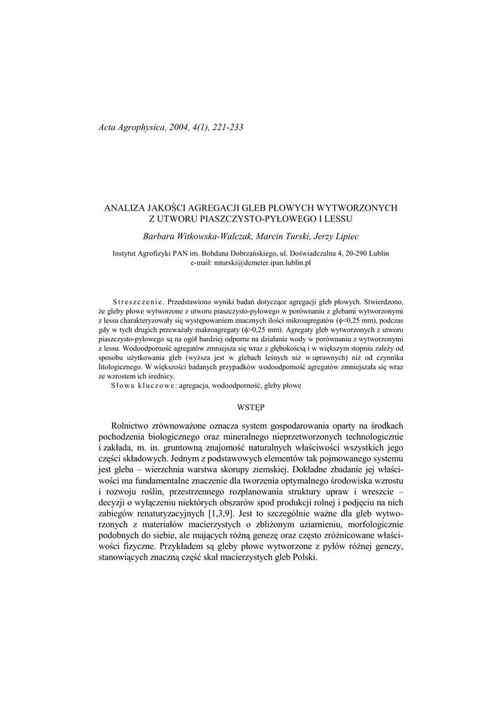Acta Agrophysica, 2004, 4(1), 221-233 ANALIZA JAKOŚCI AGREGACJI GLEB PŁOWYCH WYTWORZONYCH Z UTWORU PIASZCZYSTO-PYŁOWEGO I LESSU Barbara Witkowska-Walczak, Marcin Turski, Jerzy Lipiec Instytut Agrofizyki PAN im. Bohdana Dobrzańskiego, ul. Doświadczalna 4, 20-290 Lublin e-mail: [email protected] S t r e s z c z e n i e . Przedstawiono wyniki badań dotyczące agregacji gleb płowych. Stwierdzono, Ŝe gleby płowe wytworzone z utworu piaszczysto-pyłowego w porównaniu z glebami wytworzonymi z lessu charakteryzowały się występowaniem znacznych ilości mikroagregatów (φ<0,25 mm), podczas gdy w tych drugich przewaŜały makroagregaty (φ>0,25 mm). Agregaty gleb wytworzonych z utworu piaszczysto-pyłowego są na ogół bardziej odporne na działanie wody w porównaniu z wytworzonymi z lessu. Wodoodporność agregatów zmniejsza się wraz z głębokością i w większym stopniu zaleŜy od sposobu uŜytkowania gleb (wyŜsza jest w glebach leśnych niŜ w uprawnych) niŜ od czynnika litologicznego. W większości badanych przypadków wodoodporność agregatów zmniejszała się wraz ze wzrostem ich średnicy. S ł o w a k l u c z o w e : agregacja, wodoodporność, gleby płowe WSTĘP Rolnictwo zrównowaŜone oznacza system gospodarowania oparty na środkach pochodzenia biologicznego oraz mineralnego nieprzetworzonych technologicznie i zakłada, m. in. gruntowną znajomość naturalnych właściwości wszystkich jego części składowych. Jednym z podstawowych elementów tak pojmowanego systemu jest gleba – wierzchnia warstwa skorupy ziemskiej. Dokładne zbadanie jej właściwości ma fundamentalne znaczenie dla tworzenia optymalnego środowiska wzrostu i rozwoju roślin, przestrzennego rozplanowania struktury upraw i wreszcie – decyzji o wyłączeniu niektórych obszarów spod produkcji rolnej i podjęciu na nich zabiegów renaturyzacyjnych [1,3,9]. Jest to szczególnie waŜne dla gleb wytworzonych z materiałów macierzystych o zbliŜonym uziarnieniu, morfologicznie podobnych do siebie, ale mających róŜną genezę oraz często zróŜnicowane właściwości fizyczne. Przykładem są gleby płowe wytworzone z pyłów róŜnej genezy, stanowiących znaczną część skał macierzystych gleb Polski. 222 B. WITKOWSKA-WALCZAK i in. Agregacja gleby i jej odporność na czynniki destrukcyjne jest jednym z najwaŜniejszych elementów decydujących o Ŝyzności i urodzajności oraz o bilansie wodnym pól i regionów. Budowa agregatowa ma podstawowe znaczenie dla stosunków wodno-powietrznych wszystkich gleb mineralnych, a wielkość agregatów glebowych determinuje ich właściwości fizyczne, m.in. trwałość [2,5,6,8]. Zanik struktury agregatowej gleb wiąŜe się z odpornością agregatów przede wszystkim na destrukcyjne działanie wody, a wodoodporność jest jedną z najbardziej istotnych ich cech, przyjmowaną za miarę jakości agregacji [7,12]. Celem niniejszej pracy jest szczegółowe poznanie właściwości agregacji, a szczególnie wodoodporności agregatów, róŜnie uŜytkowanych gleb wytworzonych z utworów piaszczysto-pyłowych PłaskowyŜu Kolbuszowskiego oraz porównanie ich z właściwościami agregatów gleb wytworzonych z lessów WyŜyny Lubelskiej. MATERIAŁ I METODY BADAŃ Lokalizacja i charakterystyka badanych profili glebowych Badaniami objęto profile gleb płowych (Haplic Luvisols) z czterech stanowisk, z których dwa pierwsze znajdują się na PłaskowyŜu Kolbuszowskim (Kotlina Sandomierska) w południowo-zachodnich okolicach LeŜajska [4], na terenie wsi Grodzisko Górne. Próbki glebowe zostały pobrane jesienią 2001 roku, zarówno z pola uprawnego, jak i z sąsiadującego lasu mieszanego, porastającego wierzchowinę – kulminację terenu. Profil 1 (las) ma następującą budowę: poziomem wierzchnim jest poziom akumulacyjny Ah mający miąŜszość 7 cm, przechodzący z niewielkimi zaciekami w poziom przemywania Eet. Poziom Eet o miąŜszości 16 cm, niewyraźnie przechodzi w podpoziom Eetg wykazujący cechy glejowe spowodowane okresowym stagnowaniem wód opadowych nad trudno przepuszczalnym poziomem Bt. Poziom iluwialnego nagromadzenia frakcji ilastej Bt znajduje się na głębokości 33-65 cm, ma barwę rdzawo-brunatną i dodatkowo charakteryzuje się występowaniem licznych konkrecji Ŝelazistych. Na głębokości poniŜej 65 cm znajduje się utwór piaszczystopyłowy – materiał macierzysty oznaczony jako poziom BtC. Profil 2 (pole uprawne) jest wykształcony w następujący sposób: poziomem wierzchnim jest poziom orny Ap o miąŜszości 16 cm, poniŜej zaś znajduje się poziom przemywania Eet niezróŜnicowany na podpoziomy, wyraźnie przechodzący na głębokości około 60 cm w poziom iluwialnego nagromadzenia frakcji ilastej Bt. Kolejne dwa profile zlokalizowane są w Czesławicach na zbudowanym z typowego lessu PłaskowyŜu Nałęczowskim (WyŜyna Lubelska) [10]. Próbki zostały pobrane z wierzchowiny lessowej, w miejscu gdzie wykształcił się profil typowej gleby płowej ze wszystkimi charakterystycznymi dla niej poziomami genetycznymi. ANALIZA JAKOŚCI AGREGACJI GLEB PŁOWYCH 223 Profil 3 (las) jest morfologicznie podobny do profilu 1. RóŜni się jedynie mniej miąŜszym (4 cm) poziomem akumulacyjnym Ah, mniej wyraźnie wykształconym poziomem przemywania AhE (4-24 cm), mającym cechy przejściowe pomiędzy Ah i Eet. Doskonale widoczny poziom iluwialnego nagromadzenia frakcji ilastej Bt zróŜnicowany jest na dwa podpoziomy Bt1 (24-50 cm) i Bt2 (50-80 cm), z których leŜący niŜej wykazuje cechy warstwowania. Na głębokości poniŜej 80 cm znajduje się juŜ skała macierzysta – less (C). Profil 4 (pole uprawne) charakteryzuje się występowaniem czterech typowych dla gleby płowej wytworzonej z lessu poziomów genetycznych: ornego Ap (0-15 cm), przemywania Eet (15-25 cm), iluwialnego nagromadzenia frakcji ilastej Bt (2535 cm) i skały macierzystej C (poniŜej 35 cm). Metodyka badań Próbki glebowe o nienaruszonej strukturze p