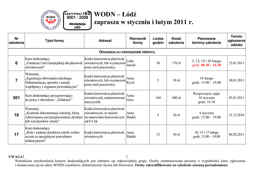 OFERTA WODN-Łódź na STYCZEŃ i LUTY 2011 r.