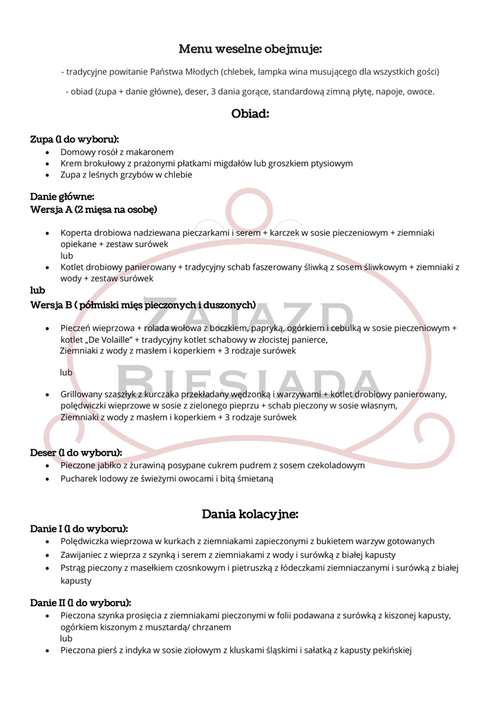 Menu weselne obejmuje: - tradycyjne powitanie Państwa Młodych (chlebek, lampka wina musującego dla wszystkich gości) - obiad (zupa + danie główne), deser, 3 dania gorące, standardową zimną płytę, napoje, owoce. Obiad: Zupa (1 do wyboru): Domowy rosół z makaronem Krem brokułowy z prażonymi płatkami migdałów lub groszkiem ptysiowym Zupa z leśnych grzybów w chlebie Danie główne: Wersja A (2 mięsa na osobę) Koperta drobiowa nadziewana pieczarkami i serem + karczek w sosie pieczeniowym + ziemniaki opiekane + zestaw surówek lub Kotlet drobiowy panierowany + tradycyjny schab faszerowany śliwką z sosem śliwkowym + ziemniaki z wody + zestaw surówek lub Wersja B ( półmiski mięs pieczonych i duszonych) Pieczeń wieprzowa + rolada wołowa z boczkiem, papryką, ogórkiem i cebulką w sosie pieczeniowym + kotlet „De Volaille” + tradycyjny kotlet schabowy w złocistej panierce, Ziemniaki z wody z masłem i koperkiem + 3 rodzaje surówek lub Grillowany szaszłyk z kurczaka przekładany wędzonką i warzywami + kotlet drobiowy panierowany, polędwiczki wieprzowe w sosie z zielonego pieprzu + schab pieczony w sosie własnym, Ziemniaki z wody z masłem i koperkiem + 3 rodzaje surówek Deser (1 do wyboru): Pieczone jabłko z żurawiną posypane cukrem pudrem z sosem czekoladowym Pucharek lodowy ze świeżymi owocami i bitą śmietaną Danie I (1 do wyboru): Dania kolacyjne: Polędwiczka wieprzowa w kurkach z ziemniakami zapieczonymi z bukietem warzyw gotowanych Zawijaniec z wieprza z szynką i serem z ziemniakami z wody i surówką z białej kapusty Pstrąg pieczony z masełkiem czosnkowym i pietruszką z łódeczkami ziemniaczanymi i surówką z białej kapusty Danie II (1 do wyboru): Pieczona szynka prosięcia z ziemniakami pieczonymi w folii podawana z surówką z kiszonej kapusty, ogórkiem kiszonym z musztardą/ chrzanem lub Pieczona pierś z indyka w sosie ziołowym z kluskami śląskimi i sałatką z kapusty pekińskiej Danie III (1 do wyboru): Węgierska zupa gulaszowa Kwaśnica góralska z żeberkiem Barszcz czerwony z krokietem Zimna płyta: Półmisek wędlin: Rolada cygańska, kabanos, szynka staropolska, szynka szlachetna Pasztet domowy Kiełbasa wiejska, kiełbasa lisiecka Baleron wiejski Sałatki (dwie do wyboru): Tradycyjna jarzynowa Grecka z serem feta i oliwkami Z szynką, porem i jajkiem Z kurczakiem, ananasem i porem Śledzie na dwa sposoby ( w oleju i śmietanie) Galaretki drobiowe Jajka pod majonezem Marynaty: pieczarki, ogórki konserwowe, papryka konserwowa Pieczywo na zakwasie Patery owoców ( 5-6 rodzajów) Napoje zimne (soki owocowe, woda mineralna, coca-cola, sprite, fanta bez ograniczeń) Napoje gorące (kawa, herbata bez ograniczeń) Dodatkowo proponujemy: patery ciast (5-6 rodzajów) + tort weselny w cenie 16zł/osobę napoje alkoholowe ( wino, wódka) w cenie detalicznej * zniżka w wysokości 100% dla dzieci do 4 lat * zniżka w wysokości 50% dla dzieci w wieku od 4 do 10 lat