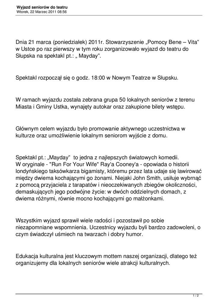 Wyjazd seniorów do teatru Wtorek, 22 Marzec 2011 08:56 Dnia 21 marca (poniedziałek) 2011r. Stowarzyszenie „Pomocy Bene – Vita” w Ustce po raz pierwszy w tym roku zorganizowało wyjazd do teatru do Słupska na spektakl pt.: „ Mayday”. Spektakl rozpoczął się o godz. 18:00 w Nowym Teatrze w Słupsku. W ramach wyjazdu została zebrana grupa 50 lokalnych seniorów z terenu Miasta i Gminy Ustka, wynajęty autokar oraz zakupione bilety wstępu. Głównym celem wyjazdu było promowanie aktywnego uczestnictwa w kulturze oraz umożliwienie lokalnym seniorom wyjście z domu. Spektakl pt.: „Mayday” to jedna z najlepszych światowych komedii. W oryginale - "Run For Your Wife" Ray'a Cooney'a - opowiada o historii londyńskiego taksówkarza bigamisty, któremu przez lata udaje się lawirować między dwiema kochającymi go żonami. Niejaki John Smith, usiłuje wybrnąć z pomocą przyjaciela z tarapatów i nieoczekiwanych zbiegów okoliczności, demaskujących jego podwójne życie: w dwóch oddzielnych domach, z dwiema różnymi, równie mocno kochającymi go małżonkami. Wszystkim wyjazd sprawił wiele radości i pozostawił po sobie niezapomniane wspomnienia. Uczestnicy wyjazdu byli bardzo zadowoleni, o czym świadczył uśmiech na twarzach i dobry humor. Edukacja kulturalna jest kluczowym mottem naszej organizacji, dlatego też organizujemy dla lokalnych seniorów wiele atrakcji kulturalnych. 1/2 Wyjazd seniorów do teatru Wtorek, 22 Marzec 2011 08:56 2/2
