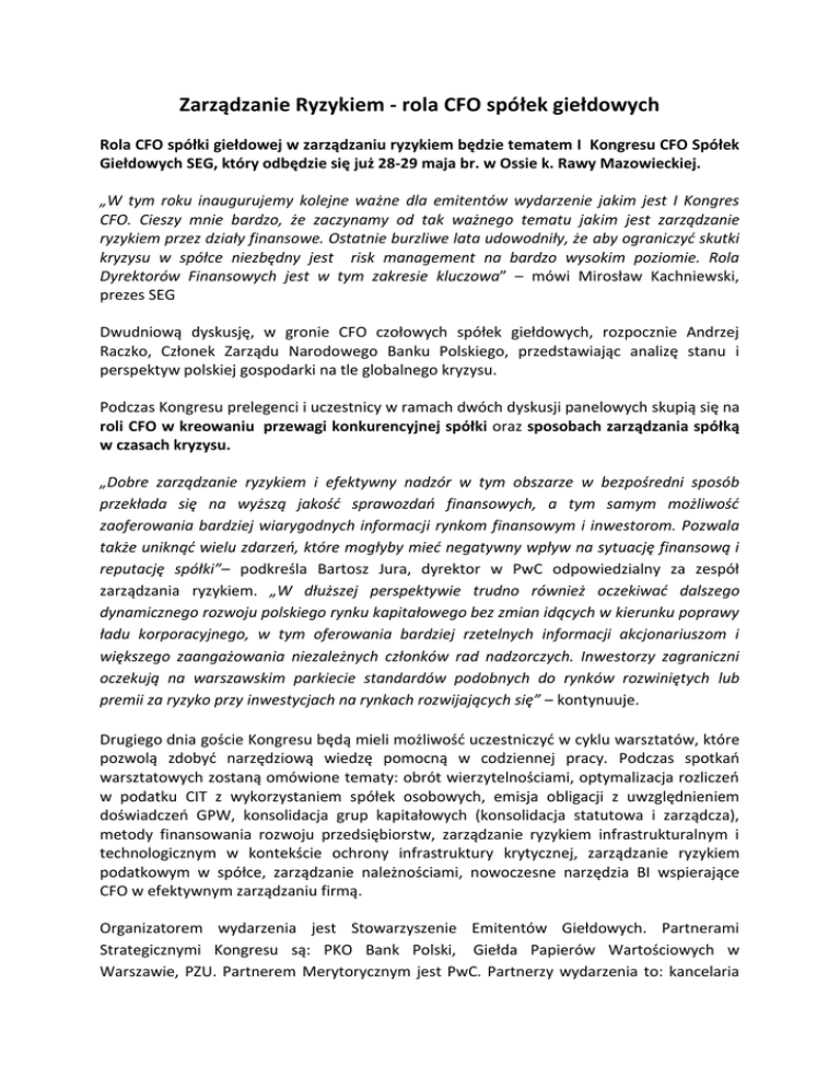 Zarządzanie Ryzykiem - rola CFO spółek giełdowych Rola CFO spółki giełdowej w zarządzaniu ryzykiem będzie tematem I Kongresu CFO Spółek Giełdowych SEG, który odbędzie się już 28-29 maja br. w Ossie k. Rawy Mazowieckiej. „W tym roku inaugurujemy kolejne ważne dla emitentów wydarzenie jakim jest I Kongres CFO. Cieszy mnie bardzo, że zaczynamy od tak ważnego tematu jakim jest zarządzanie ryzykiem przez działy finansowe. Ostatnie burzliwe lata udowodniły, że aby ograniczyć skutki kryzysu w spółce niezbędny jest risk management na bardzo wysokim poziomie. Rola Dyrektorów Finansowych jest w tym zakresie kluczowa” – mówi Mirosław Kachniewski, prezes SEG Dwudniową dyskusję, w gronie CFO czołowych spółek giełdowych, rozpocznie Andrzej Raczko, Członek Zarządu Narodowego Banku Polskiego, przedstawiając analizę stanu i perspektyw polskiej gospodarki na tle globalnego kryzysu. Podczas Kongresu prelegenci i uczestnicy w ramach dwóch dyskusji panelowych skupią się na roli CFO w kreowaniu przewagi konkurencyjnej spółki oraz sposobach zarządzania spółką w czasach kryzysu. „Dobre zarządzanie ryzykiem i efektywny nadzór w tym obszarze w bezpośredni sposób przekłada się na wyższą jakość sprawozdań finansowych, a tym samym możliwość zaoferowania bardziej wiarygodnych informacji rynkom finansowym i inwestorom. Pozwala także uniknąć wielu zdarzeń, które mogłyby mieć negatywny wpływ na sytuację finansową i reputację spółki”– podkreśla Bartosz Jura, dyrektor w PwC odpowiedzialny za zespół zarządzania ryzykiem. „W dłuższej perspektywie trudno również oczekiwać dalszego dynamicznego rozwoju polskiego rynku kapitałowego bez zmian idących w kierunku poprawy ładu korporacyjnego, w tym oferowania bardziej rzetelnych informacji akcjonariuszom i większego zaangażowania niezależnych członków rad nadzorczych. Inwestorzy zagraniczni oczekują na warszawskim parkiecie standardów podobnych do rynków rozwiniętych lub premii za ryzyko przy inwestycjach na rynkach rozwijających się” – kontynuuje. Drugiego dnia goście Kongresu będą mieli możliwość uczestniczyć w cyklu warsztatów, które pozwolą zdobyć narzędziową wiedzę pomocną w codziennej pracy. Podczas spotkań warsztatowych zostaną omówione tematy: obrót wierzytelnościami, optymalizacja rozliczeń w podatku CIT z wykorzystaniem spółek osobowych, emisja obligacji z uwzględnieniem doświadczeń GPW, konsolidacja grup kapitałowych (konsolidacja statutowa i zarządcza), metody finansowania rozwoju przedsiębiorstw, zarządzanie ryzykiem infrastrukturalnym i technologicznym w kontekście ochrony infrastruktury krytycznej, zarządzanie ryzykiem podatkowym w spółce, zarządzanie należnościami, nowoczesne narzędzia BI wspierające CFO w efektywnym zarządzaniu firmą. Organizatorem wydarzenia jest Stowarzyszenie Emitentów Giełdowych. Partnerami Strategicznymi Kongresu są: PKO Bank Polski, Giełda Papierów Wartościowych w Warszawie, PZU. Partnerem Merytorycznym jest PwC. Partnerzy wydarzenia to: kancelaria prawna Hogan Lovells, Grupa Kapitałowa PGNiG, Solver, Oracle i Standard & Poor's Rating Services. Udział w Kongresie jest bezpłatny. Kongres przeznaczony jest dla przedstawicieli spółek giełdowych. Więcej informacji na stronie www.seg.org.pl