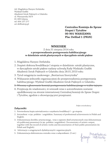 Ad. Magdalena Hanysz-Stefańska Wydział Grafiki Akademii Sztuk Pięknych w Gdańsku ul. Warszawska 56/9 81-309 Gdynia tel. 604 137 277 [email protected] Centralna Komisja do Spraw Stopni i Tytułów 00-901 WARSZAWA Plac Defilad 1 (PKiN) WNIOSEK Z dnia 31 sierpnia 2014 roku o przeprowadzenie postępowania habilitacyjnego w dziedzinie sztuk plastycznych w dyscyplinie sztuki piękne 1.Magdalena Hanysz-Stefańska 2.Stopień doktora/kwalifikacje I stopnia w dziedzinie: sztuki plastyczne, w dyscyplinie sztuki piękne nadany uchwałą Rady Wydziału Grafiki Akademii Sztuk Pięknych w Gdańsku dnia 28.01.2010 roku 3.Tytuł osiągnięcia naukowego: „Bestiariusz linorytnika” 4.Wskazanie jednostki organizacyjnej do przeprowadzenia postępowania habilitacyjnego: Wydział Grafiki Akademii Sztuk Pięknych w Gdańsku. 5.Wnoszę o głosowanie komisji postępowania habilitacyjnego w trybie tajnym. 6.Przyjmuję do wiadomości, iż wniosek wraz z autoreferatem zostanie opublikowany na stronie internetowej Centralnej komisji do Spraw Stopni i Tytułów, zgodnie z obowiązującymi przepisami. Podpis wnioskodawcy Załączniki: 1. Potwierdzona kopia zaświadczenia o uzyskaniu kwalifikacji I – go stopnia. 2. Autoreferat w jęz. polskim i angielskim. Summary of professional achievements in Polish and English. 3. Dokumentacja dorobku artystycznego, wraz z zapisem dzieł artystycznych oraz dokumentacja ich publicznej prezentacji (w jęz. polskim i angielskim). Documentary of artistic output, together with the record of artistic works and documentation of their public presentation (in Polish and English). 4. Informacje o osiągnięciach dydaktycznych i organizacyjnych. 5. Dokumentacja elektroniczna wniosku wraz z załącznikami. (2 szt.) 5