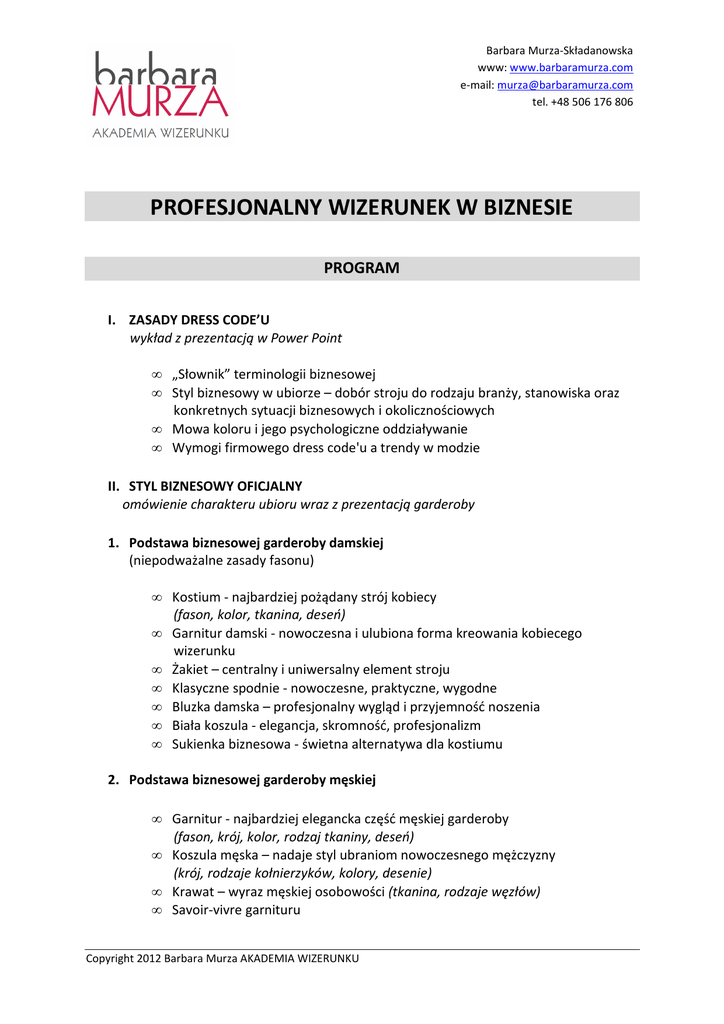 Barbara Murza-Składanowska www: www.barbaramurza.com e-mail: [email protected] tel. +48 506 176 806 PROFESJONALNY WIZERUNEK W BIZNESIE PROGRAM I. ZASADY DRESS CODE’U wykład z prezentacją w Power Point • „Słownik” terminologii biznesowej • Styl biznesowy w ubiorze – dobór stroju do rodzaju branży, stanowiska oraz konkretnych sytuacji biznesowych i okolicznościowych • Mowa koloru i jego psychologiczne oddziaływanie • Wymogi firmowego dress code'u a trendy w modzie II. STYL BIZNESOWY OFICJALNY omówienie charakteru ubioru wraz z prezentacją garderoby 1. Podstawa biznesowej garderoby damskiej (niepodważalne zasady fasonu) • Kostium - najbardziej pożądany strój kobiecy (fason, kolor, tkanina, deseń) • Garnitur damski - nowoczesna i ulubiona forma kreowania kobiecego wizerunku • Żakiet – centralny i uniwersalny element stroju • Klasyczne spodnie - nowoczesne, praktyczne, wygodne • Bluzka damska – profesjonalny wygląd i przyjemność noszenia • Biała koszula - elegancja, skromność, profesjonalizm • Sukienka biznesowa - świetna alternatywa dla kostiumu 2. Podstawa biznesowej garderoby męskiej • Garnitur - najbardziej elegancka część męskiej garderoby (fason, krój, kolor, rodzaj tkaniny, deseń) • Koszula męska – nadaje styl ubraniom nowoczesnego mężczyzny (krój, rodzaje kołnierzyków, kolory, desenie) • Krawat – wyraz męskiej osobowości (tkanina, rodzaje węzłów) • Savoir-vivre garnituru Copyright 2012 Barbara Murza AKADEMIA WIZERUNKU Barbara Murza-Składanowska www: www.barbaramurza.com e-mail: [email protected] tel. +48 506 176 806 III. STYL BIZNESOWY NIEOFICJALNY omówienie charakteru ubioru wraz z prezentacją garderoby IV. OBUWIE I DODATKI • Obuwie męskie i skarpety – para nierozłączna (typy obuwia, dopasowanie koloru i grubości skarpet do stroju) • Obuwie damskie – nakazy i zakazy • Rola dodatków w biznesie i sposób dobierania V. „ZŁODZIEJE” WIZERUNKU • Uchybienia w wyglądzie • Gorące dni a elegancja VI. OGÓLNE ZASADY PIELĘGNACJI • Fryzura i makijaż w pracy • Męski zarost – tak czy nie? • Dłonie naszą wizytówką VII. KOORDYNACJA STROJU • Manewry deseniami, kolorami i fakturą stroju business dress i casual CENA Ilość uczestników: 6 osób (min. 4 osoby) Cena: 1300 zł/os netto Czas trwania: 8 godz. (w tym godz. przerwa na lunch) Istnieje możliwość odbycia szkolenia indywidualnie! Ilość uczestników: 1 osoba Cena: 2800 zł netto Czas trwania: 8 godz. (w tym godz. przerwa na lunch) DLA UCZESTNIKÓW SZKOLEŃ W AKADEMII WIZERUNKU BARBARY MURZA 10% RABATU Copyright 2012 Barbara Murza AKADEMIA WIZERUNKU Barbara Murza-Składanowska www: www.barbaramurza.com e-mail: [email protected] tel. +48 506 176 806 WARUNKI UCZESTNICTWA • O uczestnictwie decyduje zgłoszenie w formie przedpłaty - 20% wartości. Pozostałą część kwoty należy wpłacić na 7 dni przed wyznaczonym terminem rozpoczęcia szkolenia. Po tym okresie, w przypadku rezygnacji zwracane jest 50% wartości lub istnieje możliwość rozliczenia z osobą, która zostanie przyjęta na Państwa miejsce. • W przypadku zdarzeń losowych możliwe jest wyznaczenie nowego terminu spotkania bez dodatkowych obciążeń. • Mile widziane są certyfikat ukończenia kursu stylizacji ubioru oraz posiadanie doświadczenia zawodowego w prowadzeniu szkoleń Terminy i godziny rozpoczęcia ustalane są bezpośrednio z zainteresowanymi Miejsce spotkania: • Sala wykładowa w centrum Wrocławia Zgłaszając uczestnictwo w szkoleniu, jednocześnie wyrażacie Państwo zgodę na wykorzystanie swoich danych oraz wizerunku w celach marketingowych zgodnie z Ustawą z dn. 29.08.1997r o Ochronie danych Osobowych (Dz. U. nr 133 poz. 883), z czego w każdej chwili można rezygnować. ZAPRASZAM SERDECZNIE! Copyright 2012 Barbara Murza AKADEMIA WIZERUNKU