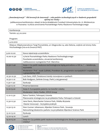 „Inno(moty)wacje” Od inwencji do innowacji – rola parków technologicznych w budowie gospodarki opartej na wiedzy jubileuszowa konferencja z okazji 20-lecia działalności Fundacji Uniwersytetu im. A. Mickiewicza w Poznaniu i 15-lecia utworzenia Poznańskiego Parku Naukowo-Technologicznego Konferencja Termin: 4-5.10.2010 Program: 4.10.2010 Miejsce: Międzynarodowe Targi Poznańskie, ul. Głogowska 14, sala Zielona, wejście od strony Holu Wschodniego (vis-a-vis Dworca PKP) 9.00-10.00 Kawa rejestracja uczestników 10.00-10.30 15-lecie Poznańskiego Parku Naukowo-Technologicznego Powitanie uczestników, otwarcie konferencji, Jubileuszowe wystąpienie Prof. Marcińca 10.30-11.40 Sesja I: Czy parki naukowo-technologiczne będą potrzebne w XXI w. ? – tendencje, wyzwania Moderator: Prof. Jacek Guliński, Prorektor ds. programów europejskich i współpracy z gospodarką UAM 10.30-10.50 Luis Sanz, IASP, Światowe trendy rozwojowe w parkach 10.50-11.10 Bob Hodgson, Zerknie Group, Parki 3-ciej generacji 11.30-11.40 Dyskusja 11.40-12.10 Przerwa kawowa 12.10-13.20 Sesja II: Europejskie patenty na transfer wiedzy Moderator: Heinz Fiedler, SPICE Group 12.10-12.30 Raivo Tamkivi, Tehnopol, Estonia Planowanie strategiczne na przykładzie Parku Tehnopol w Estonii 12.30-12.50 Jane Davis, Manchester Science Park, Wielka Brytania Klaster innowacji – brytyjskie praktyki 12.50-13.10 Sten Gunnar Johansson, Mjardevi Science Park , Szwecja Networking lokatorów parków na przykładzie Mjardewi Science Park 13.10-13.20 Dyskusja 13.20-14.10 Lunch 14.10-15.20 Sesja III: Czy polskie parki naukowo-technologiczne zbuduj ą gospodarkę oparta na wiedzy? Moderator: Elżbieta Książek, Poznański Park Naukowo-Technologiczny FUAM 14.10-14.25 System innowacji w Polsce, Krzysztof Gulda, Dyrektor Departamentu Strategii i Rozwoju Nauki, Ministerstwo Nauki i Szkolnictwa Wyższego 14.25-14.40 PARP – działania miękkie (benchmarking) i inwestycyjne (5.3, 5.1 PO IG), Aneta Wilmańska Zastępca Prezesa Polskiej Agencji Rozwoju Przedsiębiorczości 14.40-15.10 Przegląd polskich parków naukowo-technologicznych, Krzysztof B. Matusiak, Prezes Stowarzyszenia Organizatorów Ośrodków Innowacji i Przedsiębiorczości w Polsce 15.10-15.20 Dyskusja 15.20-15.40 Przerwa kawowa 15.40-17.45 Sesja IV: Nauka i biznes – czy jest między nimi chemia? Dobre praktyki krajowe Moderator: Krzysztof Gulda, Dyrektor Departamentu Strategii i Rozwoju Nauki, Ministerstwo Nauki i Szkolnictwa Wyższego 15.40-15.55 Poznański Park Naukowo-Technologiczny FUAM Prof. Bogdan Marciniec, Dyrektor PPNT FUAM 15.55-16.10 Grace Construction Products, Dr Felek Jachimowicz, Wiceprezes ds. badań i rozwoju 16.10-16.25 Centrum Badań DNA, Jacek Wojciechowicz, Wiceprezes Zarządu 16.25-16.40 Wrocławski Park Technologiczny S.A., Marek Winkowski, Wiceprezes Wrocławskiego Parku Technologicznego S.A. 16.40-16.55 Nexwell, Michał Kowalczyk 16.55-17.10 Kriosystem, Grzegorz Michalski 17.10-17.25 Park Naukowo-Technologiczny „Technopark” Gliwice Sp. z o.o., Prof. Jan Kosmol, Prezes „Technoparku” 17.25-17.55 i3D 17.55-18.10 Dyskusja 18.10-18.30 Podsumowanie: 4 moderatorów Spotkanie wieczorne: 20.30, Brovaria, Stary Rynek 5.10.2010 Miejsce: Międzynarodowe Targi Poznańskie 9:00-11:00 Zwiedzanie PPNT Panele dyskusyjne 11.30 – 13.00 Mierzenie efektywności funkcjonowania parków Moderacja: Berenika Marciniec, Zastępca Dyrektora Zespołu Infrastruktury Nowoczesnej Gospodarki, Polska Agencja Rozwoju Przedsiębiorczości Elżbieta Książek, Zastępca Dyrektora Poznańskiego Parku NaukowoTechnologicznego FUAM − − − − Raivo Tamkivi, Tallin, Technopol Luis Sanz, IASP Jane Davis, Manchester Science Park Krzysztof B. Matusiak, Stowarzyszenie Organizatorów Ośrodków Innowacji i Przedsiębiorczości w Polsce − Joanna Podgórska, Zespół Innowacji i Technologii, Polska Agencja Rozwoju Przedsiębiorczości 13.00 – 13.30 Przerwa kawowa 13.30-15.00 Sieciowanie parków i ich promocja Moderacja: Łukasz Sztern, Zespół Innowacji i Technologii Polska Agencja Rozwoju Przedsiębiorczości Anna Tórz, Kierownik Inkubatora Technologicznego Poznańskiego Parku Naukowo-Technologicznego FUAM − − − − Sten Gunnar Johansson, Mjardevi Science Park Heinz Fiedler, SPICE Group Bob Hodgson, Zernike Group Bronisława Kowalak, Stowarzyszenie Krajowego Forum Parków Przemysłowych i Parków Technologicznych − Prof. Jan Kosmol, Prezes Parku Naukowo-Technologicznego „Technopark” Gliwice Sp. z o.o. − Marek Winkowski, Wiceprezes Wrocławskiego Parku Technologicznego S.A. 15:00-16:00 Lunch 16.00-16.30 Zamknięcie konferencji: Luis Sanz, Prof. Bogdan Marciniec Koncert z okazji 20-lecia działalności Fundacji UAM: godz. 19:00, Aula Uniwersytetu im. A. Mickiewicza, ul. Wieniawskiego 1 Organizatorzy zastrzegają sobie prawo wprowadzania zmian do programu.