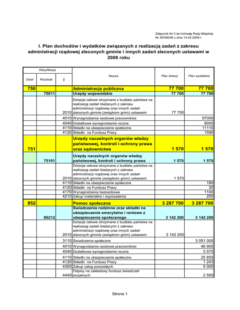 Załącznik Nr 3 do Uchwały Rady Miejskiej Nr XIII/66/08 z dnia 14.02.2008 r. I. Plan dochodów i wydatków związanych z realizacją zadań z zakresu administracji rządowej zleconych gminie i innych zadań zleconych ustawami w 2008 roku Klasyfikacja Nazwa Dział Rozdział 750 Administracja publiczna 75011 Urzędy wojewódzkie Dotacje celowe otrzymane z budżetu państwa na realizację zadań bieżacych z zakresu administracji rządowej oraz innych zadań 2010 zleconych gminie (związkom gmin) ustawami 4010 4040 4110 4120 751 2010 4110 4120 4170 4210 77 700 77 700 77 700 77 700 57000 8000 11110 1590 Dodatkowe wynagrodzenie roczne Składki na ubezpieczenie społeczne Składki na Fundusz Pracy Urzędy naczelnych organów władzy państwowej, kontroli i ochrony prawa 75101 Dotacje celowe otrzymane z budżetu państwa na realizację zadań bieżacych z zakresu administracji rządowej oraz innych zadań zleconych gminie (związkom gmin) ustawami Składki na ubezpieczenie społeczne Składki na Fundusz Pracy Wynagrodzenia bezosobowe Zakup materiałów i wyposażenia Pomoc społeczna 85212 Plan wydatków 77 700 Wynagrodzenia osobowe pracowników Urzędy naczelnych organów władzy państwowej, kontroli i ochrony prawa oraz sądownictwa 852 Plan dotacji § Świadczenia rodzinne oraz składki na ubezpieczenie emerytalne i rentowe z ubezpieczenia społecznego Dotacje celowe otrzymane z budżetu państwa na realizację zadań bieżacych z zakresu administracji rządowej oraz innych zadań 2010 zleconych gminie (związkom gmin) ustawami 3110 Świadczenia społeczne 1 570 1 570 1 570 1 570 1 570 190 30 1100 250 3 287 700 3 287 700 3 142 200 3 142 200 3 142 200 3 051 000 4010 Wynagrodzenia osobowe pracowników 4040 Dodatkowe wynagrodzenie roczne 46 905 3 570 4110 Składki na ubezpieczenie społeczne 4120 Składki na Fundusz Pracy 4300 Zakup usług pozostałych 25 855 1 243 5 000 Odpisy na zakładowy fundusz świadczeń 4440 socjalnych 2 550 Strona 1 Zakup materiałów papierniczych do sprzętu 85213 4740 drukarskiego i urządzeń kserograficznych Składki na ubezpieczenie zdrowotne opłacane za osoby pobierające niektóre świadczenia z pomocy społecznej oraz niektóre śwadczenia rodzinne Dotacje celowe otrzymane z budżetu państwa na realizację zadań bieżacych z zakresu administracji rządowej oraz innych zadań 2010 zleconych gminie (związkom gmin) ustawami 4130 Składki na ubezpieczenie zdrowotne 6 077 18 500 18 500 18500 Zasiłki i pomoc w naturze oraz składki na ubezpieczenie społeczne 127 000 Dotacje celowe otrzymane z budżetu państwa na realizację zadań bieżacych z zakresu administracji rządowej oraz innych zadań 2010 zleconych gminie (związkom gmin) ustawami 127 000 85214 18 500 127 000 3110 Świadczenia społeczne 127 000 Ogólem plan dochodów i wydatków związanych z realizacją zadań bieżacych z zakresu administracji rządowej oraz innych zadań zleconych gminie (związkom gmin) ustawami na 2008 rok 3 366 970 3 366 970 II. Plan dochodów budżetu państwa związnych z realizacją zadań zleconych jednostkom samorządu terytorialnego w 2008 roku Klasyfikacja Nazwa Dział 750 Rozdział 75011 Plan dochodów § Dochody budżetu państwa związane z realizacją zadań zlecanych jednostkom 2350 samorządu terytorialnego Ogółem plan dochodów budżetu państwa związanych z realizacją zadań zlecanych jednostkom samorządu terytorialnego w 2008 roku Strona 2 27000 27000 Strona 3