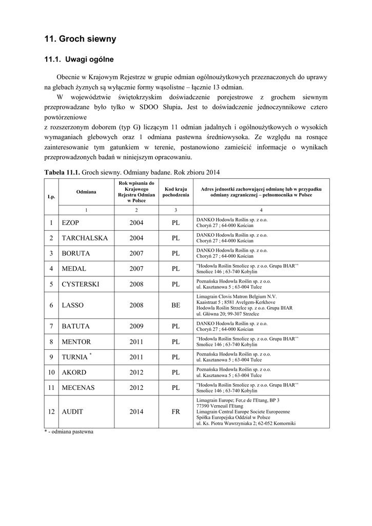 11. Groch siewny 11.1. Uwagi ogólne Obecnie w Krajowym Rejestrze w grupie odmian ogólnoużytkowych przeznaczonych do uprawy na glebach żyznych są wyłącznie formy wąsolistne – łącznie 13 odmian. W województwie świętokrzyskim doświadczenie porejestrowe z grochem siewnym przeprowadzane było tylko w SDOO Słupia. Jest to doświadczenie jednoczynnikowe cztero powtórzeniowe z rozszerzonym doborem (typ G) liczącym 11 odmian jadalnych i ogólnoużytkowych o wysokich wymaganiach glebowych oraz 1 odmiana pastewna średniowysoka. Ze względu na rosnące zainteresowanie tym gatunkiem w terenie, postanowiono zamieścić informacje o wynikach przeprowadzonych badań w niniejszym opracowaniu. Tabela 11.1. Groch siewny. Odmiany badane. Rok zbioru 2014 Odmiana Rok wpisania do Krajowego Rejestru Odmian w Polsce Kod kraju pochodzenia Adres jednostki zachowującej odmianę lub w przypadku odmiany zagranicznej – pełnomocnika w Polsce 1 2 3 4 Lp. 1 EZOP 2004 PL DANKO Hodowla Roślin sp. z o.o. Choryń 27 ; 64-000 Kościan 2 TARCHALSKA 2004 PL DANKO Hodowla Roślin sp. z o.o. Choryń 27 ; 64-000 Kościan 3 BORUTA 2007 PL DANKO Hodowla Roślin sp. z o.o. Choryń 27 ; 64-000 Kościan 4 MEDAL 2007 PL ”Hodowla Roślin Smolice sp. z o.o. Grupa IHAR’’ Smolice 146 ; 63-740 Kobylin 5 CYSTERSKI 2008 PL Poznańska Hodowla Roślin sp. z o.o. ul. Kasztanowa 5 ; 63-004 Tulce 6 LASSO 2008 BE Limagrain Clovis Matron Belgium N.V. Kaaistraat 5 ; 8581 Avelgem-Kerkhove Hodowla Roślin Strzelce sp. z o.o. Grupa IHAR ul. Główna 20; 99-307 Strzelce 7 BATUTA 2009 PL DANKO Hodowla Roślin sp. z o.o. Choryń 27 ; 64-000 Kościan 8 MENTOR 2011 PL ”Hodowla Roślin Smolice sp. z o.o. Grupa IHAR’’ Smolice 146 ; 63-740 Kobylin 9 TURNIA * 2011 PL Poznańska Hodowla Roślin sp. z o.o. ul. Kasztanowa 5 ; 63-004 Tulce 10 AKORD 2012 PL Poznańska Hodowla Roślin sp. z o.o. ul. Kasztanowa 5 ; 63-004 Tulce 11 MECENAS 2012 PL ”Hodowla Roślin Smolice sp. z o.o. Grupa IHAR’’ Smolice 146 ; 63-740 Kobylin FR Limagrain Europe; Fer,e de I'Etang, BP 3 77390 Verneuil I'Etang Limagrain Central Europe Societe Europeenne Spółka Europejska Oddział w Polsce ul. Ks. Piotra Wawrzyniaka 2; 62-052 Komorniki 12 AUDIT * - odmiana pastewna 2014 Tabela 11.2. Groch siewny. Warunki polowe doświadczeń. Rok zbioru 2014 Punkt doświadczalny SDOO Słupia Jędrzejów Powiat Kompleks rolniczej przydatności gleby Pszenny dobry Klasa bonitacyjna gleby III a pH gleby w KCl 5,7 Przedplon Pszenica ozima Data siewu 21.03.2014 Obsada nasion (szt/m2) 110 Data zbioru 30.07.2014 Nawożenie mineralne - kg/ha N (kg/ha) 33 P2O5 (kg/ha) 40 K2O (kg/ha) 60 Nawożenie dolistne preparatami wieloskładnikowymi (na ha) Solubor + Basfoliar 6-12-6 - 3kg+8l Środki ochrony roślin Zaprawa nasienna (g/100 kg nasion) Dithane Neo Tec 75 WG -200 Herbicyd (l/ha) Afalon Dyspersyjny 450 SC – 1 Command 480 EC – 0,15 Insektycyd (l/ha) Karate Zeon 050 SC – 0,1 Insektycyd (l/ha) Decis Mega 50 EW – 0,15 (dwa opryski) Insektycyd (l/ha) Fastac 100 EC – 0,12 Insektycyd (l/ha) Proteus 110 OD – 0,7 Tabela 11.3. Groch siewny. Plon ziarna odmian (%wzorca). Rok zbioru 2014 Lp. Odmiana Wzorzec dt z ha SDOO Słupia 75,2 1 EZOP 102 2 TARCHALSKA 106 3 BORUTA 111 4 MEDAL 87 5 CYSTERSKI 89 6 LASSO 98 7 BATUTA 108 8 MENTOR 98 9 TURNIA * 80 10 AKORD 96 11 MECENAS 109 12 AUDIT 116 Wzorzec 2014 – wszystkie badane odmiany * - odmiana pastewna