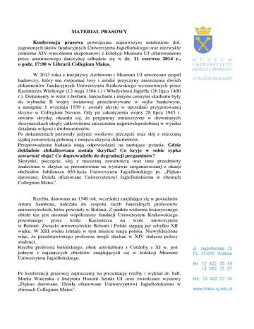 MATERIAŁ PRASOWY Konferencja prasowa poświęcona najnowszym ustaleniom dot. zaginionych aktów fundacyjnych Uniwersytetu Jagiellońskiego oraz niezwykle cennemu XIV-wiecznemu eksponatowi z kolekcji Muzeum UJ ofiarowanemu przez anonimowego darczyńcę odbędzie się w dn. 11 czerwca 2014 r., o godz. 17:00 w Librarii Collegium Maius. W 2013 roku z inicjatywy Archiwum i Muzeum UJ utworzono zespół badawczy, który ma rozpoznać losy i ustalić przyczyny zniszczenia dwóch dokumentów fundacyjnych Uniwersytetu Krakowskiego wystawionych przez Kazimierza Wielkiego (12 maja 1364 r.) i Władysława Jagiełłę (26 lipca 1400 r.). Dokumenty te wraz z berłami, łańcuchami i innymi cennymi skarbami były do wybuchu II wojny światowej przechowywane w sejfie bankowym, a następnie 1 września 1939 r. zostały ukryte w uprzednio przygotowanej skrytce w Collegium Novum. Gdy po zakończeniu wojny 28 lipca 1945 r. otwarto skrytkę, okazało się, że pergaminy umieszczone w drewnianych skrzyneczkach uległy całkowitemu zniszczeniu najprawdopodobniej w wyniku działania wilgoci i drobnoustrojów. Po dokumentach pozostały jedynie woskowe pieczęcie oraz słój z mieszaną sypką zawartością pobraną z miejsca ukrycia dokumentów. Przeprowadzone badania mają odpowiedzieć na nurtujące pytania: Gdzie dokładnie zlokalizowana została skrytka? Co kryje w sobie sypka zawartość słoja? Co doprowadziło do degradacji pergaminów? Skrzynki, pieczęcie, słój z mieszaną zawartością oraz inne przedmioty znalezione w skrytce są prezentowane na wystawie zorganizowanej z okazji obchodów Jubileuszu 650-lecia Uniwersytetu Jagiellońskiego pt. „Piękno darowane. Dzieła ofiarowane Uniwersytetowi Jagiellońskiemu w zbiorach Collegium Maius”. Rzeźba, datowana na 1340 rok, wcześniej znajdująca się w posiadaniu Artura Sambona, należała do zespołu rzeźb funeralnych profesorów uniwersyteckich, które powstały w Bolonii. Z punktu widzenia historycznego obiekt ten jest nieomal współczesny fundacji Uniwersytetu Krakowskiego powołanego przez króla Kazimierza na wzór uniwersytetu w Bolonii. Związki uniwersyteckie Bolonii i Polski sięgają już schyłku XII wieku. W XIII wieku istniała w tym mieście nacja polska. Niewykluczone więc, że przedstawionego profesora mogli słuchać w XIV stuleciu polscy studenci. Rzeźba profesora bolońskiego, obok astrolabium z Cordoby z XI w. jest jednym z najstarszych obiektów znajdujących się w kolekcji Muzeum Uniwersytetu Jagiellońskiego. Po konferencji prasowej zapraszamy na prezentację rzeźby i wykład dr. hab. Marka Walczaka z Instytutu Historii Sztuki UJ oraz zwiedzanie wystawy „Piękno darowane. Dzieła ofiarowane Uniwersytetowi Jagiellońskiemu w zbiorach Collegium Maius”.