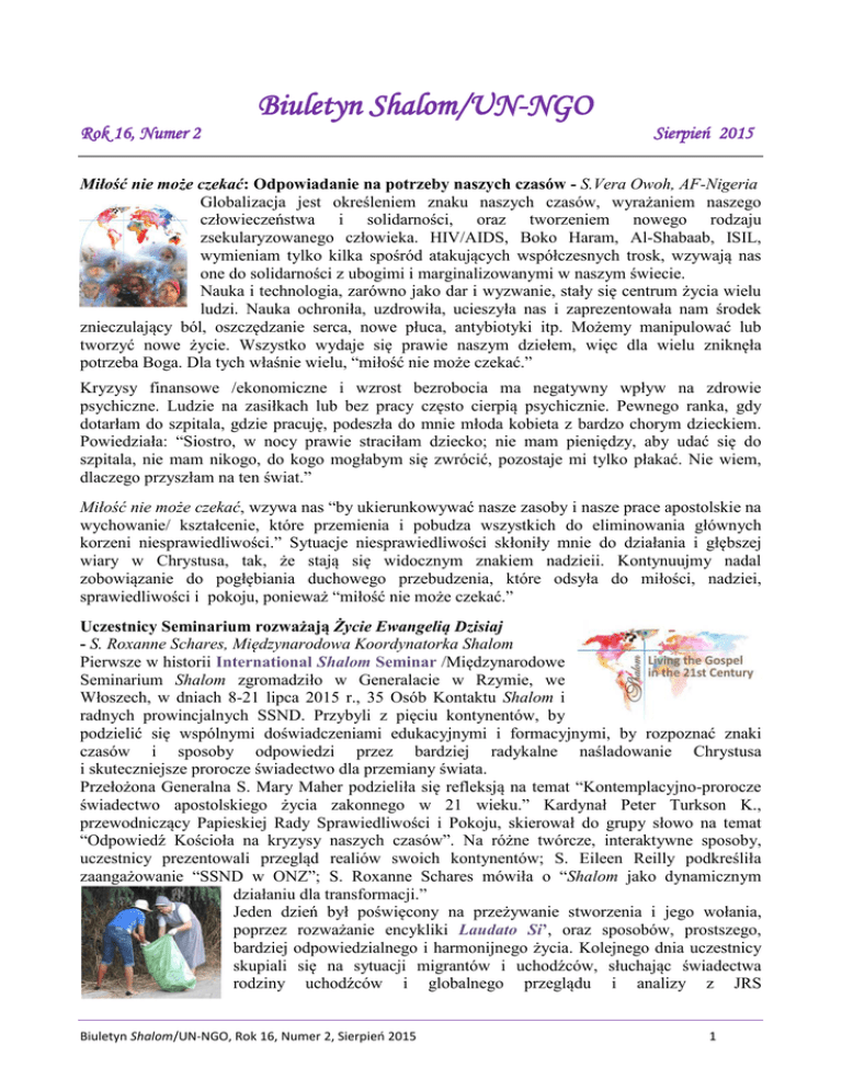 Biuletyn Shalom/UN-NGO Rok 16, Numer 2 Sierpień 2015 Miłość nie może czekać: Odpowiadanie na potrzeby naszych czasów - S.Vera Owoh, AF-Nigeria Globalizacja jest określeniem znaku naszych czasów, wyrażaniem naszego człowieczeństwa i solidarności, oraz tworzeniem nowego rodzaju zsekularyzowanego człowieka. HIV/AIDS, Boko Haram, Al-Shabaab, ISIL, wymieniam tylko kilka spośród atakujących współczesnych trosk, wzywają nas one do solidarności z ubogimi i marginalizowanymi w naszym świecie. Nauka i technologia, zarówno jako dar i wyzwanie, stały się centrum życia wielu ludzi. Nauka ochroniła, uzdrowiła, ucieszyła nas i zaprezentowała nam środek znieczulający ból, oszczędzanie serca, nowe płuca, antybiotyki itp. Możemy manipulować lub tworzyć nowe życie. Wszystko wydaje się prawie naszym dziełem, więc dla wielu zniknęła potrzeba Boga. Dla tych właśnie wielu, “miłość nie może czekać.” Kryzysy finansowe /ekonomiczne i wzrost bezrobocia ma negatywny wpływ na zdrowie psychiczne. Ludzie na zasiłkach lub bez pracy często cierpią psychicznie. Pewnego ranka, gdy dotarłam do szpitala, gdzie pracuję, podeszła do mnie młoda kobieta z bardzo chorym dzieckiem. Powiedziała: “Siostro, w nocy prawie straciłam dziecko; nie mam pieniędzy, aby udać się do szpitala, nie mam nikogo, do kogo mogłabym się zwrócić, pozostaje mi tylko płakać. Nie wiem, dlaczego przyszłam na ten świat.” Miłość nie może czekać, wzywa nas “by ukierunkowywać nasze zasoby i nasze prace apostolskie na wychowanie/ kształcenie, które przemienia i pobudza wszystkich do eliminowania głównych korzeni niesprawiedliwości.” Sytuacje niesprawiedliwości skłoniły mnie do działania i głębszej wiary w Chrystusa, tak, że stają się widocznym znakiem nadzieii. Kontynuujmy nadal zobowiązanie do pogłębiania duchowego przebudzenia, które odsyła do miłości, nadziei, sprawiedliwości i pokoju, ponieważ “miłość nie może czekać.” Uczestnicy Seminarium rozważają Życie Ewangelią Dzisiaj - S. Roxanne Schares, Międzynarodowa Koordynatorka Shalom Pierwsze w historii International Shalom Seminar /Międzynarodowe Seminarium Shalom zgromadziło w Generalacie w Rzymie, we Włoszech, w dniach 8-21 lipca 2015 r., 35 Osób Kontaktu Shalom i radnych prowincjalnych SSND. Przybyli z pięciu kontynentów, by podzielić się wspólnymi doświadczeniami edukacyjnymi i formacyjnymi, by rozpoznać znaki czasów i sposoby odpowiedzi przez bardziej radykalne naśladowanie Chrystusa i skuteczniejsze prorocze świadectwo dla przemiany świata. Przełożona Generalna S. Mary Maher podzieliła się refleksją na temat “Kontemplacyjno-prorocze świadectwo apostolskiego życia zakonnego w 21 wieku.” Kardynał Peter Turkson K., przewodniczący Papieskiej Rady Sprawiedliwości i Pokoju, skierował do grupy słowo na temat “Odpowiedź Kościoła na kryzysy naszych czasów”. Na różne twórcze, interaktywne sposoby, uczestnicy prezentowali przegląd realiów swoich kontynentów; S. Eileen Reilly podkreśliła zaangażowanie “SSND w ONZ”; S. Roxanne Schares mówiła o “Shalom jako dynamicznym działaniu dla transformacji.” Jeden dzień był poświęcony na przeżywanie stworzenia i jego wołania, poprzez rozważanie encykliki Laudato Si’, oraz sposobów, prostszego, bardziej odpowiedzialnego i harmonijnego życia. Kolejnego dnia uczestnicy skupiali się na sytuacji migrantów i uchodźców, słuchając świadectwa rodziny uchodźców i globalnego przeglądu i analizy z JRS Biuletyn Shalom/UN-NGO, Rok 16, Numer 2, Sierpień 2015 1 Międzynarodowego Koordynatora Ochrony, Pani Amaya Valcarcel. Aby zintegrować doświadczenia i pogłębić duchowość dla sprawiedliwości, pokoju i harmonii, uczestnicy odbyli pielgrzymkę Shalom do Asyżu, by uczyć się od mistyka i pielgrzyma, świętego Franciszka z Asyżu, który nadał kształt dla integralnej ekologii, miłosierdzia i sprawiedliwości dla bezbronnych, dla pokoju i zaangażowania na rzecz społeczeństwa. Kolejne dni były przeplatane wspólną kontemplacją, celebrowaniem Eucharystii, osobistą i grupową refleksją, interakcją z prezenterami, dialogiem i rozeznawaniem przyszłego kierunku i działania poprzez Shalom, żyjąc Ewangelią w 21. wieku, z odwagą i nadzieją. Doświadczenie Błogosławieństwa – S. Roxanne Schares i S. Kathy Schmittgens, odchodząca i przychodząca Międzynarodowa Koordynatorka Shalom Wdzięczność wypełnia moje serce za niezliczone błogosławieństwa, które otrzymałam w ciągu ostatnich ośmiu lat, podczas służby w zgromadzeniu jako Międzynarodowa Koordynatorka Shalom. Doświadczenia w kontaktach z członkami Shalom we wszystkich częściach świata ubogaciły mnie. Głębokie podziały i wielkie cierpienie dotknęły i stawiały wymagania w poszukiwaniu sensownej odpowiedzi. Zaangażowanie i współpraca z wieloma, dla przekształcenia świata, zachęciły mnie. Z wdzięcznym i pełnym nadziei sercem witam S. Kathy Schmittgens (CP). Chciałabym się wam wszystkim przedstawić. Pochodzę z St. Louis. Zanim usłyszałam wezwanie do pracy w Afryce, uczyłam przez kilka lat nauk przyrodniczych i matematyki, W 1988 roku pojechałam do Sierra Leone i uczyłam tam także nauk przyrodniczych i matematyki. Mieszkałam w okolicy kopalni diamentów w Sierra Leone, gdy wybuchła wojna domowa. Życie w strefie wojny, jako osoba przesiedlona, było doświadczeniem zmieniającym życie. Po powrocie do Stanów, pracowałam w diecezji San Diego jako wychowawca misji dla Misyjnego Dzieciństwa. W tym czasie miałam okazję odwiedzić Haiti, Salwador (w 20. rocznicę śmierci Romero) i Kenię. Żyliśmy na największym przejściu granicznym w Stanach Zjednoczonych i rozpoczęliśmy program o nazwie Iglesia Sin Fronteras (Kościół bez Granic). Przez osiem lat służyłam w radzie prowincjalnej w St. Louis. Podczas mojej pracy w radzie, udało mi się odwiedzić nasze siostry ży