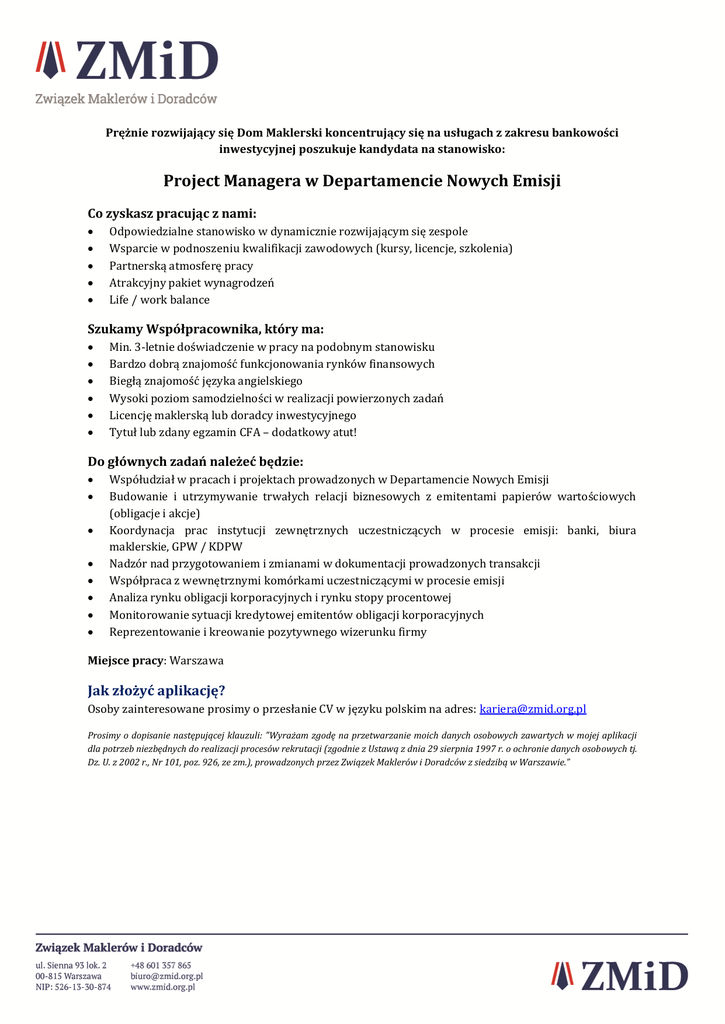Prężnie rozwijający się Dom Maklerski koncentrujący się na usługach z zakresu bankowości inwestycyjnej poszukuje kandydata na stanowisko: Project Managera w Departamencie Nowych Emisji Co zyskasz pracując z nami: Odpowiedzialne stanowisko w dynamicznie rozwijającym się zespole Wsparcie w podnoszeniu kwalifikacji zawodowych (kursy, licencje, szkolenia) Partnerską atmosferę pracy Atrakcyjny pakiet wynagrodzeń Life / work balance Szukamy Współpracownika, który ma: Min. 3-letnie doświadczenie w pracy na podobnym stanowisku Bardzo dobrą znajomość funkcjonowania rynków finansowych Biegłą znajomość języka angielskiego Wysoki poziom samodzielności w realizacji powierzonych zadań Licencję maklerską lub doradcy inwestycyjnego Tytuł lub zdany egzamin CFA – dodatkowy atut! Do głównych zadań należeć będzie: Współudział w pracach i projektach prowadzonych w Departamencie Nowych Emisji Budowanie i utrzymywanie trwałych relacji biznesowych z emitentami papierów wartościowych (obligacje i akcje) Koordynacja prac instytucji zewnętrznych uczestniczących w procesie emisji: banki, biura maklerskie, GPW / KDPW Nadzór nad przygotowaniem i zmianami w dokumentacji prowadzonych transakcji Współpraca z wewnętrznymi komórkami uczestniczącymi w procesie emisji Analiza rynku obligacji korporacyjnych i rynku stopy procentowej Monitorowanie sytuacji kredytowej emitentów obligacji korporacyjnych Reprezentowanie i kreowanie pozytywnego wizerunku firmy Miejsce pracy: Warszawa Jak złożyć aplikację? Osoby zainteresowane prosimy o przesłanie CV w języku polskim na adres: [email protected] Prosimy o dopisanie następującej klauzuli: "Wyrażam zgodę na przetwarzanie moich danych osobowych zawartych w mojej aplikacji dla potrzeb niezbędnych do realizacji procesów rekrutacji (zgodnie z Ustawą z dnia 29 sierpnia 1997 r. o ochronie danych osobowych tj. Dz. U. z 2002 r., Nr 101, poz. 926, ze zm.), prowadzonych przez Związek Maklerów i Doradców z siedzibą w Warszawie.”
