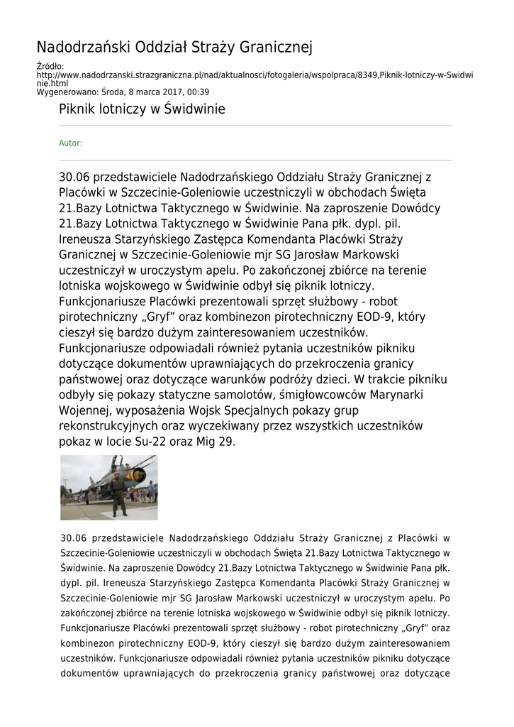 Nadodrzański Oddział Straży Granicznej Źródło: http://www.nadodrzanski.strazgraniczna.pl/nad/aktualnosci/fotogaleria/wspolpraca/8349,Piknik-lotniczy-w-Swidwi nie.html Wygenerowano: Środa, 8 marca 2017, 00:39 Piknik lotniczy w Świdwinie Autor: 30.06 przedstawiciele Nadodrzańskiego Oddziału Straży Granicznej z Placówki w Szczecinie-Goleniowie uczestniczyli w obchodach Święta 21.Bazy Lotnictwa Taktycznego w Świdwinie. Na zaproszenie Dowódcy 21.Bazy Lotnictwa Taktycznego w Świdwinie Pana płk. dypl. pil. Ireneusza Starzyńskiego Zastępca Komendanta Placówki Straży Granicznej w Szczecinie-Goleniowie mjr SG Jarosław Markowski uczestniczył w uroczystym apelu. Po zakończonej zbiórce na terenie lotniska wojskowego w Świdwinie odbył się piknik lotniczy. Funkcjonariusze Placówki prezentowali sprzęt służbowy - robot pirotechniczny „Gryf” oraz kombinezon pirotechniczny EOD-9, który cieszył się bardzo dużym zainteresowaniem uczestników. Funkcjonariusze odpowiadali również pytania uczestników pikniku dotyczące dokumentów uprawniających do przekroczenia granicy państwowej oraz dotyczące warunków podróży dzieci. W trakcie pikniku odbyły się pokazy statyczne samolotów, śmigłowcowców Marynarki Wojennej, wyposażenia Wojsk Specjalnych pokazy grup rekonstrukcyjnych oraz wyczekiwany przez wszystkich uczestników pokaz w locie Su-22 oraz Mig 29. 30.06 przedstawiciele Nadodrzańskiego Oddziału Straży Granicznej z Placówki w Szczecinie-Goleniowie uczestniczyli w obchodach Święta 21.Bazy Lotnictwa Taktycznego w Świdwinie. Na zaproszenie Dowódcy 21.Bazy Lotnictwa Taktycznego w Świdwinie Pana płk. dypl. pil. Ireneusza Starzyńskiego Zastępca Komendanta Placówki Straży Granicznej w Szczecinie-Goleniowie mjr SG Jarosław Markowski uczestniczył w uroczystym apelu. Po zakończonej zbiórce na terenie lotniska wojskowego w Świdwinie odbył się piknik lotniczy. Funkcjonariusze Placówki prezentowali sprzęt służbowy - robot pirotechniczny „Gryf” oraz kombinezon pirotechniczny EOD-9, który cieszył się bardzo dużym zainteresowaniem uczestników. Funkcjonariusze odpowiadali również pytania uczestników pikniku dotyczące dokumentów uprawniających do przekroczenia granicy państwowej oraz dotyczące warunków podróży dzieci. W trakcie pikniku odbyły się pokazy statyczne samolotów, śmigłowcowców Marynarki Wojennej, wyposażenia Wojsk Specjalnych pokazy grup rekonstrukcyjnych oraz wyczekiwany przez wszystkich uczestników pokaz w locie Su-22 oraz Mig 29.