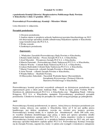 Protokół Nr 11/2011 z posiedzenia Komisji Zdrowia i Bezpieczeństwa Publicznego Rady Powiatu w Kluczborku w dniu 13 grudnia 2011 r. Przewodniczył Przewodniczący Komisji - Mirosław Misiak Lista obecności w załączeniu. Porządek posiedzenia: 1.Otwarcie posiedzenia. 2.Analiza zapisu w projekcie uchwały budżetowej powiatu kluczborskiego na 2012 rok dotyczącego sprzedaży działki zabudowanej budynkiem szpitala w Kluczborku i jego konsekwencje dla PCZ S.A. 3.Wolne wnioski. 4.Zamknięcie posiedzenia. Zaproszeni : 1. Władysław Zawadzki-Przewodniczący Rady Powiatu w Kluczborku, 2.Renata Jażdż-Zaleska – Prezes Zarządu PCZ S.A. w Kluczborku, 3.Józef Maciołek – Wiceprezes Zarządu PCZ S.A. w Kluczborku, 4.Marcin Pasternak - Przewodniczący Rady Nadzorczej PCZ S.A. w Kluczborku, 5.Marcin Wiecha – Członek Rady Nadzorczej PCZ S.A. w Kluczborku, 6.Łukasz Radwański-Członek Rady Nadzorczej PCZ S.A. w Kluczborku, 7.Maciej Tomaszczyk- członek Zarządu Powiatu w Kluczborku, 8.Artur Nowak – członek Zarządu Powiatu w Kluczborku, 9.Wanda Słabosz – Skarbnik Powiatu, 10.Mieczysław Zaleciński - Naczelnik Wydziału Spraw Obywatelskich, Zarządzania Kryzysowego i Promocji Zdrowia Starostwa Powiatowego w Kluczborku, Ad.1 Przewodniczący komisji przywitał wszystkich zebranych na dzisiejszym posiedzeniu oraz zaproszonych gości a także pana Andrzeja Bułę – Posła na Sejm, panie Violettę Wilk – Dyrektora ds. administracyjnych PCZ S.A. w Kluczborku oraz Magdalenę Panek - Główną Księgową PCZ S.A. w Kluczborku, następnie Przewodniczący przedstawił porządek posiedzenia. Członkowie komisji do porządku nie wnieśli uwag przyjmując go jednogłośnie. Ad.2 Przewodniczący Komisji poinformował, że sprawa , której dotyczy dzisiejsze posiedzenie jest bardzo ważna, dotyczy ona szpitala w Kluczborku, który od 8 lat jest spółka prawa handlowego, jest dobrze zarządzany, rozwija się, również przy pomocy powiatu. Przewodniczący komisji dodał, że w szpitalu jest zatrudnionych około 200 osób, oraz, że wszelkie działania destabilizujące jego pracę, a takim jest sprawa sprzedaży działki zabudowanej budynkiem szpitala spółce PCZ S.A. , budzą niepokój i trzeba to wyjaśnić. Przewodniczący komisji stwierdził, że w projekcie budżetu powiatu na 2012 rok, jest zapis dotyczący sprzedaż budynków szpitala spółce PCZ S.A. Przewodniczący Komisji zwracając się do Zarządu Powiatu, zapytał, kto, kiedy i w jakim celu wystąpił z wnioskiem o zakupienie przez PCZ S.A budynku pediatryczno-laryngologicznego oraz czy ten wniosek jest nadal aktualny, kolejno czy wniosek oparty był o solidną analizę finansową opartą nie tylko o dane historyczne ale również opartą na danych prognozowanych, uwzględniających ceny leków, przystosowanie spółki do wymogów stawianych budynkom szpitalnym od 2016 roku, kosztów zakupu sprzętu medycznego a także podwyżek dla personelu dawno zapowiedzianych i oczekiwanych. Przewodniczący komisji zapytał, czy uwzględniono, że budynek laryngologii, pediatrii i administracji szpitala od 2016 r. nie będzie spełniał wymogów dostosowawczych do prowadzenia tam oddziałów, budynek trzeba wybudować nowy, gdyż w przeciwnym razie grozi likwidacja dwóch oddziałów: laryngologii i pediatrii, które się tam znajdują. Przewodniczący komisji dodał, że planowany zakup przez spółkę budynku laryngologiczno-pediatrycznego w oparciu o zaciągnięty kredyt, budzi wątpliwości co do intencji, gdyż spółka nie ma takich pieniędzy, oraz, że może dojść do działań, które będą szkodzić PCZ. S.A . Przewodniczący komisji zapytał, czy zrobiono nową analizę oraz czy zarząd spółki PCZ S.A. dalej tkwi przy stanowisku zakupu budynku. Przewodniczący komisji dodał, że budynki spółki w razie utraty płynności finansowej przez spółkę będą warte tyle, ile ktoś za nie da. Głos zabrała pani Renata Jażdż-Zaleska – Prezes Zarządu PCZ S.A. w Kluczborku, która stwierdziła, że temat ten jest bardzo trudny i przedstawiła kondycję kluczborskiego szpitala, z której wynika, że jest ona dobra i szpital się rozwija. Pani Renata Jażdż-Zaleska stwierdziła, że w 2005 roku spółka zakupiła od powiatu kluczborskiego budynek za kwotę 1 mln. zł. bez zaciągania kredytu, i spłaciła go w 2 ratach, obecnie spółka spłaca dwa zaciągnięte kredyty, jeden na 300 tys. zł, drugi zaciągnięty w FOŚ , którego pozostało do spłaty jeszcze 150 tys. zł., i który został zaciągnięty na ZOL. Pani Renata JażdżZaleska poinformowała, że w dniu 5 grudnia 2011 zarząd spółki zwrócił się do rady nadzorczej o wyrażenie zgody na zakup nieruchomości nie przygotowując dokładnej analizy finansowej na czas finansowania tej inwestycji o wartości 2,5 mln., na okres 10 lat. Cały koszt to około 3 mln. 350 tys. zł. Pani Prezes stwierdziła, że po dokonaniu dokładnej analizy przez księgową PCZ S.A , oraz dodatkowej analizy przez analityka finansowego panią Ilonę Mróz, zarząd spółki stwierdził, że wycofuje się z podjętych wcześniej ustaleń, czyli z zakupu działki zabudowanej budynkiem szpitala. Głos zabrała pani Magdalena Panek - Główna Księgowa PCZ S.A. w Kluczborku, która w skrócie przedstawiła powyższą analizę. Pani Magdalena Panek stwierdziła, że do analizy zrobionej na okres 10 lat przyjęto następujące składniki: kontrakt z NFZ, który jest podpisany przez spółkę na okres 2011-2013, kolejno dalsze finansowanie usług medycznych w ramach ubezpieczenia zdrowotnego uzależnione jest od wygrania konkursu i podpisania umowy, szacunkowy wzrost cen w latach 2012-2021, usług, mediów na poziomie 2-5%, uwzględniono podniesienie płacy minimalnej, podwyżkę o 100 zł w płacy zasadniczej dla pielęgniarek, niższego i średniego szczebla, wzrost składki rentowej, założono, że składki ZUS przez cały okres finansowania kredytu nie ulegną zmianie, wzrost przychodów na