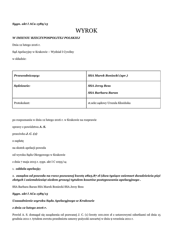 Sygn. akt I ACa 1589/15 WYROK W IMIENIU RZECZYPOSPOLITEJ POLSKIEJ Dnia 12 lutego 2016 r. Sąd Apelacyjny w Krakowie – Wydział I Cywilny w składzie: Przewodniczący: SSA Marek Boniecki (spr.) Sędziowie: SSA Jerzy Bess SSA Barbara Baran Protokolant: st.sekr.sądowy Urszula Kłosińska po rozpoznaniu w dniu 12 lutego 2016 r. w Krakowie na rozprawie sprawy z powództwa A. S. przeciwko J. C. (1) o zapłatę na skutek apelacji powoda od wyroku Sądu Okręgowego w Krakowie z dnia 7 maja 2015 r. sygn. akt I C 1093/14 1. oddala apelację; 2. zasądza od powoda na rzecz pozwanej kwotę 2825,87 zł (dwa tysiące osiemset dwadzieścia pięć złotych i osiemdziesiąt siedem groszy) tytułem kosztów postępowania apelacyjnego . SSA Barbara Baran SSA Marek Boniecki SSA Jerzy Bess Sygn. akt I ACa 1589/15 Uzasadnienie wyroku Sądu Apelacyjnego w Krakowie z dnia 12 lutego 2016 r. Powód A. S. domagał się zasądzenia od pozwanej J. C. (1) kwoty 100.000 zł z ustawowymi odsetkami od dnia 15 grudnia 2011 r. tytułem zwrotu przedmiotu umowy pożyczki zawartej w dniu 9 września 2011 r. Pozwana wniosła o oddalenie powództwa, kwestionując prawdziwość przedłożonej kopii umowy pożyczki i wskazując, że na jej rachunek bankowy została przekazana przez powoda kwota 100.000 zł, ale w wykonaniu umowy pożyczki zawartej między powodem a Handel (...) J. D., (...) spółką jawną z siedzibą w S.. Wyrokiem z dnia 7 maja 2015 r. Sąd Okręgowy w Krakowie oddalił powództwo i zasądził od powoda na rzecz pozwanej koszty procesu. Sąd pierwszej instancji ustalił, że pozwana wraz synem J. D. prowadziła działalność gospodarczą w (...) spółki Handel (...) J. D., (...) Spółka jawna z siedzibą w S., zajmującej się m.in. sprzedażą obuwia. Następcą prawnym tej spółki jest (...) spółka z ograniczoną odpowiedzialnością spółka komandytowa z siedzibą w S.. W związku z trudną sytuacją finansową, w jakiej znalazła się spółka Handel (...) J. D., J. C. (1) Sp. j., w szczególności brakiem środków na spłatę przez Spółkę zobowiązań oraz na zakup środków produkcji, jej wspólnicy rozpoczęli poszukiwania stosownych źródeł finansowania prowadzonej działalności. W tym celu pozwana nawiązała kontakt z powodem, który zaoferował ze swej strony udzielenie Spółce określonej zwrotnej pomocy pieniężnej, licząc w przyszłości na zysk. Ostatecznie w ramach podjętej współpracy strony zdecydowały się zawiązać z udziałem jeszcze jednej osoby (L. H.) – spółkę (...) (...)Sp. j. z siedzibą w B., która miała zajmować się produkcją i handlem obuwiem ochronnym. W ramach podjętej przez strony współpracy powód, znając złą kondycję Spółki, zawarł z pozwaną w dniu 9 września 2011 r. w B. umowę pisemną, na mocy której udzielił jej pożyczki w kwocie 100.000 zł. Zgodnie z umową pożyczkodawca miał przekazać tę kwotę przelewem na rachunek bankowy pozwanej i tak też się stało. Zgodnym zamiarem stron było jednak, aby przekazana przez powoda kwota została wykorzystana przez Spółkę na cele związane z prowadzoną działalnością gospodarczą, tj. m.in. na uregulowanie bieżących zobowiązań, zakup surowców i towarów itp. Fakt dokonania przelewu środków pieniężnych nie na konto Spółki, lecz pozwanej wynikał z tego, iż przeciwko Spółce – w związku z jej problemami – toczyły się postępowania egzekucyjne, w ramach których doszło w szczególności do zajęcia jej rachunków bankowych na spłatę zobowiązań wobec m.in. (...) W umowie pozwana zobowiązała się zwrócić powodowi kwotę pożyczki w terminie do dnia 15 października 2011 r. z możliwością przedłużenia o 15 dni: gotówką do rąk pożyczkodawcy lub przelewem na jego rachunek bankowy. Oprocentowanie pożyczki strony określiły w wysokości 12% w skali roku. Jako zabezpieczenie pożyczki wskazano samochód osobowy marki V. (nr rej. (...)) i samochód marki M. (...) (nr rej. (...)). W momencie zawierania umowy samochód V. stanowił własność Spółki, zaś sam powód – od sierpnia 2011 r. – był już właścicielem w 50% samochodu M. (...), który to udział nabył wcześniej od Spółki. W związku z uzyskaną od Urzędu Skarbowego informacją i po konsultacji z prawnikami, pozwana i jej syn wyjaśnili powodowi, iż przelanie kwoty 100.000 zł – tytułem pożyczki na działalność Spółki – na konto osoby prywatnej jest prawnie niedopuszczalne, w związku z czym zachodzi konieczność zniszczenia oryginałów umowy pomiędzy powodem a pozwaną i zawarcia prawidłowej umowy pożyczki pomiędzy powodem a Spółką. Realizując powyższe, pozwana – w obecności powoda – swój egzemplarz umowy potargała, pozostając jednocześnie w przekonaniu, iż to samo uczynił również powód. W tej sytuacji doszło do podpisania przez powoda oraz pozwaną i jej syna J. D. – jako wspólników (...) Sp. j. – nowej umowy opatrzonej datą 9 września 2011 r., której przedmiotem było udzielenie pożyczki 100.000 zł już wcześniej przelanej na rachunek pozwanej. Zgodnie z brzmieniem tej nowej umowy (§2) pożyczkodawca zobowiązał się przekazać ww. kwotę bądź na rachunek pożyczkobiorcy bądź gotówką do jego rąk, zaś pożyczkobiorca (§3) zobowiązał się zwrócić kwotę pożyczki w terminie do dnia 30 czerwca 2012 r. Zabezpieczeniem spłaty pożyczki miały być dwa weksle po 50.000 zł na łączną wartość 100.000 zł wraz z deklaracjami wekslowymi. Jednocześnie pomiędzy powodem a Spółką zostało zawarte porozumienie wekslowe, w którym wystawcy weksli zobowiązali się do ich wykupu w terminie do dnia 30 czerwca 2012 r. W dniu 17 stycznia 2012 r. pozwana występując jako wspólniczka Spółki, wpłaciła powodowi kwotę 3.000 zł tytułem uregulowania odsetek od umowy pożyczki z dnia 9 września 2011 r., na okoliczność czego sporządziła stosowne pisemne potwierdzenie wpłaty opatrzone podpisem jej i powoda. Późn