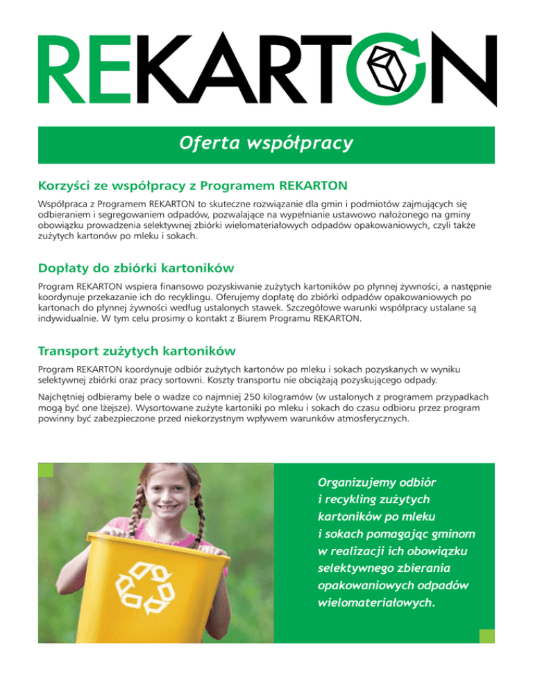 Oferta współpracy Oferta współpracy Korzyści ze współpracy z Programem REKARTON Współpraca z Programem REKARTON to skuteczne rozwiązanie dla gmin i podmiotów zajmujących się odbieraniem i segregowaniem odpadów, pozwalające na wypełnianie ustawowo nałożonego na gminy obowiązku prowadzenia selektywnej zbiórki wielomateriałowych odpadów opakowaniowych, czyli także zużytych kartonów po mleku i sokach. Dopłaty do zbiórki kartoników Program REKARTON wspiera finansowo pozyskiwanie zużytych kartoników po płynnej żywności, a następnie koordynuje przekazanie ich do recyklingu. Oferujemy dopłatę do zbiórki odpadów opakowaniowych po kartonach do płynnej żywności według ustalonych stawek. Szczegółowe warunki współpracy ustalane są indywidualnie. W tym celu prosimy o kontakt z Biurem Programu REKARTON. Transport zużytych kartoników Program REKARTON koordynuje odbiór zużytych kartonów po mleku i sokach pozyskanych w wyniku selektywnej zbiórki oraz pracy sortowni. Koszty transportu nie obciążają pozyskującego odpady. Najchętniej odbieramy bele o wadze co najmniej 250 kilogramów (w ustalonych z programem przypadkach mogą być one lżejsze). Wysortowane zużyte kartoniki po mleku i sokach do czasu odbioru przez program powinny być zabezpieczone przed niekorzystnym wpływem warunków atmosferycznych. Organizujemy odbiór i recykling zużytych kartoników po mleku i sokach pomagając gminom w realizacji ich obowiązku selektywnego zbierania opakowaniowych odpadów wielomateriałowych. Oferta współpracy Oferta współpracy Ustawa o utrzymaniu czystości i porządku w gminach O Programie REKARTON 1 stycznia 2012 roku weszły w życie zmiany do ustawy o utrzymaniu czystości i porządku w gminach, zgodnie z którymi to gminy odpowiadają za gospodarowanie odpadami komunalnymi z zamieszkałych nieruchomości znajdujących się na ich terenie i tworzą warunki niezbędne do ich utrzymania, a w szczególności: Program REKARTON to nowatorska i w pełni dobrowolna inicjatywa przemysłu sokowego, mleczarskiego i opakowaniowego aktywnie wspierająca zbieranie i recykling zużytych kartoników po mleku i sokach w Polsce. Jest on odpowiedzią przemysłu na zaistniałą sytuację związaną z brakiem recyklingu zużytych kartonowych opakowań do płynnej żywności w latach 2005-2007, wynikającą ze zmiany prawa. • Ustanawiają selektywne zbieranie odpadów: papieru, metali, tworzywa sztucznego, szkła, opakowań wielomateriałowych oraz odpadów komunalnych ulegających biodegradacji • Tworzą punkty selektywnego zbierania odpadów komunalnych • Zapewniają osiągnięcie odpowiednich poziomów recyklingu • Nadzorują gospodarowanie odpadami komunalnymi • Odpowiadają za zmniejszenie masy odpadów deponowanych na składowiskach Program REKARTON realizuje cele Dobrowolnego Porozumienia na rzecz rozwoju systemu zbierania i recyklingu odpadów opakowaniowych po kartonach do płynnej żywności, które zostało podpisane 2 lipca 2007 roku pod patronatem ministra środowiska. Wśród sygnatariuszy Dobrowolnego Porozumienia znajdują się organizacje reprezentujące użytkowników opakowań, branżę gospodarki żywnościowej i opakowaniowej oraz firmy dostarczające kartonowy materiał opakowaniowy. Misja i cel programu Misją Programu REKARTON jest wspieranie oraz finansowanie projektów i działań podejmowanych na rzecz zbierania i recyklingu odpadów opakowaniowych po kartonach do płynnej żywności oraz działalności edukacyjnej w tym zakresie. W związku z tym program chętnie wspiera liczne akcje edukacyjne i promocyjne prowadzone w całej Polsce, zarówno w największych miastach, jak i mniejszych miejscowościach. Angażujemy się m.in. w organizację konkursów dla szkół i gmin, pikników ekologicznych oraz wszelkich innych działań zachęcających do selektywnego zbierania zużytych kartoników po mleku i sokach. Celem programu jest stworzenie w Polsce sprawnie funkcjonującego i efektywnego kosztowo systemu zagospodarowywania odpadów po zużytych kartonach do mleka i soków. Wyniki Od początku swego działania Program REKARTON, wspierając zbiórkę i recykling odpadów opakowaniowych po kartonach do płynnej żywności, jest sponsorem nagród w kategorii „Rekordowy Karton” w Konkursie o Puchar Recyklingu organizowanym przez miesięcznik „Przegląd Komunalny”. Celem konkursu jest wyłonienie i nagrodzenie podmiotów, które realizują najbardziej efektywne systemy selektywnej zbiórki odpadów u źródła oraz prowadzą ciekawą i skuteczną edukację ekologiczną. Wśród firm wyróżnionych w kategorii „Rekordowy Karton” są m.in. Celowy Związek Gmin CZG-12 z Długoszyna, który dwukrotnie otrzymał nagrodę, spółka komunalna BESKID z Żywca, nagrodzona także tytułem Tygrysa Recyklingu, PGK „Komunalnik” z Kętrzyna, spółka „EKOREGION” z Bełchatowa, firma Wodnik z Trzebnicy, PPUH RADKOM z Radomia, Miejski Zakład Komunalny z Leżajska, czy też zakłady z Kwidzynia, Oławy i Bolesławca. W ciągu ponad pięciu lat funkcjonowania programu zebrano i poddano recyklingowi łącznie ponad 26 tysięcy ton zużytych kartonów po mleku i sokach, czyli ładunek, do którego przewiezienia potrzeba ponad 1 350 tirów, które ustawione w linii jeden za drugim utworzyłyby kolejkę o długości ponad 17,5 kilometra! 11 000 10 000 9 000 9 950* 8 000 7 000 8 200* 6 000 5 000 6 250 4 000 5 468 3 000 2 000 4 477 3 112 1 000 0 2008 2009 2010 2011 2012 2013 2014 * prognoza Oferta współpracy Kartony po mleku i sokach to cenny surowiec wtórny Zużyte kartony po mleku i sokach to wartościowy surowiec wtórny, gdyż w około 70-80% składają się z papieru i łatwo mogą zostać poddane recyklingowi. Najbardziej popularną metodą ich recyklingu jest odzysk celulozy w papierni i ponowne jej wykorzystanie do produkcji różnego rodzaju papierów i tektur. Odpady po kartonach przerabia się również na płyty wiórowe maj