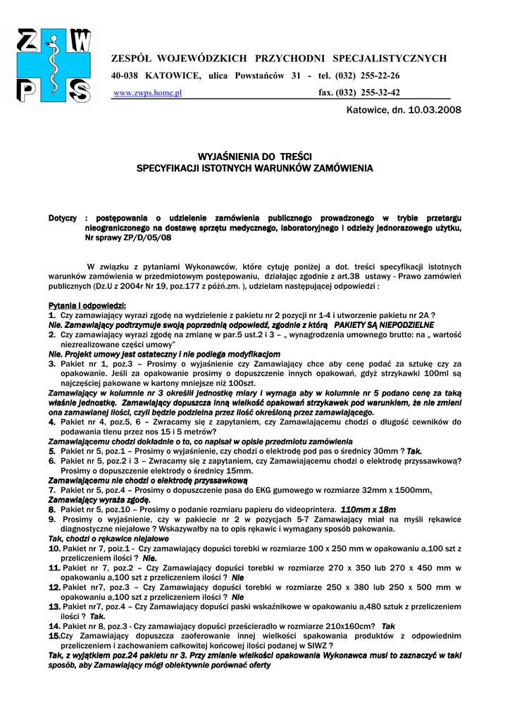 ZESPÓŁ WOJEWÓDZKICH PRZYCHODNI SPECJALISTYCZNYCH 40-038 KATOWICE, ulica Powstańców 31 - tel. (032) 255-22-26 www.zwps.home.pl fax. (032) 255-32-42 Katowice, dn. 10.03.2008 WYJAŚNIENIA DO TREŚCI SPECYFIKACJI ISTOTNYCH WARUNKÓW ZAMÓWIENIA Dotyczy : postępowania o udzielenie zamówienia publicznego prowadzonego w trybie przetargu nieograniczonego na dostawę sprzętu medycznego, laboratoryjnego i odzieŜy jednorazowego uŜytku, uŜytku, Nr sprawy ZP/D/05/08 ZP/D/05/08 W związku z pytaniami Wykonawców, które cytuję poniŜej a dot. treści specyfikacji istotnych warunków zamówienia w przedmiotowym postępowaniu, działając zgodnie z art.38 ustawy - Prawo zamówień publicznych (Dz.U z 2004r Nr 19, poz.177 z póŜń.zm. ), udzielam następującej odpowiedzi : Pytania i odpowiedzi: odpowiedzi: 1. Czy zamawiający wyrazi zgodę na wydzielenie z pakietu nr 2 pozycji nr 1-4 i utworzenie pakietu nr 2A ? Nie. Zamawiający podtrzymuje swoją poprzednią odpowiedź, zgodnie z którą PAKIETY SĄ NIEPODZIELNE 2. Czy zamawiający wyrazi zgodę na zmianę w par.5 ust.2 i 3 – „ wynagrodzenia umownego brutto: na „ wartość niezrealizowane części umowy” Nie. Projekt umowy jest ostateczny i nie podlega modyfikacjom 3. Pakiet nr 1, poz.3 – Prosimy o wyjaśnienie czy Zamawiający chce aby cenę podać za sztukę czy za opakowanie. Jeśli za opakowanie prosimy o dopuszczenie innych opakowań, gdyŜ strzykawki 100ml są najczęściej pakowane w kartony mniejsze niŜ 100szt. Zamawiający w kolumnie nr 3 określił jednostkę miary i wymaga aby w kolumnie nr 5 podano cenę za taką właśnie jednostkę. Zamawiający Zamawiający dopuszcza inną wielkość opakowań strzykawek pod warunkiem, że nie zmieni ona zamawianej ilości, czyli będzie podzielna przez ilość określoną przez zamawiającego. 4. Pakiet nr 4, poz.5, 6 – Zwracamy się z zapytaniem, czy Zamawiającemu chodzi o długość cewników do podawania tlenu przez nos 15 i 5 metrów? Zamawiającemu chodzi dokładnie o to, co napisał w opisie przedmiotu zamówienia 5. Pakiet nr 5, poz.1 – Prosimy o wyjaśnienie, czy chodzi o elektrodę pod pas o średnicy 30mm ? Tak. 6. Pakiet nr 5, poz.2 i 3 – Zwracamy się z zapytaniem, czy Zamawiającemu chodzi o elektrodę przyssawkową? Prosimy o dopuszczenie elektrody o średnicy 15mm. Zamawiającemu nie nie chodzi o elektrodę przyssawkową 7. Pakiet nr 5, poz.4 – Prosimy o dopuszczenie pasa do EKG gumowego w rozmiarze 32mm x 1500mm.. Zamawiający wyraża zgodę. 8. Pakiet nr 5, poz.10 – Prosimy o podanie rozmiaru papieru do videoprintera. 110mm x 18m 9. Prosimy o wyjaśnienie, czy w pakiecie nr 2 w pozycjach 5-7 Zamawiający miał na myśli rękawice diagnostyczne niejałowe ? Wskazywałby na to opis rękawic i wymagany sposób pakowania. Tak, chodzi o rękawice niejałowe 10. Pakiet nr 7, poiz.1 - Czy zamawiający dopuści torebki w rozmiarze 100 x 250 mm w opakowaniu a,100 szt z przeliczeniem ilości ? Nie. 11. Pakiet nr 7, poz.2 – Czy Zamawiający dopuści torebki w rozmiarze 270 x 350 lub 270 x 450 mm w opakowaniu a,100 szt z przeliczeniem ilości ? Nie 12. Pakiet nr7, poz.3 – Czy Zamawiający dopuści torebki w rozmiarze 250 x 380 lub 250 x 500 mm w opakowaniu a,100 szt z przeliczeniem ilości ? Nie 13. Pakiet nr7, poz.4 – Czy Zamawiający dopuści paski wskaźnikowe w opakowaniu a,480 sztuk z przeliczeniem ilości ? Tak. 14. Pakiet nr 8, poz.3 - Czy zamawiający dopuści prześcieradło w rozmiarze 210x160cm? Tak 15.Czy Zamawiający dopuszcza zaoferowanie innej wielkości spakowania produktów z odpowiednim 15. przeliczeniem i zachowaniem całkowitej końcowej ilości podanej w SIWZ ? Tak, z wyjątkiem poz.24 pakietu nr 3. Przy zmianie wielkości opakowania Wykonawca musi to zaznaczyć w taki sposób, aby Zamawiający mógł obiektywnie obiektywnie porównać oferty ZESPÓŁ WOJEWÓDZKICH PRZYCHODNI SPECJALISTYCZNYCH 40-038 KATOWICE, ulica Powstańców 31 - tel. (032) 255-22-26 www.zwps.home.pl fax. (032) 255-32-42 16. Czy Zamawiający dopuszcza podanie w formularzu cenowym ceny jednostkowej za 1 sztukę z dokładnością do trzech lub ewentualnie do czterech miejsc po przecinku a wartość netto i brutto do dwóch miejsc po przecinku ? Prośbę swą motywujemy tym, Ŝe cena jednostkowa drobnego sprzętu laboratoryjnego jest tak niska, Ŝe trudno ja zaokrąglić nawet do dwóch miejsc po przecinku. Poza tym zaokrąglenie do dwóch miejsc po przecinku sztucznie podwyŜszy wartość ofert. Tam, gdzie jest wymagane podanie ceny ceny za 1 sztukę należy ją podać brutto ( nie netto !) i dopuszczalna jest wówczas dokładność nawet do czterech miejsc po przecinku. Natomiast w kolumnie „wartość ilości zamawianej” należy zaokrąglić tylko do dwóch miejsc po przecinku 17. Pakiet nr 3 – Czy nie nastąpiła omyłka pisarska w jednostkach miary podanej w formularzu ? Czy naleŜy zaoferować ilości podane w kolumnie 4 w sztukach czy teŜ naleŜy przeliczyć na opakowania. Tak, nastąpiła omyłka pisarska. Poprawiony pakiet nr 3 zostaje dołączony do niniejszego niniejszego pisma. 18. Pakiet nr 3, poz. 3, 4, 5, 6 – Czy nie nastąpiła omyłka pisarska w jednostce pojemności końcówek ? Czy naleŜy zaoferować końcówki o pojemności podanej w µl? Tak, jest to omyłka pisarska 19.Pakiet nr 3, poz.5 – Czy Zamawiający dopuści zaoferowanie zwykłych uniwersalnych końcówek na 5000ul? 19. Tak. 20. Pakiet nr 3, poz.7 – Czy Zamawiający dopuści pojemniki o poj.uŜytkowej 25ml i całkowitej 30ml? Czy naleŜy zaoferować pojemniki niesterylne ? Tak 21. Pakiet nr 3, poz.8 – Czy Zamawiający dopuści probówki z matowego PP ? Nie 22. Pakiet nr 3, poz.9 – Czy Zamawiający dopuści probówki Falcon z zakrętką ? Tak. 23. Pakiet nr 3, poz.10 – Czy naleŜy zaoferować probówki z granulatem o poj.11ml, 4ml czy teŜ moŜe z przyspieszaczem na 250ul krwi? Z przyspieszaczem 24. Pakiet nr 3, poz.11 – Prosimy o sprecyzowanie pojemności probówek z ED