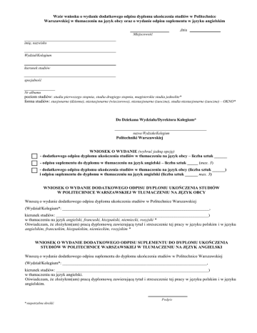 Wzór wniosku o wydanie dodatkowego odpisu dyplomu ukończenia studiów w Politechnice Warszawskiej w tłumaczeniu na język obcy oraz o wydanie odpisu suplementu w języku angielskim ,dnia Miejscowość imię, nazwisko Wydział/Kolegium kierunek studiów specjalność Nr albumu poziom studiów: studia pierwszego stopnia, studia drugiego stopnia, magisterskie studia jednolite* forma studiów: stacjonarne (dzienne), niestacjonarne (wieczorowe), niestacjonarne (zaoczne), studia niestacjonarne (zaoczne) – OKNO* Do Dziekana Wydziału/Dyrektora Kolegium* nazwa Wydziału/Kolegium Politechniki Warszawskiej WNIOSEK O WYDANIE (wybrać jedną opcję) - dodatkowego odpisu dyplomu ukończenia studiów w tłumaczeniu na język obcy – liczba sztuk ______ - odpisu suplementu do dyplomu w tłumaczeniu na język angielski – liczba sztuk _____ (max. 3) - dodatkowego odpisu dyplomu ukończenia studiów w tłumaczeniu na język obcy (liczba sztuk ______) i odpisu suplementu do dyplomu w tłumaczeniu na język angielski (liczba sztuk ______ max. 3) WNIOSEK O WYDANIE DODATKOWEGO ODPISU DYPLOMU UKOŃCZENIA STUDIÓW W POLITECHNICE WARSZAWSKIEJ W TŁUMACZENIU NA JĘZYK OBCY Wnoszą o wydanie dodatkowego odpisu dyplomu ukończenia studiów w Politechnice Warszawskiej (Wydział/Kolegium*: _______________________________________________________________________, kierunek studiów: ________________________________________________________________________) w tłumaczeniu na język angielski, francuski, hiszpański, niemiecki, rosyjski * Oświadczam, że złożyłem(am) pracą dyplomową zawierającą tytuł i streszczenie tej pracy w języku polskim i w języku angielskim, francuskim, hiszpańskim, niemieckim, rosyjskim * WNIOSEK O WYDANIE DODATKOWEGO ODPISU SUPLEMENTU DO DYPLOMU UKOŃCZENIA STUDIÓW W POLITECHNICE WARSZAWSKIEJ W TŁUMACZENIU NA JĘZYK ANGIELSKI Wnoszą o wydanie dodatkowego odpisu suplementu do dyplomu ukończenia studiów w Politechnice Warszawskiej (Wydział/Kolegium*: ___________________________________________________________________, kierunek studiów: ________________________________________________________________________) w tłumaczeniu na język angielski. Oświadczam, że złożyłem(am) pracą dyplomową zawierającą tytuł i streszczenie tej pracy w języku polskim i w języku angielskim. Podpis * niepotrzebne skreślić