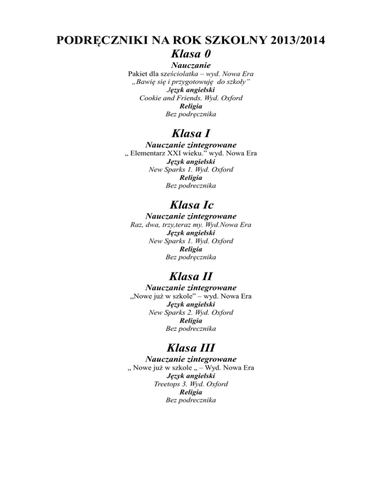 PODRĘCZNIKI NA ROK SZKOLNY 2013/2014 Klasa 0 Klasa I Klasa