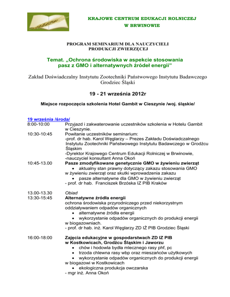 KRAJOWE CENTRUM EDUKACJI ROLNICZEJ W BRWINOWIE PROGRAM SEMINARIUM DLA NAUCZYCIELI PRODUKCJI ZWIERZĘCEJ Temat. „Ochrona środowiska w aspekcie stosowania pasz z GMO i alternatywnych źródeł energii” Zakład Doświadczalny Instytutu Zootechniki Państwowego Instytutu Badawczego Grodziec Śląski 19 - 21 września 2012r Miejsce rozpoczęcia szkolenia Hotel Gambit w Cieszynie /woj. śląskie/ 19 września /środa/ 8:00-10:00 Przyjazd i zakwaterowanie uczestników szkolenia w Hotelu Gambit w Cieszynie. 10:30-10:45 Powitanie uczestników seminarium: -prof. dr hab. Karol Węglarzy – Prezes Zakładu Doświadczalnego Instytutu Zootechniki Państwowego Instytutu Badawczego w Grodźcu Śląskim -Dyrektor Krajowego Centrum Edukacji Rolniczej w Brwinowie, -nauczyciel konsultant Anna Okoń 10:45-13.00 Pasze zmodyfikowane genetycznie GMO w żywieniu zwierząt aktualny stan prawny dotyczący zakazu stosowania GMO w żywieniu zwierząt oraz skutki wprowadzenia zakazu pasze alternatywne dla GMO w żywieniu zwierząt - prof. dr hab. Franciszek Brzóska IZ PIB Kraków 13.00-13.30 13:30-15:45 16:00-18:00 Obiad Alternatywne źródła energii ochrona środowiska przyrodniczego przed niekorzystnym oddziaływaniem odpadów organicznych alternatywne źródła energii wykorzystanie odpadów organicznych do produkcji energii w biogazowniach. - prof. dr hab. inż. Karol Węglarzy ZD IŻ PIB Grodziec Śląski Zajęcia edukacyjne w gospodarstwach ZD IZ PIB w Kostkowicach, Grodźcu Śląskim i Jaworzu chów i hodowla bydła mlecznego rasy phf, pc trzoda chlewna rasy wbp oraz mieszańców użytkowych wykorzystanie odpadów organicznych do produkcji energii w biogazowi w Kostkowicach ekologiczna produkcja owczarska - mgr inż. Anna Okoń Historia i współczesność, prezentowanie dorobku materialnego i kulturowego Cieszyna Kolacja 19:00-20:00 20 września /czwartek/ Śniadanie 5:30-6:00 6:00 Wyjazd studyjny do Słowacji Organizacja i funkcjonowanie system szkolnictwa rolniczego w Słowacji - Średnia Szkoła Rolnicza w Trnawie - ing. Ludovit Skrobak Dyrektor Szkoły Ćwiczenia terenowe: baza dydaktyczna kształcenia praktycznego wyposażenia pracowni przedmiotowych w Średniej Szkole Rolniczej w Trawie – ing Ludovit Skrobak Dyrektor Szkoły 18.00-19.00 15.00-16.00 19:00 19:30 Obiad Historia i współczesność, prezentowanie dorobku materialnego i kulturowego Trnawy i Bratysławy Przyjazd i zakwaterowanie w hotelu w Wiedniu /adres: Hotel Sophienalpe, Sofienalpenstrasse 113, 1140 Wien/ Kolacja Określanie potrzeb nauczycieli w zakresie doskonalenia i rozwoju zawodowego- mgr inż. Anna Okoń nauczyciel konsultant 21 września /piątek/ Śniadanie 7:00-7:30 7:30-11:30 Ocena rozwiązań funkcjonalnych i warunków zoohigienicznych w: hodowli Lipicanów w Hiszpańskiej Szkole Jazdy w Wiedniu– wizyta w stajniach oraz udział we fragmencie pokazu tresury „tańczących koni” utylizacja odpadów w spalarni śmieci w Wiedniu - zwiedzanie spalarni śmieci -mgr inż. Anna Okoń, mgr Ireneusz Misztal 19:30-20:00 20:00 -20:30 11:30-12:00 12:00-16:00 Obiad Zajęcia edukacyjne w Mistelbach Ocena rozwiązań funkcjonalnych i warunków zoohigienicznych w hodowli trzody chlewnej na fermie w Mistelbach - mgr inż. Anna Okoń, mgr Ireneusz Misztal Powrót do Cieszyna 16.00-20.00 Kolacja i nocleg w Hotelu Gambit 20.00-21:00: 22 września /sobota/ Śniadanie wyjazd uczestników szkolenia 7:00-8:00 Miejsce rozpoczęcie seminarium: Hotel Gambit ul. Bucewicza 18 . 43 - 400 Cieszyn tel. 33/852 06 51 Organizator - nauczyciel konsultant Anna Okoń. tel. kom. 506 119 018 [email protected] tel.: 22 /729 73 02 wew. 28,