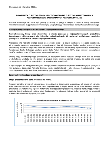 Obowiązuje od 18 grudnia 2011 r. INFORMACJA O RYZYKU STOPY PROCENTOWEJ ORAZ O RYZYKU WALUTOWYM DLA POŻYCZKOBIORCÓW ZACIĄGAJĄCYCH POŻYCZKĘ INTELIGO Poniższa informacja nie może być jedyną podstawą do podjęcia decyzji o wyborze oferty kredytowej. Przedstawione dane mają charakter informacyjny, uwzględniający rekomendacje Komisji Nadzoru Finansowego. Na czym polega i czym skutkuje ryzyko stopy procentowej? Pożyczkobiorca, który chce skorzystać z oferty jednego z najpopularniejszych produktów kredytowych skierowanych dla klientów indywidualnych, tj. pożyczki gotówkowej powinien pamiętać o ponoszonym ryzyku stopy procentowej. Miesięczna rata Pożyczki Inteligo składa się z dwóch części - z części kapitałowej i z części odsetkowej. W przypadku pożyczek gotówkowych oprocentowanych tak jak Pożyczka Inteligo według zmiennej stopy procentowej odsetkowa część raty może się zmieniać w zależności od aktualnej wysokości stóp procentowych Narodowego Banku Polskiego ustalanej przez Radę Polityki Pieniężnej (RPP), stopy rezerwy obowiązkowej banków ustalanej przez RPP oraz zmian na rynku pieniężnym. Zmiany stopy procentowej mogą spowodować, że początkowo tańsza Pożyczka Inteligo może stać się droższa w obsłudze ze względu na w/w zmiany. Z drugiej strony, możliwa jest też sytuacja, że będzie ona tańsza od pierwotnych ustaleń, ale tego niestety nie sposób z góry przewidzieć. Z tego względu, na zaciągnięcie Pożyczki Inteligo powinni decydować się Klienci świadomi ryzyka, jakie jest z nim związane. Zaciągając Pożyczkę Inteligo, warto przekalkulować – dla własnego bezpieczeństwa – czy dochody pozwolą na jej obsłużenie, także wtedy, gdy wzrosłaby wysokość raty. Czym jest ryzyko stopy procentowej? Stopa procentowa to cena pieniądza na rynku. Prognozy odnośnie przyszłych wartości stopy procentowej są dokonywane na podstawie ich przeszłych wartości, które niekoniecznie będą odzwierciedlać trend długookresowy. Z drugiej jednak strony, Pożyczkobiorca powinien prześledzić, jak kształtowały się dane historyczne dotyczące stopy procentowej. Przeszłe trendy mogą pomóc w podjęciu decyzji dotyczącej wyboru oferty kredytowej, nie stanowią jednak żadnej gwarancji na przyszłość w kwestii kształtowania się sytuacji na rynku. 2009-06-25 2009-03-26 2009-02-26 2009-01-28 2008-12-24 2008-11-27 2008-06-26 2008-03-27 2008-02-28 2008-01-31 2007-11-29 2007-08-30 2007-06-27 2007-04-26 2006-03-01 2006-02-01 2005-09-01 2005-07-28 2005-06-30 2005-04-28 2005-03-31 2004-08-26 10 8 6 4 2 0 2004-07-29 wysokość st. lombardowej Stopa lombardowa NBP w okresie 5 lat Obowiązuje od 18 grudnia 2011 r. Bank informuje Klientów o kosztach i ryzykach związanych z ofertą Pożyczki Inteligo. Pamiętajmy jednak, że Bank nie podejmie za Pożyczkobiorcę decyzji ani nie ponosi za nią odpowiedzialności. To Pożyczkobiorca pozostanie związany zawartą umową Pożyczki Inteligo, zgodnie z którą przez kilkadziesiąt miesięcy będzie spłacał kapitał i odsetki. Symulacja modelowa obrazuje wpływ zmian oprocentowania Pożyczki Inteligo na wysokość miesięcznych rat kapitałowo-odsetkowych. Założone zostały dwa warianty wzrostu oprocentowania o 2 i o 4 punkty procentowe dla Pożyczki Inteligo (co może być spowodowane np. podwyższeniem stopy procentowej kredytu lombardowego NBP o 0,5 i 1pp., w wyniku czego zmieniony zostanie, zgodnie z tzw. Ustawą antylichwiarską maksymalny pułap odsetek, które będą mogły być pobierane przez banki). Założenia: • równe raty kapitałowo-odsetkowe, • okres spłaty 60 miesięcy, • wysokość Pożyczki Inteligo 10.000 zł, Warunki cenowe Pożyczki Warunki w chwili Inteligo udzielenia Pożyczki Inteligo Nominalne oprocentowanie Pożyczki Inteligo 19,99% w skali roku Przybliżona rata miesięczna w zł 264,88 zł dla powyższego przykładu Procentowy wzrost wysokości raty _ w stosunku do warunków pierwotnych Wzrost oprocentowania o 2 punkty procentowe Wzrost oprocentowania o 4 punkty procentowe 21,99% 23,99% 276,13 zł 287,62 zł 4,25% 8,59% Ryzyko walutowe (kursowe) Ryzyko walutowe (kursowe) występuje w przypadku pożyczek gotówkowych udzielonych w walucie innej niż waluta, w której Pożyczkobiorca osiąga dochód. W przypadku, gdy Pożyczkobiorca zaciąga pożyczkę/kredyt gotówkowy w złotych, natomiast dochody osiąga w innej walucie, na wzrost kosztów obsługi kredytu istotne znaczenie ma umocnienie złotego względem innych Obowiązuje od 18 grudnia 2011 r. walut. Zmiana kursu walutowego ma znaczenie również w sytuacji, gdy Pożyczkobiorca zamierza dokonać wcześniejszej spłaty pożyczki/kredytu gotówkowego. Z kolei osłabienie złotego wpłynie na obniżenie kosztów obsługi. Może wystąpić sytuacja, gdy wysokość raty wyrażona w walucie dochodu Pożyczkobiorca w dniu spłaty kredytu będzie wyższa niż w momencie udzielenia kredytu. Słowniczek WIBOR – średnia stopa procentowa, po jakiej największe banki w Polsce są skłonne innym bankom udzielić pożyczki w złotych na ustalony okres. Oprocentowanie zmienne – stopa, według której oprocentowany jest kredyt, ustalana jako suma odpowiedniej dla danej waluty stopy referencyjnej (typu np. WIBOR, LIBOR) i marży banku. Raty równe / wg formuły annuitetowej – raty obejmujące spłatę kapitału i odsetek, przy czym w miarę spłaty pożyczki udział raty kapitałowej rośnie, a raty odsetkowej maleje, przez co rata w całym okresie kredytowania jest stała dla Pożyczkobiorcy.”