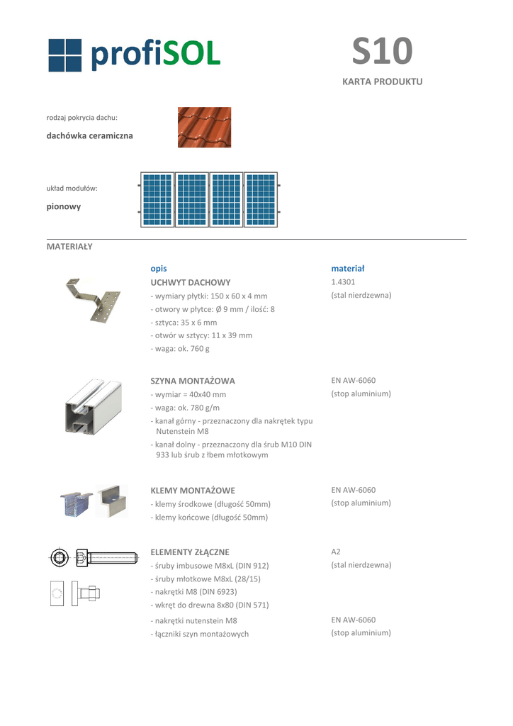 S10 KARTA PRODUKTU rodzaj pokrycia dachu: dachówka ceramiczna układ modułów: pionowy MATERIAŁY opis UCHWYT DACHOWY materiał - wymiary płytki: 150 x 60 x 4 mm (stal nierdzewna) 1.4301 - otwory w płytce: Ø 9 mm / ilość: 8 - sztyca: 35 x 6 mm - otwór w sztycy: 11 x 39 mm - waga: ok. 760 g SZYNA MONTAŻOWA EN AW-6060 - wymiar = 40x40 mm (stop aluminium) - waga: ok. 780 g/m - kanał górny - przeznaczony dla nakrętek typu Nutenstein M8 - kanał dolny - przeznaczony dla śrub M10 DIN 933 lub śrub z łbem młotkowym KLEMY MONTAŻOWE EN AW-6060 - klemy środkowe (długość 50mm) (stop aluminium) - klemy końcowe (długość 50mm) ELEMENTY ZŁĄCZNE A2 - śruby imbusowe M8xL (DIN 912) (stal nierdzewna) - śruby młotkowe M8xL (28/15) - nakrętki M8 (DIN 6923) - wkręt do drewna 8x80 (DIN 571) - nakrętki nutenstein M8 EN AW-6060 - łączniki szyn montażowych (stop aluminium)