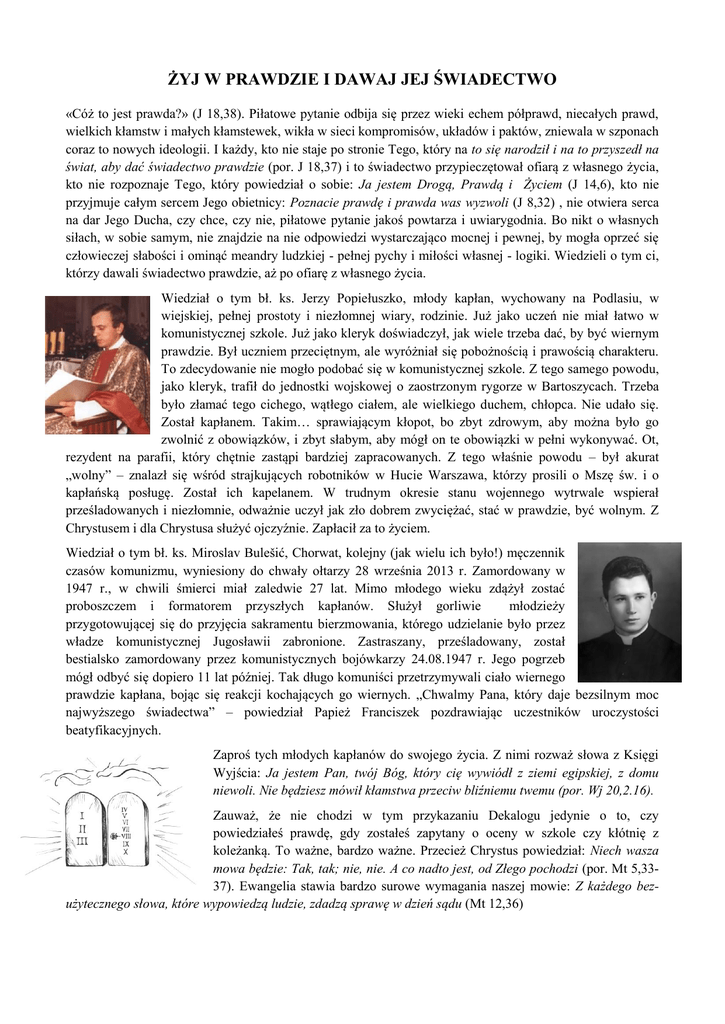 ŻYJ W PRAWDZIE I DAWAJ JEJ ŚWIADECTWO «Cóż to jest prawda?» (J 18,38). Piłatowe pytanie odbija się przez wieki echem półprawd, niecałych prawd, wielkich kłamstw i małych kłamstewek, wikła w sieci kompromisów, układów i paktów, zniewala w szponach coraz to nowych ideologii. I każdy, kto nie staje po stronie Tego, który na to się narodził i na to przyszedł na świat, aby dać świadectwo prawdzie (por. J 18,37) i to świadectwo przypieczętował ofiarą z własnego życia, kto nie rozpoznaje Tego, który powiedział o sobie: Ja jestem Drogą, Prawdą i Życiem (J 14,6), kto nie przyjmuje całym sercem Jego obietnicy: Poznacie prawdę i prawda was wyzwoli (J 8,32) , nie otwiera serca na dar Jego Ducha, czy chce, czy nie, piłatowe pytanie jakoś powtarza i uwiarygodnia. Bo nikt o własnych siłach, w sobie samym, nie znajdzie na nie odpowiedzi wystarczająco mocnej i pewnej, by mogła oprzeć się człowieczej słabości i ominąć meandry ludzkiej - pełnej pychy i miłości własnej - logiki. Wiedzieli o tym ci, którzy dawali świadectwo prawdzie, aż po ofiarę z własnego życia. Wiedział o tym bł. ks. Jerzy Popiełuszko, młody kapłan, wychowany na Podlasiu, w wiejskiej, pełnej prostoty i niezłomnej wiary, rodzinie. Już jako uczeń nie miał łatwo w komunistycznej szkole. Już jako kleryk doświadczył, jak wiele trzeba dać, by być wiernym prawdzie. Był uczniem przeciętnym, ale wyróżniał się pobożnością i prawością charakteru. To zdecydowanie nie mogło podobać się w komunistycznej szkole. Z tego samego powodu, jako kleryk, trafił do jednostki wojskowej o zaostrzonym rygorze w Bartoszycach. Trzeba było złamać tego cichego, wątłego ciałem, ale wielkiego duchem, chłopca. Nie udało się. Został kapłanem. Takim… sprawiającym kłopot, bo zbyt zdrowym, aby można było go zwolnić z obowiązków, i zbyt słabym, aby mógł on te obowiązki w pełni wykonywać. Ot, rezydent na parafii, który chętnie zastąpi bardziej zapracowanych. Z tego właśnie powodu – był akurat „wolny” – znalazł się wśród strajkujących robotników w Hucie Warszawa, którzy prosili o Mszę św. i o kapłańską posługę. Został ich kapelanem. W trudnym okresie stanu wojennego wytrwale wspierał prześladowanych i niezłomnie, odważnie uczył jak zło dobrem zwyciężać, stać w prawdzie, być wolnym. Z Chrystusem i dla Chrystusa służyć ojczyźnie. Zapłacił za to życiem. Wiedział o tym bł. ks. Miroslav Bulešić, Chorwat, kolejny (jak wielu ich było!) męczennik czasów komunizmu, wyniesiony do chwały ołtarzy 28 września 2013 r. Zamordowany w 1947 r., w chwili śmierci miał zaledwie 27 lat. Mimo młodego wieku zdążył zostać proboszczem i formatorem przyszłych kapłanów. Służył gorliwie młodzieży przygotowującej się do przyjęcia sakramentu bierzmowania, którego udzielanie było przez władze komunistycznej Jugosławii zabronione. Zastraszany, prześladowany, został bestialsko zamordowany przez komunistycznych bojówkarzy 24.08.1947 r. Jego pogrzeb mógł odbyć się dopiero 11 lat później. Tak długo komuniści przetrzymywali ciało wiernego prawdzie kapłana, bojąc się reakcji kochających go wiernych. „Chwalmy Pana, który daje bezsilnym moc najwyższego świadectwa” – powiedział Papież Franciszek pozdrawiając uczestników uroczystości beatyfikacyjnych. Zaproś tych młodych kapłanów do swojego życia. Z nimi rozważ słowa z Księgi Wyjścia: Ja jestem Pan, twój Bóg, który cię wywiódł z ziemi egipskiej, z domu niewoli. Nie będziesz mówił kłamstwa przeciw bliźniemu twemu (por. Wj 20,2.16). Zauważ, że nie chodzi w tym przykazaniu Dekalogu jedynie o to, czy powiedziałeś prawdę, gdy zostałeś zapytany o oceny w szkole czy kłótnię z koleżanką. To ważne, bardzo ważne. Przecież Chrystus powiedział: Niech wasza mowa będzie: Tak, tak; nie, nie. A co nadto jest, od Złego pochodzi (por. Mt 5,3337). Ewangelia stawia bardzo surowe wymagania naszej mowie: Z każdego bezużytecznego słowa, które wypowiedzą ludzie, zdadzą sprawę w dzień sądu (Mt 12,36) Ale… Bóg mówi o kłamstwie PRZECIW bliźniemu. I – mówił bł. Jan Paweł II w Olsztynie w 1991 r. - „nie chodzi tylko o sytuację oskarżonego wobec trybunału, nie chodzi tylko o sytuację świadka, który mówi nieprawdę, chodzi o sytuacje wielorakie, w których słowo ludzkie daje świadectwo”. Świadectwo to prawda poświadczona życiem, zgodność życia z wyznawaną prawdą. Jego pierwszym i najważniejszym nauczycielem jest sumienie. Ono uczy „czynić samego siebie prawdziwym” (św. Augustyn), czyli poświadczać prawdę życiem, czynić ją, wypełniać, urzeczywistniać. „Tym przykazaniem Bóg Przymierza szczególnie daje poznać, że człowiek jest stworzony na Jego obraz i podobieństwo. Dlatego właśnie całe ludzkie postępowanie poddane jest wymogom prawdy. Prawda jest dobrem, a kłamstwo, fałsz, zakłamanie jest złem […]. A jeżeli czytamy Ewangelię, jeżeli ją wciąż czytamy i wciąż nad nią myślimy, to uświadamiamy sobie, że ta sprawa między prawdą a kłamstwem, między świadectwem prawdy, świadkami prawdy a ojcem kłamstwa, jest jakąś sprawą pierworodną i podstawową. Człowiek jest wolny, człowiek jest wolny także, ażeby mówić nieprawdę. Ale nie jest naprawdę wolny, jeżeli nie mówi prawdy” (bł. Jan Paweł II, Olsztyn, 1991). Po tym zaś poznajemy, że Go znamy, jeżeli zachowujemy Jego przykazania. Kto mówi: "Znam Go", a nie zachowuje Jego przykazań, ten jest kłamcą i nie ma w nim prawdy. Kto zaś zachowuje Jego naukę, w tym naprawdę miłość Boża jest doskonała (1J 2,3-5). Bo miłość, ta prawdziwa, zakorzeniona w Tym, który jest Miłością - cierpliwa, łaskawa, która nie zazdrości, nie szuka poklasku, nie unosi się pychą, nie dopuszcza się bezwstydu, nie szuka swego, nie unosi się gniewem, nie pamięta złego, nie cieszy się z niesprawie