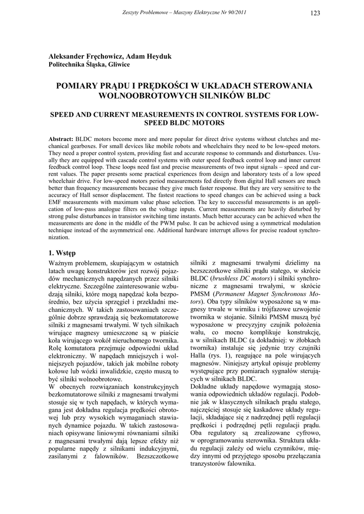 Zeszyty Problemowe – Maszyny Elektryczne Nr 90/2011 123 Aleksander Fręchowicz, Adam Heyduk Politechnika Śląska, Gliwice POMIARY PRĄDU I PRĘDKOŚCI W UKŁADACH STEROWANIA WOLNOOBROTOWYCH SILNIKÓW BLDC SPEED AND CURRENT MEASUREMENTS IN CONTROL SYSTEMS FOR LOWSPEED BLDC MOTORS Abstract: BLDC motors become more and more popular for direct drive systems without clutches and mechanical gearboxes. For small devices like mobile robots and wheelchairs they need to be low-speed motors. They need a proper control system, providing fast and accurate response to commands and disturbances. Usually they are equipped with cascade control systems with outer speed feedback control loop and inner current feedback control loop. These loops need fast and precise measurements of two input signals – speed and current values. The paper presents some practical experiences from design and laboratory tests of a low speed wheelchair drive. For low-speed motors period measurements fed directly from digital Hall sensors are much better than frequency measurements because they give much faster response. But they are very sensitive to the accuracy of Hall sensor displacement. The fastest reactions to speed changes can be achieved using a back EMF measurements with maximum value phase selection. The key to successful measurements is an application of low-pass analogue filters on the voltage inputs. Current measurements are heavily disturbed by strong pulse disturbances in transistor switching time instants. Much better accuracy can be achieved when the measurements are done in the middle of the PWM pulse. It can be achieved using a symmetrical modulation technique instead of the asymmetrical one. Additional hardware interrupt allows for precise readout synchronization. 1. Wstęp WaŜnym problemem, skupiającym w ostatnich latach uwagę konstruktorów jest rozwój pojazdów mechanicznych napędzanych przez silniki elektryczne. Szczególne zainteresowanie wzbudzają silniki, które mogą napędzać koła bezpośrednio, bez uŜycia sprzęgieł i przekładni mechanicznych. W takich zastosowaniach szczególnie dobrze sprawdzają się bezkomutatorowe silniki z magnesami trwałymi. W tych silnikach wirujące magnesy umieszczone są w piaście koła wirującego wokół nieruchomego twornika. Rolę komutatora przejmuje odpowiedni układ elektroniczny. W napędach mniejszych i wolniejszych pojazdów, takich jak mobilne roboty kołowe lub wózki inwalidzkie, często muszą to być silniki wolnoobrotowe. W obecnych rozwiązaniach konstrukcyjnych bezkomutatorowe silniki z magnesami trwałymi stosuje się w tych napędach, w których wymagana jest dokładna regulacja prędkości obrotowej lub przy wysokich wymaganiach stawianych dynamice pojazdu. W takich zastosowaniach opisywane liniowymi równaniami silniki z magnesami trwałymi dają lepsze efekty niŜ popularne napędy z silnikami indukcyjnymi, zasilanymi z falowników. Bezszczotkowe silniki z magnesami trwałymi dzielimy na bezszczotkowe silniki prądu stałego, w skrócie BLDC (brushless DC motors) i silniki synchroniczne z magnesami trwałymi, w skrócie PMSM (Permanent Magnet Synchronous Motors). Oba typy silników wyposaŜone są w magnesy trwałe w wirniku i trójfazowe uzwojenie twornika w stojanie. Silniki PMSM muszą być wyposaŜone w precyzyjny czujnik połoŜenia wału, co mocno komplikuje konstrukcję, a w silnikach BLDC (a dokładniej: w Ŝłobkach twornika) instaluje się jedynie trzy czujniki Halla (rys. 1), reagujące na pole wirujących magnesów. Niniejszy artykuł opisuje problemy występujące przy pomiarach sygnałów sterujących w silnikach BLDC. Dokładne układy napędowe wymagają stosowania odpowiednich układów regulacji. Podobnie jak w klasycznych silnikach prądu stałego, najczęściej stosuje się kaskadowe układy regulacji, składające się z nadrzędnej pętli regulacji prędkości i podrzędnej pętli regulacji prądu. Oba regulatory są zrealizowane cyfrowo, w oprogramowaniu sterownika. Struktura układu regulacji zaleŜy od wielu czynników, między innymi od przyjętego sposobu przełączania tranzystorów falownika. 124 Zeszyty Problemowe – Maszyny Elektryczne Nr 90/2011 Stąd teŜ niezbędne jest zastosowanie w układzie wejściowym aktywnych, dolnoprzepustowych filtrów RC. Rys. 1. Przykład rozmieszczenie czujników hallotronowych w Ŝłobkach twornika silnika BLDC Przy tworzeniu oprogramowania sterującego układem napędowym zwraca się szczególną uwagę na jego niezawodność, wyraŜającą się niezaleŜnością działania poszczególnych procedur (przy ich jednoczesnej synchronizacji), dąŜąc równocześnie do maksymalnego uproszczenia struktury programu głównego. MoŜliwie duŜa ilość zadań jest przenoszona bezpośrednio na podzespoły sprzętowe mikrosterownika i jest wykonywana niezaleŜnie od toku oprogramowania. Stąd teŜ dla minimalizacji strat czasu związanych z rozpoczynaniem i oczekiwaniem na zakończenie pomiaru analogowego przyjęto zasadę ciągłego cyklicznego pomiaru wszystkich wielkości analogowych (kaŜda wartość mierzona jest odświeŜana co okres ok. 10 µs), a jednocześnie chwile odczytu pomierzonych wartości są synchronizowane z momentami próbkowania regulatorów lub z działaniem liczników sterujących modulacją szerokości impulsów. Rozwiązanie takie w sposób istotny upraszcza konstrukcję programu i pozwala wyeliminować wielokrotne oczekiwanie na zakończenie procesu przetwarzania AC. 2. Pomiary wartości prądu w obwodzie stałoprądowym Pomiary wartości prądu mają bardzo duŜe znaczenie dla poprawnej pracy całego układu napędowego, gdyŜ uzyskiwane z nich wartości są sygnałami wejściowymi dla podrzędnej pętli regulacji prądu. W układzie badawczym pętla pracuje z okresem próbkowania równym 800µs, aby szybko odwzorowywać przebieg prądu wyznaczony w nadrzędnej pętli regulacji prędkości. W zarejestrowanym przebiegu prądu (rys. 2), wyraźnie widoczn