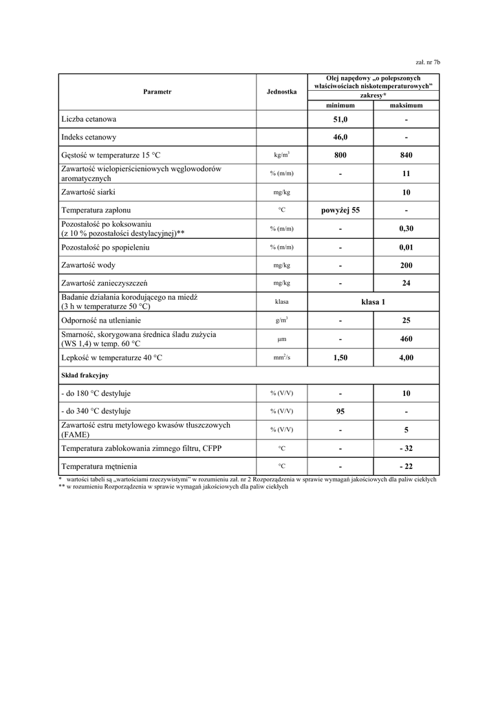 zał. nr 7b Parametr Jednostka Olej napędowy „o polepszonych właściwościach niskotemperaturowych” zakresy* minimum maksimum Liczba cetanowa 51,0 - Indeks cetanowy 46,0 - kg/m3 800 840 % (m/m) - 11 Gęstość w temperaturze 15 °C Zawartość wielopierścieniowych węglowodorów aromatycznych Zawartość siarki Temperatura zapłonu 10 mg/kg °C powyŜej 55 - Pozostałość po koksowaniu (z 10 % pozostałości destylacyjnej)** % (m/m) - 0,30 Pozostałość po spopieleniu % (m/m) - 0,01 Zawartość wody mg/kg - 200 Zawartość zanieczyszczeń mg/kg - 24 Badanie działania korodującego na miedź (3 h w temperaturze 50 °C) klasa Odporność na utlenianie g/m3 - 25 Smarność, skorygowana średnica śladu zuŜycia (WS 1,4) w temp. 60 °C µm - 460 mm2/s 1,50 4,00 - do 180 °C destyluje % (V/V) - 10 - do 340 °C destyluje % (V/V) 95 - Zawartość estru metylowego kwasów tłuszczowych (FAME) % (V/V) - 5 Temperatura zablokowania zimnego filtru, CFPP °C - - 32 Temperatura mętnienia °C - - 22 Lepkość w temperaturze 40 °C klasa 1 Skład frakcyjny * wartości tabeli są „wartościami rzeczywistymi” w rozumieniu zał. nr 2 Rozporządzenia w sprawie wymagań jakościowych dla paliw ciekłych ** w rozumieniu Rozporządzenia w sprawie wymagań jakościowych dla paliw ciekłych