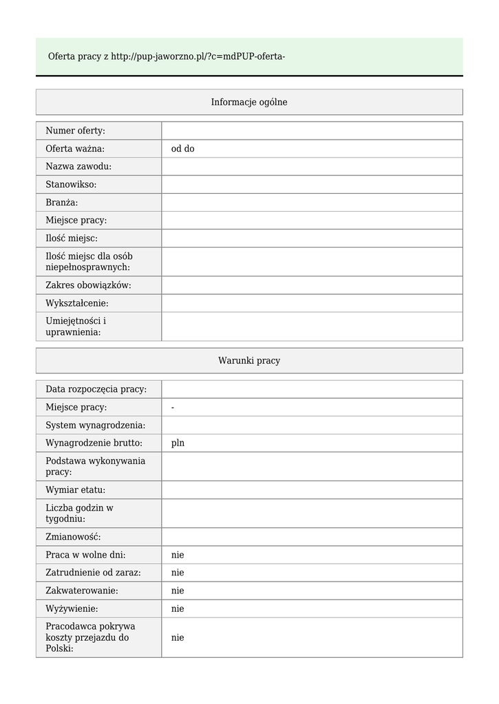 Oferta pracy z http://pup-jaworzno.pl/?c=mdPUP-oferta- Informacje ogólne Numer oferty: Oferta ważna: od do Nazwa zawodu: Stanowikso: Branża: Miejsce pracy: Ilość miejsc: Ilość miejsc dla osób niepełnosprawnych: Zakres obowiązków: Wykształcenie: Umiejętności i uprawnienia: Warunki pracy Data rozpoczęcia pracy: Miejsce pracy: - System wynagrodzenia: Wynagrodzenie brutto: pln Podstawa wykonywania pracy: Wymiar etatu: Liczba godzin w tygodniu: Zmianowość: Praca w wolne dni: nie Zatrudnienie od zaraz: nie Zakwaterowanie: nie Wyżywienie: nie Pracodawca pokrywa koszty przejazdu do Polski: nie Sposób aplikowania Sposób aplikowania: Wymagane dokumenty: Język składania aplikacji: Nazwa organizacji: Adres: Telefon: Email: Bezpośrednio do pracodawcy