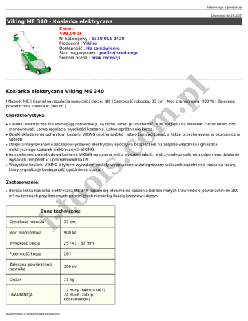 Informacje o produkcie Utworzono 08-03-2017 Viking ME 340 - Kosiarka elektryczna Cena : 499,00 zł Kosiarka elektryczna Viking ME 340 m .p l Nr katalogowy : 6310 011 2420 Producent : Viking Dostępność : Na zamówienie Stan magazynowy : poniżej średniego Średnia ocena : brak recenzji | Napęd: NIE | Centralna regulacja wysokości cięcia: NIE | Szerokość robocza: 33 cm | Moc znamionowa: 900 W | Zalecana powierzchnia trawnika: 300 m2 | Charakterystyka: ● ● co ● s. ● Kosiarki elektryczne nie wymagają konserwacji, są ciche, łatwo je uruchomić, a ze względu na niewielki ciężar łatwo nimi manewrować. Łatwa regulacja wysokości koszenia. Łatwe opróżnianie kosza. Dzięki składanemu uchwytowi kosiarki VIKING można szybko i łatwo transportować, a także przechowywać w ekonomiczny sposób. Dzięki zintegrowanemu zaczepowi przewód elektryczny spoczywa bezpiecznie na zespole włącznika i gniazdka elektrycznego kosiarek elektrycznych VIKING. Jednoelementowa obudowa kosiarek VIKING wykonana jest z wysokiej jakości wytrzymałego polimeru odpornego działanie wysokich temperatur i promieniowania UV. Wszystkie kosiarki VIKING z tylnym wyrzutem zostały wyposażone w zintegrowany wskaźnik napełnienia kosza na trawę, który sygnalizuje konieczność opróżnienia kosza. to ol ● Zastosowanie: ● Bardzo lekka kosiarka elektryczna ME 340 nadaje się idealnie do koszenia bardzo małych trawników o powierzchni do 300 m² na terenach przydomowych porośniętych niewielką ilością krzewów i drzew. i- Dane techniczne: Szerokość robocza 33 cm Moc znamionowa 900 W Wysokość cięcia 25 / 41 / 57 mm Pojemność kosza 26 l Zalecana powierzchnia trawnika 300 m2 Ciężar 11 kg GWARANCJA 12 m-cy (faktura VAT) 24 m-ce (zakup konsumencki) Wygenerowano w programie www.oscGold.com Wyposażenie standardowe: i- to ol s. co m .p l 1. Kosiarka elektryczna Viking ME 340 2. Instrukcja obsługi 3. Opakowanie: karton
