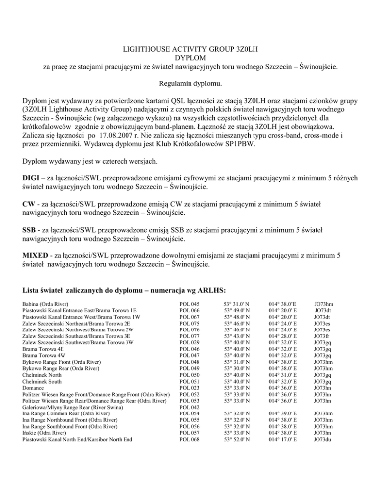 LIGHTHOUSE ACTIVITY GROUP 3Z0LH DYPLOM za pracę ze stacjami pracującymi ze świateł nawigacyjnych toru wodnego Szczecin – Świnoujście. Regulamin dyplomu. Dyplom jest wydawany za potwierdzone kartami QSL łączności ze stacją 3Z0LH oraz stacjami członków grupy (3Z0LH Lighthouse Activity Group) nadającymi z czynnych polskich świateł nawigacyjnych toru wodnego Szczecin - Świnoujście (wg załączonego wykazu) na wszystkich częstotliwościach przydzielonych dla krótkofalowców zgodnie z obowiązującym band-planem. Łączność ze stacją 3Z0LH jest obowiązkowa. Zalicza się łączności po 17.08.2007 r. Nie zalicza się łączności mieszanych typu cross-band, cross-mode i przez przemienniki. Wydawcą dyplomu jest Klub Krótkofalowców SP1PBW. Dyplom wydawany jest w czterech wersjach. DIGI – za łączności/SWL przeprowadzone emisjami cyfrowymi ze stacjami pracującymi z minimum 5 różnych świateł nawigacyjnych toru wodnego Szczecin – Świnoujście. CW - za łączności/SWL przeprowadzone emisją CW ze stacjami pracującymi z minimum 5 świateł nawigacyjnych toru wodnego Szczecin – Świnoujście. SSB - za łączności/SWL przeprowadzone emisją SSB ze stacjami pracującymi z minimum 5 świateł nawigacyjnych toru wodnego Szczecin – Świnoujście. MIXED - za łączności/SWL przeprowadzone dowolnymi emisjami ze stacjami pracującymi z minimum 5 świateł nawigacyjnych toru wodnego Szczecin – Świnoujście. Lista świateł zaliczanych do dyplomu – numeracja wg ARLHS: Babina (Orda River) Piastowski Kanal Entrance East/Brama Torowa 1E Piastowski Kanal Entrance West/Brama Torowa 1W Zalew Szczecinski Northeast/Brama Torowa 2E Zalew Szczecinski Northwest/Brama Torowa 2W Zalew Szczecinski Southeast/Brama Torowa 3E Zalew Szczecinski Southwest/Brama Torowa 3W Brama Torowa 4E Brama Torowa 4W Bykowo Range Front (Orda River) Bykowo Range Rear (Orda River) Chelminek North Chelminek South Domance Politzer Wiesen Range Front/Domance Range Front (Odra River) Politzer Wiesen Range Rear/Domance Range Rear (Odra River) Galeriowa/Mlyny Range Rear (River Swina) Ina Range Common Rear (Odra River) Ina Range Northbound Front (Odra River) Ina Range Southbound Front (Odra River) Ińskie (Odra River) Piastowski Kanal North End/Karsibor North End POL 045 POL 066 POL 067 POL 075 POL 076 POL 077 POL 029 POL 046 POL 047 POL 048 POL 049 POL 050 POL 051 POL 023 POL 052 POL 053 POL 042 POL 054 POL 055 POL 056 POL 057 POL 068 53° 31.0' N 53° 49.0' N 53° 48.0' N 53° 46.0' N 53° 46.0' N 53° 43.0' N 53° 40.0' N 53° 40.0' N 53° 40.0' N 53° 31.0' N 53° 30.0' N 53° 40.0' N 53° 40.0' N 53° 33.0' N 53° 33.0' N 53° 33.0' N 014° 38.0’E 014° 20.0' E 014° 20.0' E 014° 24.0' E 014° 24.0' E 014° 28.0' E 014° 32.0' E 014° 32.0' E 014° 32.0' E 014° 38.0' E 014° 38.0' E 014° 31.0' E 014° 32.0' E 014° 36.0' E 014° 36.0' E 014° 36.0' E JO73hm JO73dt JO73dt JO73es JO73es JO73fr JO73gq JO73gq JO73gq JO73hm JO73hm JO73gq JO73gq JO73hn JO73hn JO73hn 53° 32.0' N 53° 32.0' N 53° 32.0' N 53° 33.0' N 53° 52.0' N 014° 39.0' E 014° 38.0' E 014° 38.0' E 014° 38.0' E 014° 17.0' E JO73hm JO73hm JO73hm JO73hn JO73du Karsibor Range Front Karsibor Range Rear Kosa (Marine Pier) North End Kosa (Marine Pier) South End Krepa Range Front Krepa Range Rear Łąki Range Front (Odra River) Łąki Range Rear (Odra River) Mankow Front Range Mankow Rear Range Mielen North End Mielen South End Windmill/Mlyny Range Front (Świna River) Police Range Front (Odra River) Police Range Rear (Odra River) Stepnica Range Front Stepnica Range Rear Swieta Range Front (Orda River) Swieta Range Rear (Orda River) Swinoujscie Swinoujscie - Mlyny Front Range Swinoujscie - Mlyny Galeriowa Rear Swinoujscie - Outer Head of East Mole POL 058 POL 059 POL 036 POL 037 POL 060 POL 061 POL 062 POL 063 POL 030 POL 031 POL 064 POL 065 POL 041 POL 069 POL 070 POL 071 POL 072 POL 073 POL 074 POL 019 POL 028 POL 027 POL 026 53° 51.0' N 53° 52.0' N 53° 54.0' N 53° 54.0' N 53° 36.0' N 53° 36.0' N 014° 17.0' E 014° 16.0' E 014° 16.0' E 014° 15.0' E 014° 36.0' E 014° 36.0' E JO73du JO73du JO73dv JO73dv JO73ho JO73ho 53° 37.0' N 53° 37.0' N 53° 54.0' N 53° 53.0' N 53° 56.0' N 53° 34.0' N 53° 34.0' N 53° 38.0' N 53° 39.0' N 53° 28.0' N 53° 28.0' N 53° 55.0' N 53° 56.0' N 53° 55.0' N 53° 56.0' N 014° 37.0' E 014° 37.0' E 014° 15.0' E 014° 16.0' E 014° 17.0' E 014° 36.0' E 014° 35.0' E 014° 35.0' E 014° 35.0' E 014° 37.0' E 014° 36.0' E 014° 17.0' E 014° 17.0' E 014° 17.0' E 014° 17.0' E JO73ho JO73ho JO73dv JO73dv JO73dw JO73hn JO73gn JO73gp JO73gp JO73hl JO73hl JO73dv JO73dw JO73dv JO73dw Joker. Do każdego dyplomu zamiast brakującego piątego światła nawigacyjnego można uwzględnić potwierdzone łączności z 2 członkami grupy, stacjami klubowymi SP1PBW i SP1PWP lub gośćmi grupy pracującymi z dowolnego QTH. Członkowie grupy: 3Z1BLH, 3Z1CLH, SO1WE, DK9WE, SP1DOZ, SP1DPA, SP1FFC, SP1TMN, SQ1EUG, SQ1FYX, SQ1LZS, SQ1PSA. Goście grupy: DK8RE, DL1CC, SP1GQW, SP1EG, SP1JW, SP1JZZ, SP1QW, SP1WSR, SP1YT, SQ1WSR. Zgłoszenie do dyplomu należy przesyłać na załączonym do regulaminu formularzu (do pobrania ze strony: http://www.sp1pbw.pl/3Z1LH 1/dyplom.html ), który będzie zatwierdzony po sprawdzeniu kart QSL i potwierdzeniu tego faktu na przesłanym do Award Managera wykazie łączności przez: dwóch licencjonowanych nadawców, dowolny klub krótkofalowców z podpisem sprawdzającego i pieczątką klubu. Wydawca nie przyjmuje kart QSL do weryfikacji zgłoszeń. Wydanie następnej wersji Dyplomu nastąpi po przesłaniu kolejnego zgłoszenia do wydawcy dyplomu. Dyplom dostępny jest dla nadawców i nasłuchowców. Dyplom wydawany jest bezpłatnie w formie elektronicznej. Zgłoszenia na dyplom należy przesyłać pocztą elektroniczną na adres: [email protected] zaznaczając w temacie korespondencji Dyplom 3Z0LH. Wzory dyplomu: