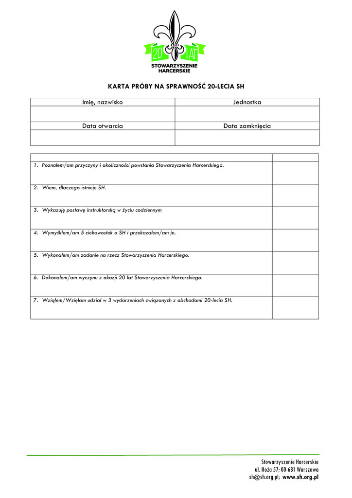 KARTA PRÓBY NA SPRAWNOŚĆ 20-LECIA SH Imię, nazwisko Jednostka Data otwarcia Data zamknięcia 1. Poznałem/am przyczyny i okoliczności powstania Stowarzyszenia Harcerskiego. 2. Wiem, dlaczego istnieje SH. 3. Wykazuję postawę instruktorską w życiu codziennym 4. Wymyśliłem/am 5 ciekawostek o SH i przekazałem/am je. 5. Wykonałem/am zadanie na rzecz Stowarzyszenia Harcerskiego. 6. Dokonałem/am wyczynu z okazji 20 lat Stowarzyszenia Harcerskiego. 7. Wziąłem/Wzięłam udział w 3 wydarzeniach związanych z obchodami 20-lecia SH. Stowarzyszenie Harcerskie ul. Hoża 57; 00-681 Warszawa [email protected]; www.sh.org.pl