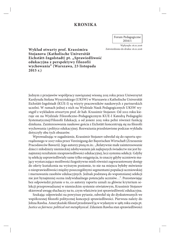 KRONIKA Forum Pedagogiczne 2016/1 Wykład otwarty prof. Krassimira Stojanova (Katholische Universität Eichstätt-Ingolstadt) pt. „Sprawiedliwość edukacyjna z perspektywy filozofii wychowania” (Warszawa, 23 listopada 2015 r.) Wpłynęło: 16.01.2016 Zatwierdzono do druku: 16.01.2016 Jednym z przejawów współpracy nawiązanej wiosną 2015 roku przez Uniwersytet Kardynała Stefana Wyszyńskiego (UKSW) w Warszawie z Katholische Universität Eichstätt-Ingolstadt (KUE-I) są wizyty pracowników naukowych z partnerskich uczelni. W ramach jednej z nich na Wydziale Nauk Pedagogicznych UKSW wystąpił z wykładem otwartym prof. dr hab. Krassimir Stojanov. Od 2012 roku kieruje on na Wydziale Filozoficzno-Pedagogicznym KUE-I Katedrą Pedagogiki Systematycznej/Filozofii Edukacji, a od jesieni 2015 roku pełni również funkcję dziekana. Zainteresowania naukowe gościa z Eichstätt koncentrują się na filozofii wychowania i polityce edukacyjnej. Rozważania przedstawione podczas wykładu dotyczyły obu tych obszarów. Wprowadzając w zagadnienie, Krassimir Stojanov odwołał się do raportu sporządzonego w 2007 roku przez Vereinigung der Bayerischen Wirtschaft (Zrzeszenie Pracodawców Bawarii). Jego autorzy piszą m.in.: „Relatywnie małe zainteresowanie dzieci i młodzieży niemieckiej zdobywaniem jak najlepszych świadectw nie jest bynajmniej rezultatem niesprawiedliwości edukacyjnej, lecz systemu selekcji. Gdyby tę selekcję usprawiedliwiały same tylko osiągnięcia, to znaczy gdyby uczniowie mający wystarczające możliwości kognitywne mieli również zagwarantowany dostęp do oferty kształcenia na wyższym poziomie, to nie na miejscu byłoby mówienie o niesprawiedliwości między poszczególnymi segmentami populacji uczniowskiej i marnowaniu zasobów edukacyjnych. Jednak podstawą do wspomnianej selekcji nie jest bynajmniej ocena indywidualnego potencjału uczniów…”. Pozostawiając bez odpowiedzi pytanie o to, co autorzy raportu uznali za główne kryterium selekcji przeprowadzanej w niemieckim systemie oświatowym, Krassimir Stojanov skierował uwagę słuchaczy na to, czym właściwie jest sprawiedliwość edukacyjna. Szukając odpowiedzi na powyższe pytanie, odwołał się do dyskutowanych we współczesnej filozofii politycznej koncepcji sprawiedliwości. Pierwsza należy do Johna Rawlsa. Amerykański filozof przedstawił ją w wydanym w 1985 roku eseju pt. Justice as fairness: political not metaphysical. Zdaniem Rawlsa stan sprawiedliwości 374 KRONIKA [2] implikuje wolność i równość. Drugi z wymienionych warunków da się doprecyzować jako równość możliwości i akceptacja indywidualnych różnic. W ocenie Krassimira Stojanova koncepcja ta redukuje problem sprawiedliwości edukacyjnej do zagwarantowania uczniom prawa wyboru między kształceniem a niekształceniem. „Czy jednak rzeczywiście można w szkole pozwolić na to, żeby uczniowie z własnego wyboru się nie uczyli?” – pytał retorycznie prelegent. Drugą koncepcję określa się w pedagogice niemieckiej terminem Schwellenmodel, czyli model progowy. Mówiąc skrótowo, chodzi w niej o pokonywanie kolejnych stopni (progów) kariery edukacyjnej. Jednym z głównych zarzutów formułowanych przeciwko temu modelowi jest postulowanie w nim obniżania poziomu wymagań w celu dostosowania ich do możliwości wszystkich uczniów. Trzecia i ostatnia koncepcja, którą przedstawił Krassimir Stojanov, to Anerkennungsgerechtigkeit. Tym pojęciem prelegent nazwał swoją własną ideę, zgodnie z którą do sprawiedliwości edukacyjnej nie można podchodzić jak do aplikacji ogólnego terminu „sprawiedliwość”, lecz należy ją ujmować jako odrębny byt. Tym, co specyfikuje sprawiedliwość edukacyjną, jest przedmiot, którego dotyczy, a mianowicie zjawisko określane w języku niemieckim terminem Bildung. W przekładzie na język polski należy oddać go za pomocą dwóch słów: „wychowanie” i „kształcenie”. Przybliżając swoje stanowisko, Krassimir Stojanov odwołał się do koncepcji epistemic injustice, której autorką jest współczesna brytyjska filozof Miranda Fricker. Wyjaśniając, jakim dobrem zarządza system edukacji, mówca z Eichstätt wskazał, że jest nim wykształcenie. Jego zdaniem dobro to cechuje się przede wszystkim niepodzielnością. Nie oznacza to bynajmniej, że wykształcenia nie da się rozłożyć na etapy czy posiąść tylko połowicznie, na co w połowie XX wieku zwrócili uwagę Max Horkheimer i Theodor W. Adorno, piszący o połowicznym kształceniu (niem. Halbbildung). Według Krassimira Stojanova niepodzielność wykształcenia polega przede wszystkim na tym, że nie da się zastosować wobec niego obowiązującej w ekonomii zasady sprawiedliwości. Zasada ta brzmi: im więcej – tym mniej. Jeżeli przy podziale jakiegoś dobra komuś przypadło więcej, to stało się tak dlatego, że ktoś inny musiał otrzymać mniej. W edukacji oznaczałoby to, że dobrze uczące się dzieci osiągają swoje wyniki kosztem kolegów, którzy uczą się słabiej. Im lepsi są ci pierwsi, tym gorsi muszą być ci drudzy. Jest to oczywistym nonsensem. Okazuje się zatem, że opracowany przez Mirandę Fricker stan epistemic injustice (niesprawiedliwości poznawczej) należy do ludzkiej natury i musi być traktowany jako podstawa poszukiwania sprawiedliwości edukacyjnej. Testimonial injustice i hermeneutical injustice są zdaniem przywoływanej powyżej brytyjskiej badaczki dwiema szczegółowymi postaciami epistemic injustice. Pierwsza polega na kierowaniu się wobec podmiotu – w tym przypadku ucznia w szkole – uprzedzeniami, które obniżają wiarygodność jego słów. Drugi termin wskazuje na niesprawiedliwość, jakiej doświadczają grupy pozbawione wystarczających możliwości, żeby swoim doświadczeniom nadać [3] KRONIKA 375 odpowiednie znaczenie. Wyjaśniając związek tych dwóch pojęć z własną koncepcją Anerkennungsgerechtigkeit, Krassimir S