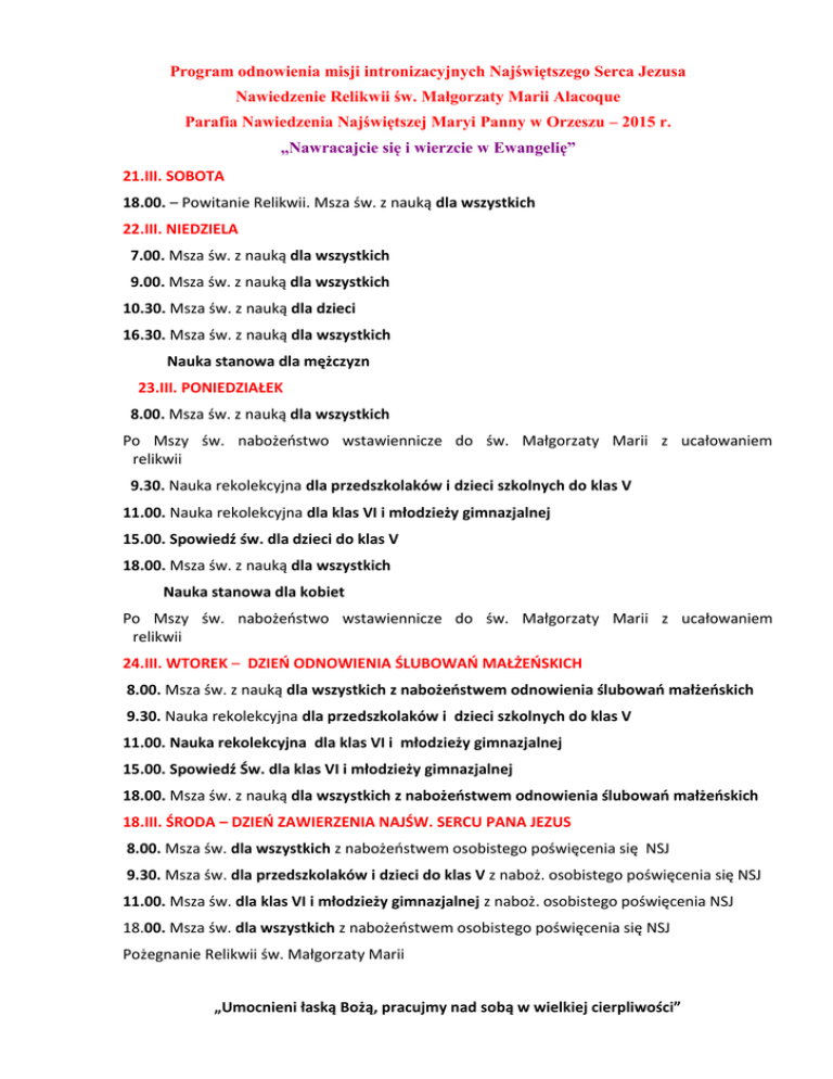 Program odnowienia misji intronizacyjnych Najświętszego Serca Jezusa Nawiedzenie Relikwii św. Małgorzaty Marii Alacoque Parafia Nawiedzenia Najświętszej Maryi Panny w Orzeszu – 2015 r. „Nawracajcie się i wierzcie w Ewangelię” 21.III. SOBOTA 18.00. – Powitanie Relikwii. Msza św. z nauką dla wszystkich 22.III. NIEDZIELA 7.00. Msza św. z nauką dla wszystkich 9.00. Msza św. z nauką dla wszystkich 10.30. Msza św. z nauką dla dzieci 16.30. Msza św. z nauką dla wszystkich Nauka stanowa dla mężczyzn 23.III. PONIEDZIAŁEK Niedziela 22 marca 8.00. Msza św. z nauką dla wszystkich Po Mszy św. nabożeństwo wstawiennicze do św. Małgorzaty Marii z ucałowaniem relikwii 9.30. Nauka rekolekcyjna dla przedszkolaków i dzieci szkolnych do klas V 11.00. Nauka rekolekcyjna dla klas VI i młodzieży gimnazjalnej 15.00. Spowiedź św. dla dzieci do klas V 18.00. Msza św. z nauką dla wszystkich Nauka stanowa dla kobiet Po Mszy św. nabożeństwo wstawiennicze do św. Małgorzaty Marii z ucałowaniem relikwii 24.III. WTOREK – DZIEŃ ODNOWIENIA ŚLUBOWAŃ MAŁŻEŃSKICH 8.00. Msza św. z nauką dla wszystkich z nabożeństwem odnowienia ślubowań małżeńskich 9.30. Nauka rekolekcyjna dla przedszkolaków i dzieci szkolnych do klas V 11.00. Nauka rekolekcyjna dla klas VI i młodzieży gimnazjalnej 15.00. Spowiedź Św. dla klas VI i młodzieży gimnazjalnej 18.00. Msza św. z nauką dla wszystkich z nabożeństwem odnowienia ślubowań małżeńskich 18.III. ŚRODA – DZIEŃ ZAWIERZENIA NAJŚW. SERCU PANA JEZUS 8.00. Msza św. dla wszystkich z nabożeństwem osobistego poświęcenia się NSJ 9.30. Msza św. dla przedszkolaków i dzieci do klas V z naboż. osobistego poświęcenia się NSJ 11.00. Msza św. dla klas VI i młodzieży gimnazjalnej z naboż. osobistego poświęcenia NSJ 18.00. Msza św. dla wszystkich z nabożeństwem osobistego poświęcenia się NSJ Pożegnanie Relikwii św. Małgorzaty Marii „Umocnieni łaską Bożą, pracujmy nad sobą w wielkiej cierpliwości”