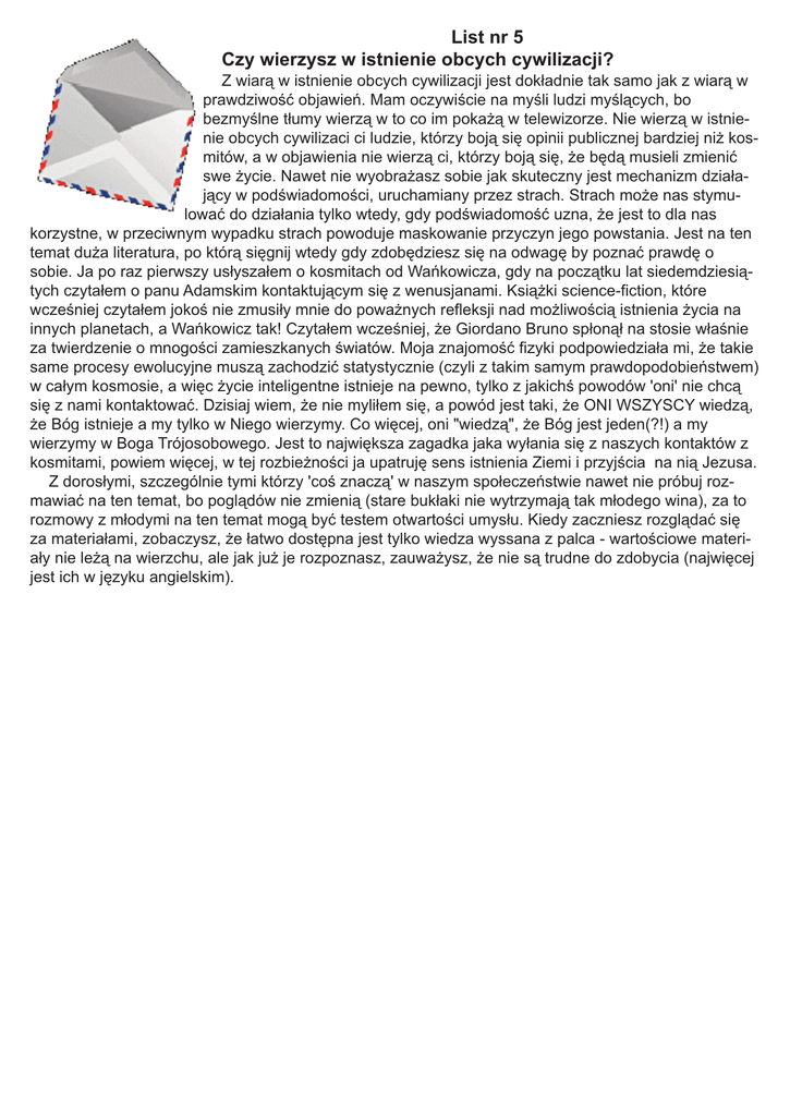 List nr 5 Czy wierzysz w istnienie obcych cywilizacji? Z wiarą w istnienie obcych cywilizacji jest dokładnie tak samo jak z wiarą w prawdziwość objawień. Mam oczywiście na myśli ludzi myślących, bo bezmyślne tłumy wierzą w to co im pokażą w telewizorze. Nie wierzą w istnienie obcych cywilizaci ci ludzie, którzy boją się opinii publicznej bardziej niż kosmitów, a w objawienia nie wierzą ci, którzy boją się, że będą musieli zmienić swe życie. Nawet nie wyobrażasz sobie jak skuteczny jest mechanizm działający w podświadomości, uruchamiany przez strach. Strach może nas stymulować do działania tylko wtedy, gdy podświadomość uzna, że jest to dla nas korzystne, w przeciwnym wypadku strach powoduje maskowanie przyczyn jego powstania. Jest na ten temat duża literatura, po którą sięgnij wtedy gdy zdobędziesz się na odwagę by poznać prawdę o sobie. Ja po raz pierwszy usłyszałem o kosmitach od Wańkowicza, gdy na początku lat siedemdziesiątych czytałem o panu Adamskim kontaktującym się z wenusjanami. Książki science-fiction, które wcześniej czytałem jokoś nie zmusiły mnie do poważnych refleksji nad możliwością istnienia życia na innych planetach, a Wańkowicz tak! Czytałem wcześniej, że Giordano Bruno spłonął na stosie właśnie za twierdzenie o mnogości zamieszkanych światów. Moja znajomość fizyki podpowiedziała mi, że takie same procesy ewolucyjne muszą zachodzić statystycznie (czyli z takim samym prawdopodobieństwem) w całym kosmosie, a więc życie inteligentne istnieje na pewno, tylko z jakichś powodów 'oni' nie chcą się z nami kontaktować. Dzisiaj wiem, że nie myliłem się, a powód jest taki, że ONI WSZYSCY wiedzą, że Bóg istnieje a my tylko w Niego wierzymy. Co więcej, oni "wiedzą", że Bóg jest jeden(?!) a my wierzymy w Boga Trójosobowego. Jest to największa zagadka jaka wyłania się z naszych kontaktów z kosmitami, powiem więcej, w tej rozbieżności ja upatruję sens istnienia Ziemi i przyjścia na nią Jezusa. Z dorosłymi, szczególnie tymi którzy 'coś znaczą' w naszym społeczeństwie nawet nie próbuj rozmawiać na ten temat, bo poglądów nie zmienią (stare bukłaki nie wytrzymają tak młodego wina), za to rozmowy z młodymi na ten temat mogą być testem otwartości umysłu. Kiedy zaczniesz rozglądać się za materiałami, zobaczysz, że łatwo dostępna jest tylko wiedza wyssana z palca - wartościowe materiały nie leżą na wierzchu, ale jak już je rozpoznasz, zauważysz, że nie są trudne do zdobycia (najwięcej jest ich w języku angielskim).