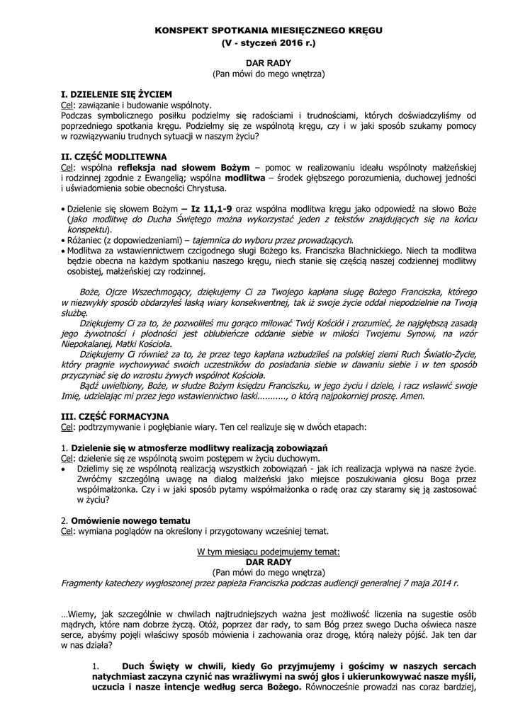 KONSPEKT SPOTKANIA MIESIĘCZNEGO KRĘGU (V - styczeń 2016 r.) DAR RADY (Pan mówi do mego wnętrza) I. DZIELENIE SIĘ ŻYCIEM Cel: zawiązanie i budowanie wspólnoty. Podczas symbolicznego posiłku podzielmy się radościami i trudnościami, których doświadczyliśmy od poprzedniego spotkania kręgu. Podzielmy się ze wspólnotą kręgu, czy i w jaki sposób szukamy pomocy w rozwiązywaniu trudnych sytuacji w naszym życiu? II. CZĘŚĆ MODLITEWNA Cel: wspólna refleksja nad słowem Bożym – pomoc w realizowaniu ideału wspólnoty małżeńskiej i rodzinnej zgodnie z Ewangelią; wspólna modlitwa – środek głębszego porozumienia, duchowej jedności i uświadomienia sobie obecności Chrystusa. • Dzielenie się słowem Bożym – Iz 11,1-9 oraz wspólna modlitwa kręgu jako odpowiedź na słowo Boże (jako modlitwę do Ducha Świętego można wykorzystać jeden z tekstów znajdujących się na końcu konspektu). • Różaniec (z dopowiedzeniami) – tajemnica do wyboru przez prowadzących. Modlitwa za wstawiennictwem czcigodnego sługi Bożego ks. Franciszka Blachnickiego. Niech ta modlitwa będzie obecna na każdym spotkaniu naszego kręgu, niech stanie się częścią naszej codziennej modlitwy osobistej, małżeńskiej czy rodzinnej. Boże, Ojcze Wszechmogący, dziękujemy Ci za Twojego kapłana sługę Bożego Franciszka, którego w niezwykły sposób obdarzyłeś łaską wiary konsekwentnej, tak iż swoje życie oddał niepodzielnie na Twoją służbę. Dziękujemy Ci za to, że pozwoliłeś mu gorąco miłować Twój Kościół i zrozumieć, że najgłębszą zasadą jego żywotności i płodności jest oblubieńcze oddanie siebie w miłości Twojemu Synowi, na wzór Niepokalanej, Matki Kościoła. Dziękujemy Ci również za to, że przez tego kapłana wzbudziłeś na polskiej ziemi Ruch Światło-Życie, który pragnie wychowywać swoich uczestników do posiadania siebie w dawaniu siebie i w ten sposób przyczyniać się do wzrostu żywych wspólnot Kościoła. Bądź uwielbiony, Boże, w słudze Bożym księdzu Franciszku, w jego życiu i dziele, i racz wsławić swoje Imię, udzielając mi przez jego wstawiennictwo łaski..........., o którą najpokorniej proszę. Amen. III. CZĘŚĆ FORMACYJNA Cel: podtrzymywanie i pogłębianie wiary. Ten cel realizuje się w dwóch etapach: 1. Dzielenie się w atmosferze modlitwy realizacją zobowiązań Cel: dzielenie się ze wspólnotą swoim postępem w życiu duchowym. Dzielimy się ze wspólnotą realizacją wszystkich zobowiązań - jak ich realizacja wpływa na nasze życie. Zwróćmy szczególną uwagę na dialog małżeński jako miejsce poszukiwania głosu Boga przez współmałżonka. Czy i w jaki sposób pytamy współmałżonka o radę oraz czy staramy się ją zastosować w życiu? 2. Omówienie nowego tematu Cel: wymiana poglądów na określony i przygotowany wcześniej temat. W tym miesiącu podejmujemy temat: DAR RADY (Pan mówi do mego wnętrza) Fragmenty katechezy wygłoszonej przez papieża Franciszka podczas audiencji generalnej 7 maja 2014 r. …Wiemy, jak szczególnie w chwilach najtrudniejszych ważna jest możliwość liczenia na sugestie osób mądrych, które nam dobrze życzą. Otóż, poprzez dar rady, to sam Bóg przez swego Ducha oświeca nasze serce, abyśmy pojęli właściwy sposób mówienia i zachowania oraz drogę, którą należy pójść. Jak ten dar w nas działa? 1. Duch Święty w chwili, kiedy Go przyjmujemy i gościmy w naszych sercach natychmiast zaczyna czynić nas wrażliwymi na swój głos i ukierunkowywać nasze myśli, uczucia i nasze intencje według serca Bożego. Równocześnie prowadzi nas coraz bardziej, byśmy kierowali wewnętrzne spojrzenie ku Jezusowi, jako wzorowi naszego sposobu działania i odnoszenia się do Boga Ojca i naszych braci. Duch Święty poprzez dar rady czyni nasze sumienie zdolnym do dokonania konkretnego wyboru w komunii z Bogiem, zgodnie z logiką Jezusa i Jego Ewangelii. W ten sposób Duch Święty pomaga nam wzrastać wewnętrznie, sprawia, że rozwijamy się pozytywnie, we wspólnocie i pomaga nam, byśmy nie zdawali się na łaskę i niełaskę egoizmu i swojego sposobu widzenia rzeczy. W ten sposób Duch Święty pomaga nam się rozwijać, a także żyć we wspólnocie. 2. Istotnym warunkiem zachowania tego daru jest modlitwa. Nieustannie powracamy do tego samego - nieprawdaż? - do modlitwy. Jest ona tak bardzo ważna! Chodzi o to, by modlić się tymi modlitwami, które wszyscy znamy od lat dziecięcych, ale także naszymi słowami: „Panie pomóż mi, doradź mi! Co powinienem teraz czynić?”. Przez modlitwę czynimy miejsce na przyjście Ducha Świętego, aby nam pomógł w danym momencie, doradził nam, co wszyscy powinniśmy czynić. Modlitwa. Nigdy nie zapominajmy o modlitwie! Nigdy! Nikt nie zauważa, gdy modlimy się w autobusie, idąc drogą, modlimy się milcząco, całym sercem. Wykorzystujmy te chwile na modlitwę, prosząc, aby Duch Święty obdarzył nas tym darem rady. W zażyłości z Bogiem i słuchaniu Jego Słowa powoli odkładamy na bok naszą logikę osobistą, podyktowaną najczęściej naszymi ograniczeniami, uprzedzeniami i naszymi ambicjami, a uczymy się natomiast proszenia Pana: czego pragniesz?; proszenia Pana o radę - a czynimy to poprzez modlitwę. W ten sposób dojrzewa w nas głęboka symfonia, niemal wrodzona w Duchu Świętym i doświadczamy, jak bardzo prawdziwe są słowa Jezusa zapisane w Ewangelii Mateusza: „Nie martwcie się o to, jak ani co macie mówić. W owej bowiem godzinie będzie wam poddane, co macie mówić, gdyż nie wy będziecie mówili, lecz Duch Ojca waszego będzie mówił przez was” (Mt 10,19-20). Jest to Duch, który nam doradza, ale musimy uczynić miejsce dla Ducha, aby nam doradzał, a to czynienie miejsca dokonuje się poprzez modlitwę, prosząc, aby przyszedł i nam zawsze pomagał. 3. Podobnie jak wszystkie inne dary Ducha Świętego także dar rady jest również skarbem dla ca