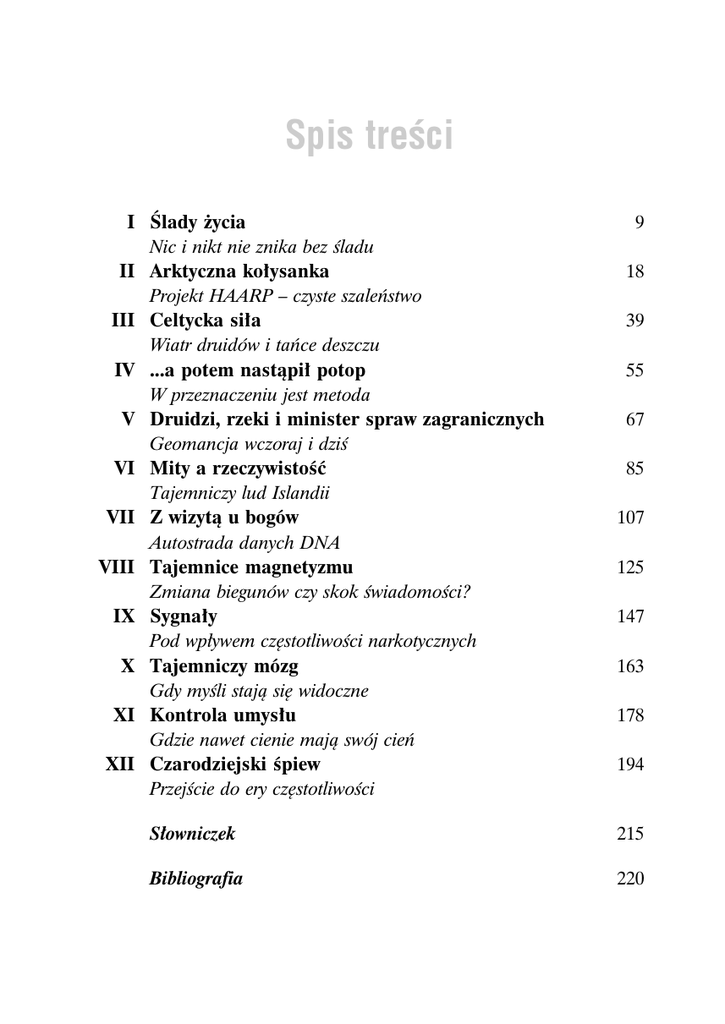 Słowniczek 7 Spis treœci I Ślady życia Nic i nikt nie znika bez śladu II Arktyczna kołysanka Projekt HAARP – czyste szaleństwo III Celtycka siła Wiatr druidów i tańce deszczu IV ...a potem nastąpił potop W przeznaczeniu jest metoda V Druidzi, rzeki i minister spraw zagranicznych Geomancja wczoraj i dziś VI Mity a rzeczywistość Tajemniczy lud Islandii VII Z wizytą u bogów Autostrada danych DNA VIII Tajemnice magnetyzmu Zmiana biegunów czy skok świadomości? IX Sygnały Pod wpływem częstotliwości narkotycznych X Tajemniczy mózg Gdy myśli stają się widoczne XI Kontrola umysłu Gdzie nawet cienie mają swój cień XII Czarodziejski śpiew Przejście do ery częstotliwości 9 18 39 55 67 85 107 125 147 163 178 194 Słowniczek 215 Bibliografia 220