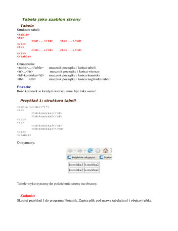 Tabela jako szablon strony Tabela Struktura tabeli: <table> <tr> <td>...</td> <td>...</td> <td>...</td> <td>...</td> </tr> <tr> </tr> </table> Oznaczenia: <table>....</table> <tr>...</tr> <td>komórka</td> <th> </th> znacznik początku i końca tabeli znacznik początku i końca wiersza znacznik początku i końca komórki znacznik początku i końca nagłówka tabeli Porada: Ilość komórek w każdym wierszu musi być taka sama! Przykład 1: struktura tabeli <table border=”1”> <tr> <td>komórka1</td> <td>komórka2</td> </tr> <tr> <td>komórka3</td> <td>komórka4<</td> </tr> </table> Otrzymamy: Tabele wykorzystamy do podzielenia strony na obszary. Zadanie: Skopiuj przykład 1 do programu Notatnik. Zapisz plik pod nazwą tabela.html i obejrzyj efekt. Przykład 2: Tabela jako szkielet strony www <html> <head> <meta http-equiv="Content-Type" content="text/html; windows-1250" /> <meta name="Description" content="Tu wpisz opis zawartości strony" /> <meta name="Keywords" content="Tu wpisz wyrazy kluczowe rozdzielone przecinkami" /> <meta name="Author" content="Tu wpisz swoje imię i nazwisko" /> <title>Strona nauczyciela</title> </head> <body> <table border=”1”> <tr> <td>Baner</td> <td>Logo</td> </tr> <tr> <td>Zapraszam na moją stronę</td> <td>Moja fotka</td> </tr> <tr> <td>Panel wyświetlania podstron</td> <td>Linki</td> </tr> <tr> <td colspan=”2”>Adres pocztowy autora strony</td> </tr> </table> </body> </html> Strona została podzielona na obszary tematyczne, w których uporządkujesz wprowadzane treści. Zadanie: Skopiuj przykład 2 do programu Notatnik i zmodyfikuj poprzednią tabelkę. Zapisz plik i obejrzyj efekt. Szkielet może wyglądać różnie, zależnie od potrzeb. W dalszej części zobaczysz inne propozycje. Teraz poznamy atrybuty tabeli. Atrybuty tabeli o border - do określenia ramki wokół całej tabelki o cellspacing - do określenia odstępu między komórkami o cellpadding - do określenia odstępu między zawartością komórki a jej brzegiem o width i height - do określenia rozmiaru tabeli Przykład 3: atrybuty tabeli <html> <head> <meta http-equiv="Content-Type" content="text/html; windows-1250" /> <meta name="Description" content="Tu wpisz opis zawartości strony" /> <meta name="Keywords" content="Tu wpisz wyrazy kluczowe rozdzielone przecinkami" /> <meta name="Author" content="Tu wpisz swoje imię i nazwisko" /> <title>Strona nauczyciela</title> </head> <body> <table cellspacing=3 cellpadding=5 width=100% height=100% border=”1”> <tr> <td>Baner</td> <td>Logo</td> </tr> <tr> <td>Zapraszam na moją stronę</td> <td>Moja fotka</td> </tr> <tr> <td>Panel wyświetlania podstron</td> <td>Linki</td> </tr> <tr> <td colspan=”2”>Adres pocztowy autora strony</td> </tr> </table> </body> </html> Zadanie: Do poprzedniego pliku dopisz atrybuty tabeli. Przykład 4: atrybuty dla rzędów i komórek o o height - wysokość rzędu bgcolor - kolor tła Dla komórek możemy określić: o width - szerokość komórki o bgcolor - kolor tła o align - sposób wyrównywania zawartości komórki (left, center, right) o valign - sposób wyrównywania zawartości komórki w pionie (top, center, bottom) <html> <head> <meta http-equiv="Content-Type" content="text/html; windows-1250" /> <meta name="Description" content="Tu wpisz opis zawartości strony" /> <meta name="Keywords" content="Tu wpisz wyrazy kluczowe rozdzielone przecinkami" /> <meta name="Author" content="Tu wpisz swoje imię i nazwisko" /> <title>Strona nauczyciela</title> </head> <body> <table cellspacing=0 cellpadding=2 width=100% height=100% border=”1”> <tr bgcolor=#ffffcc height=60px> <td>Baner</td> <td>Logo</td> </tr> <tr> <td bgcolor=#fff9e5 valign=bottom align=center width=80% height=50px>Zapraszam na moją stronę</td> <td>Moja fotka</td> </tr> <tr> <td valign=top>Panel wyświetlania podstron</td> <td>Linki</td> </tr> <tr> <td colspan=”2” height=20px valign=middle align=center >Adres pocztowy autora strony</td> </tr> </table> </body> </html> Zadanie: Skopiuj przykład 4 do poprzedniej tabeli, zapisz i obejrzyj efekt. Zauważ różnice w wielkości komórek i w rozmieszczeniu w nich tekstu. Łączenie komórek Ostatnia komórka zbudowana jest z dwóch połączonych razem. Połączenie uzyskujemy przy użyciu wartości: o colspan - to połączenia kilku komórek znajdujących się w sąsiadujących kolumnach np. colspan=”2” o rowspan - to połączenia kilku komórek znajdujących się w sąsiadujących rzędach Przykład 5: łączenie komórek <html> <head> <meta http-equiv="Content-Type" content="text/html; windows-1250" /> <meta name="Description" content="Tu wpisz opis zawartości strony" /> <meta name="Keywords" content="Tu wpisz wyrazy kluczowe rozdzielone przecinkami" /> <meta name="Author" content="Tu wpisz swoje imię i nazwisko" /> <title>Strona nauczyciela</title> </head> <body> <table cellspacing=2 cellpadding=2 border=1 width=100% height=100%> <tr> <td>1</td> <td>2</td> <td>3</td> </tr> <tr> <td colspan=2>3</td> <td rowspan=2>4</td> </tr> </table> </body> </html> Zadanie: Wykonaj łączenia komórek, tak aby otrzymać następujący efekt; Zadanie zaliczeniowe: Na podstawie materiału zawartego w lekcji zbuduj szkielet strony w postaci tabeli wg wzoru. Ustawienie i łączenie komórek wg własnego pomysłu.