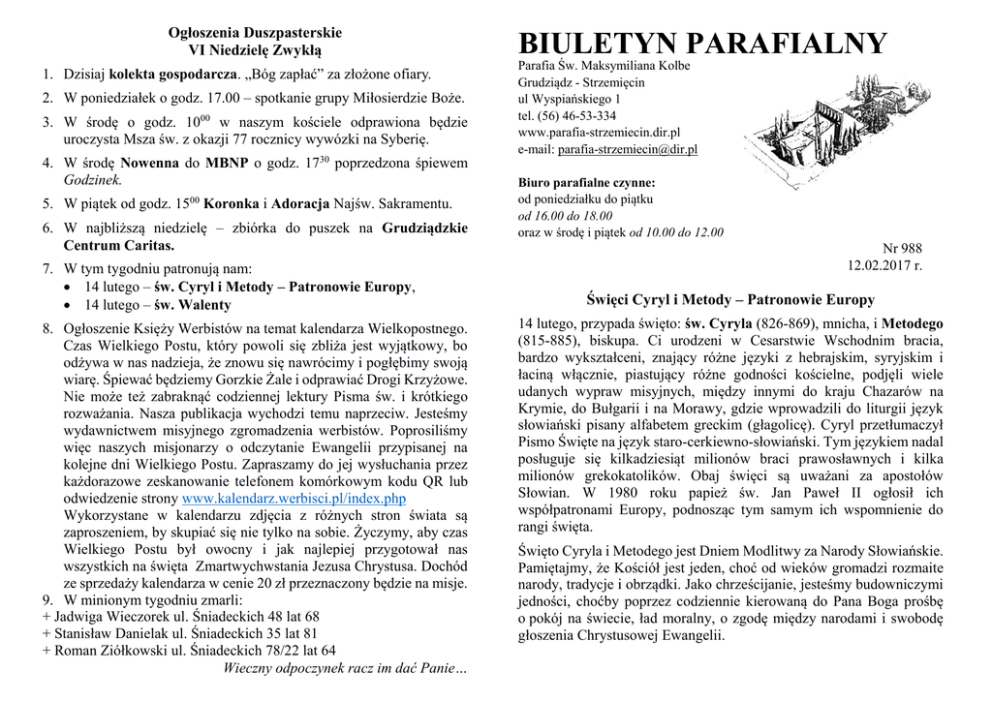 Ogłoszenia Duszpasterskie VI Niedzielę Zwykłą 1. Dzisiaj kolekta gospodarcza. „Bóg zapłać” za złożone ofiary. 2. W poniedziałek o godz. 17.00 – spotkanie grupy Miłosierdzie Boże. 3. W środę o godz. 1000 w naszym kościele odprawiona będzie uroczysta Msza św. z okazji 77 rocznicy wywózki na Syberię. 4. W środę Nowenna do MBNP o godz. 1730 poprzedzona śpiewem Godzinek. 5. W piątek od godz. 1500 Koronka i Adoracja Najśw. Sakramentu. 6. W najbliższą niedzielę – zbiórka do puszek na Grudziądzkie Centrum Caritas. 7. W tym tygodniu patronują nam: 14 lutego – św. Cyryl i Metody – Patronowie Europy, 14 lutego – św. Walenty 8. Ogłoszenie Księży Werbistów na temat kalendarza Wielkopostnego. Czas Wielkiego Postu, który powoli się zbliża jest wyjątkowy, bo odżywa w nas nadzieja, że znowu się nawrócimy i pogłębimy swoją wiarę. Śpiewać będziemy Gorzkie Żale i odprawiać Drogi Krzyżowe. Nie może też zabraknąć codziennej lektury Pisma św. i krótkiego rozważania. Nasza publikacja wychodzi temu naprzeciw. Jesteśmy wydawnictwem misyjnego zgromadzenia werbistów. Poprosiliśmy więc naszych misjonarzy o odczytanie Ewangelii przypisanej na kolejne dni Wielkiego Postu. Zapraszamy do jej wysłuchania przez każdorazowe zeskanowanie telefonem komórkowym kodu QR lub odwiedzenie strony www.kalendarz.werbisci.pl/index.php Wykorzystane w kalendarzu zdjęcia z różnych stron świata są zaproszeniem, by skupiać się nie tylko na sobie. Życzymy, aby czas Wielkiego Postu był owocny i jak najlepiej przygotował nas wszystkich na święta Zmartwychwstania Jezusa Chrystusa. Dochód ze sprzedaży kalendarza w cenie 20 zł przeznaczony będzie na misje. 9. W minionym tygodniu zmarli: + Jadwiga Wieczorek ul. Śniadeckich 48 lat 68 + Stanisław Danielak ul. Śniadeckich 35 lat 81 + Roman Ziółkowski ul. Śniadeckich 78/22 lat 64 Wieczny odpoczynek racz im dać Panie… BIULETYN PARAFIALNY Parafia Św. Maksymiliana Kolbe Grudziądz - Strzemięcin ul Wyspiańskiego 1 tel. (56) 46-53-334 www.parafia-strzemiecin.dir.pl e-mail: [email protected] Biuro parafialne czynne: od poniedziałku do piątku od 16.00 do 18.00 oraz w środę i piątek od 10.00 do 12.00 Nr 988 12.02.2017 r. Święci Cyryl i Metody – Patronowie Europy 14 lutego, przypada święto: św. Cyryla (826-869), mnicha, i Metodego (815-885), biskupa. Ci urodzeni w Cesarstwie Wschodnim bracia, bardzo wykształceni, znający różne języki z hebrajskim, syryjskim i łaciną włącznie, piastujący różne godności kościelne, podjęli wiele udanych wypraw misyjnych, między innymi do kraju Chazarów na Krymie, do Bułgarii i na Morawy, gdzie wprowadzili do liturgii język słowiański pisany alfabetem greckim (głagolicę). Cyryl przetłumaczył Pismo Święte na język staro-cerkiewno-słowiański. Tym językiem nadal posługuje się kilkadziesiąt milionów braci prawosławnych i kilka milionów grekokatolików. Obaj święci są uważani za apostołów Słowian. W 1980 roku papież św. Jan Paweł II ogłosił ich współpatronami Europy, podnosząc tym samym ich wspomnienie do rangi święta. Święto Cyryla i Metodego jest Dniem Modlitwy za Narody Słowiańskie. Pamiętajmy, że Kościół jest jeden, choć od wieków gromadzi rozmaite narody, tradycje i obrządki. Jako chrześcijanie, jesteśmy budowniczymi jedności, choćby poprzez codziennie kierowaną do Pana Boga prośbę o pokój na świecie, ład moralny, o zgodę między narodami i swobodę głoszenia Chrystusowej Ewangelii. Św. Walenty – patron zakochanych Walenty był biskupem Terni w Umbrii. Wiadomości o nim są dość skąpe i niejednoznaczne. Żył w III w. i był kapłanem rzymskim. Tam w czasie prześladowań (Klaudiusza II Gota), wraz ze św. Mariuszem i krewnymi, asystował męczennikom w czasie ich procesów i egzekucji. Wkrótce sam został pojmany i doprowadzony do prefekta Rzymu, który przeprowadził rutynowy proces polegający na wymuszaniu odstępstwa od Chrystusa. W tym celu kazał użyć kijów. Ponieważ nie przyniosło to oczekiwanego rezultatu, kazał ściąć Walentego. Stało się to 14 lutego 269 roku. Pochowano go w Rzymie przy via Flaminia. Jego grób już w IV w. otoczony był szczególną czcią. Nad grobem papież Juliusz I wystawił bazylikę pod wezwaniem św. Walentego. Bazylika wraz z grobem św. Walentego stała się prawdziwym sanktuarium i jednym z pierwszych miejsc pielgrzymkowych. W średniowieczu na terenie niemieckim Święty był wzywany jako orędownik podczas ciężkich chorób, zwłaszcza nerwowych i epilepsji. Na Zachodzie, zwłaszcza w Anglii i Stanach Zjednoczonych, czczono św. Walentego jako patrona zakochanych. W ikonografii św. Walenty przedstawiany jest jako kapłan w ornacie, z kielichem w lewej ręce, a z mieczem w prawej, także w stroju biskupa uzdrawiającego chłopca z padaczki. INTENCJE 13.02.2017r. – 19.02.2017r. Poniedziałek 13.02.17r. 700 + mama Helena Sala – gregorianka 830 + Edmund (w 22 r. śm.), żona Jadwiga Buchwałd i zmarli z rodziny 830 + Andrzej Woźniak (w 2 r. śm.) Ireneusz i Jerzy Woźniak oraz rodzice: Wanda i Józef Strzelczyk 1800 + Marian Zalewski (w 14 r. śm.), rodzice i bracia z rodziny Zarębskich 00 18 + rodzice: Kazimierz (w dniu urodzin) Leokadia i brat Stefan Sikorscy; zmarli z rodziny Sikorskich i Bartlewicz oraz ks. Jan Wtorek 14.02.17r. 700 830 + mąż Stanisław Krzemiński (w 28 r. śm), rodzice z obojga stron i rodzeństwo 830 W dniu urodzin syna Michała o błogosławieństwo Boże i opiekę dla całej rodziny 1800 + mama Helena Sala – gregorianka 00 18 + Teodor Piskorowski (w dniu urodzin) i Marianna Zdanowicz Środa 15.02.17 r. 700 830 + mama Helena Sala – gregorianka 830 + Janina Królikowska (w 5 r. śm.) i zmarli z rodzin z obojga stron 00 10 W intencji Sybiraków 1800 + Jolanta Habryn (w 20 r. śm.), Waleria i Józef Habryn 1800 + Romuald Skonieczny (w 11 r. śm.), zmarli rodzice z obojga stron i zmarli z rodziny