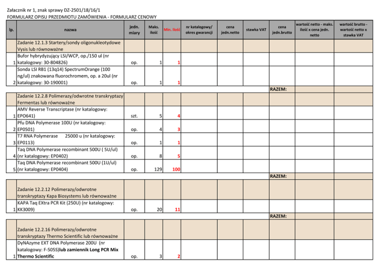 Załacznik nr 1, znak sprawy DZ-2501/18/16/1 FORMULARZ OPISU PRZEDMIOTU ZAMÓWIENIA - FORMULARZ CENOWY lp. nazwa Zadanie 12.1.3 Startery/sondy oligonukleotydowe Vysis lub równoważne Bufor hybrydyzujący LSI/WCP, op./150 ul (nr 1 katalogowy: 30-804826) Sonda LSI RB1 (13q14) SpectrumOrange (100 ng/ul) znakowana fluorochromem, op. a 20ul (nr 2 katalogowy: 30-190001) jedn. miary Maks. ilość Min. ilość op. 1 1 op. 1 1 nr katalogowy/ okres gwarancji cena jedn.netto stawka VAT cena jedn.brutto RAZEM: 1 2 3 4 5 Zadanie 12.2.8 Polimerazy/odwrotne transkryptazy Fermentas lub równoważne AMV Reverse Transcriptase (nr katalogowy: EPO641) Pfu DNA Polymerase 100U (nr katalogowy: EP0501) T7 RNA Polymerase 25000 u (nr katalogowy: EP0113) Taq DNA Polymerase recombinant 500U ( 5U/ul) (nr katalogowy: EP0402) Taq DNA Polymerase recombinant 500U (1U/ul) (nr katalogowy: EP0404) szt. 5 4 op. 4 3 op. 1 1 op. 8 5 op. 129 100 RAZEM: Zadanie 12.2.12 Polimerazy/odwrotne transkryptazy Kapa Biosystems lub równoważne KAPA Taq EXtra PCR Kit (250U) (nr katalogowy: 1 KK3009) op. 20 11 RAZEM: Zadanie 12.2.16 Polimerazy/odwrotne transkryptazy Thermo Scientific lub równoważne DyNAzyme EXT DNA Polymerase 200U (nr katalogowy: F-505S)lub zamiennik Long PCR Mix 1 Thermo Scientific op. 3 2 wartość netto - maks. ilość x cena jedn. netto wartość brutto wartość netto x stawka VAT DyNazyme II DNA Polimerase 250U (nr 2 katalogowy: F-501S) op. 20 5 Phusion Hot Start II High-Fidelity Polymerase, 3 op./100 U (nr katalogowy: F-549S) op. 5 1 RAZEM: Zadanie 12.2.22 Polimerazy/odwrotne transkryptazy Promega lub równoważne AMV Reverse transcriptase (HC) (nr katalogowy: 1 M9004) GoTaq Flexi DNA Polymerase 500u (nr katalogowy: 2 M8305) op. 4 4 op. 2 2 RAZEM: Zadanie 12.3.12 Pozostałe odczynniki do reakcji PCR, RT-PCR MP Biomedicals lub równoważne DNA OFF MP Biomedicals op/500 ml (nr 1 katalogowy: QD0500) 2 DNA-Erase 500ml (nr katalogowy: 821805) WATER, DNase, RNase - FREE (nr katalogowy: 3 04821739) op. op. 8 8 3 8 op. 10 10 RAZEM: 1 2 3 4 Zadanie 12.3.16 Pozostałe odczynniki do reakcji PCR, RT-PCR Promega lub równoważne DNA IQ TM Resin (nr katalogowy: A8251) Magnesium Chloride (MgCl2) 25 mM, op/25 ml, (nr katalogowy: A3513) Nuclease-Free water (nr katalogowy: P1193) PCR Master Mix (nr katalogowy: M7502) 5 PCR Nucleotide Mix, 200 ul (nr katalogowy: C1141) TE Buffer, 1x, molecular Grade 100ml (nr 6 katalogowy: V6231) op 2 2 op op. op. 2 1 13 2 1 10 op. 2 2 op. 1 1 RAZEM: Zadanie 12.3.18 Pozostałe odczynniki do reakcji PCR, RT-PCR Roche lub równoważne LightCycler 480 Probes Master (nr katalogowy: 1 04707494001) szt 3 3 Transcriptor One-Step RT-PCR Kit 150 Rx (nr 2 katalogowy: 04655885001) op. 11 8 RAZEM: Zadanie 12.3.18.1 Pozostałe odczynniki do reakcji PCR, RT-PCR Roche lub równoważne 1 SuRE Cut Buffer M (nr katalogowy: 11417983001) op. 2 2 RAZEM: Zadanie 12.4.7 Klonowanie/enzymy restrykcyjne/bakterie kompetentne/wektory New England Biolabs lub równoważne 1 AflII (2000) (nr katalogowy: R0520S) 2 AluI (1000 U) (nr katalogowy: R0137S) op. op. 3 3 3 3 3 AVA I, op. 2000U + bufor (nr katalogowy: R0152S) 4 BsiEI (nr katalogowy: R0554S) 5 BsmAI (1000 U) (nr katalogowy: R0529S) CutSmart Buffer, 10x, 5 ml (nr katalogowy: 6 B7204S) op. op. op. 4 3 4 4 3 4 op. 10 5 Enzym restrykcyjny AccI (nr katalogowy: R0161L) HaeII 2000 U (nr katalogowy: R0107S) HaeIII (3000 U) (nr katalogowy: R0108S) HhaI (nr katalogowy: R0139S) HinfI (5000 U) (nr katalogowy: R0155S) MboII (300 U) (nr katalogowy: R0148S) MseI (500 U) (nr katalogowy: R0525S) NciI (2000 U) (nr katalogowy: R0196S) SalI (nr katalogowy: R0138S) Sau3AI 200 U (nr katalogowy: R0169S) Sau96I 1000 U (nr katalogowy: R0165S) SmaI (2000 U) (nr katalogowy: R0141S) TaqI (nr katalogowy: R0149S) op op. op. 1 4 4 4 4 4 8 4 2 8 4 4 4 1 4 4 4 4 4 5 4 2 5 4 4 4 7 8 9 10 11 12 13 14 15 16 17 18 19 op. op. op. op. op. op. op. op. op. RAZEM: Zadanie 12.6.6 Zestawy do PCR, RT-PCR, Real_time PCR PROMEGA lub równoważne GoTaq G2 Green Master Mix 100 reakcji (nr 1 katalogowy: M7822) op. 25 15 RAZEM: 1 2 3 4 Zadanie 12.6.12 Zestawy do PCR, RT-PCR, Real_time PCR Roche lub równoważne FastStart PCR Master, op/10 ml (nr katalogowy: 04710444001) FastStart Universal Probe Master 12.5 ml (nr katalogowy: 04913957001) LightCycler TaqMan Master (96) (nr katalogowy: 04535286001) Universal ProbeLibrary Probe 162 (nr katalogowy: 04694490001) op 4 2 op. 21 15 op. 66 50 op. 21 15 RAZEM: Zadanie 12.6.20 Zestawy do PCR, RT-PCR, Real_time PCR Fermentas lub równoważne Maxima Hot Start PCR Master Mix 10x 1.25 ml, op. 1 500 reakcji 50 ul (nr katalogowy: K1052) RevertAid First Strand cDNA Synthesis Kit (nr 2 katalogowy: K1622 ) op. 9 9 op. 14 1 RAZEM: Zadanie 12.6.22 zestawy do PCR, RT-PCR, Real_time PCR Tetracore lub równoważne EZ-PRRSV MPX 4.0 Master Mix and Enzyme 1 (96rxns) (nr katalogowy: TC-9060-096) op. 7 5 RAZEM: Zadanie 12.7.2 Zestawy do izolacji DNA RNA oczyszczania z żelu Promega lub równoważne DNA IQtm System KIT Promega, 100 reakcji (nr 1 katalogowy: DC6701) Tissue and Hair Extraction Kit (for use with DNA IQ) 2 na 100 reakcji (nr katalogowy: DC6740) Wizard DNA Clean-Up System (nr katalogowy: 3 A7280 ) Wizard Magnetic DNA Purification System for Food 4 (nr katalogowy: FF3750) op. 35 20 op. 4 4 op. 3 3 op. 2 2 RAZEM: Zadanie 12.7.20 Zestawy do izolacji DNA RNA oczyszczania z żelu Kucharczyk lub równoważne Akrylamidy do SSCP 30% (15% glicerol),29:1, 500 1 ml (nr katalogowy: 200-132) 2 Bufor 10x TBE, 1 litr (nr katalogowy: 200-150) op. op. 2 11 2 8 RAZEM: 1 2 3 4 Zadanie 12.11.3 Inne PRONA lub równoważne Agaroza BASICA LE GQT, op./100 g (nr katalogowy: BGQT1000) Agaroza Basica LE, op./500g (nr katalogowy: BLE500) Agaroza Micropor Gamma 100g (nr katalogowy: MG100) agaroza Micropor NU op./100g (nr katalogowy: MN100) op. 4 4 op 6 4 op. 1 1 op. 2 2 RAZEM: Zadanie 12.11.7 Inne A&A Biotechnology lub równoważne Proteinaza K 20 mg/ml roztwór (nr katalogowy: 1 1019-20) op 18 12 RAZEM: Zadanie 12.11