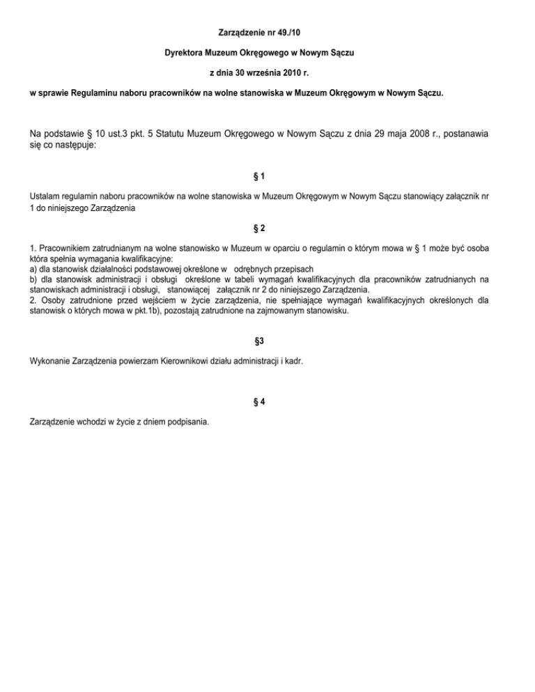 Zarządzenie nr 49./10 Dyrektora Muzeum Okręgowego w Nowym Sączu z dnia 30 września 2010 r. w sprawie Regulaminu naboru pracowników na wolne stanowiska w Muzeum Okręgowym w Nowym Sączu. Na podstawie § 10 ust.3 pkt. 5 Statutu Muzeum Okręgowego w Nowym Sączu z dnia 29 maja 2008 r., postanawia się co następuje: §1 Ustalam regulamin naboru pracowników na wolne stanowiska w Muzeum Okręgowym w Nowym Sączu stanowiący załącznik nr 1 do niniejszego Zarządzenia §2 1. Pracownikiem zatrudnianym na wolne stanowisko w Muzeum w oparciu o regulamin o którym mowa w § 1 może być osoba która spełnia wymagania kwalifikacyjne: a) dla stanowisk działalności podstawowej określone w odrębnych przepisach b) dla stanowisk administracji i obsługi określone w tabeli wymagań kwalifikacyjnych dla pracowników zatrudnianych na stanowiskach administracji i obsługi, stanowiącej załącznik nr 2 do niniejszego Zarządzenia. 2. Osoby zatrudnione przed wejściem w życie zarządzenia, nie spełniające wymagań kwalifikacyjnych określonych dla stanowisk o których mowa w pkt.1b), pozostają zatrudnione na zajmowanym stanowisku. §3 Wykonanie Zarządzenia powierzam Kierownikowi działu administracji i kadr. §4 Zarządzenie wchodzi w życie z dniem podpisania. Załącznik Nr 1 do zarządzenia Nr49/10 Dyrektora Muzeum Okręgowego w Nowym Sączu z dnia 30 września 2010 REGULAMIN NABORU PRACOWNIKÓW NA WOLNE STANOWISKA W MUZEUM OKRĘGOWYM W NOWYM SĄCZU Rozdział I Zasady ogólne §1 1. Cel Regulaminu: celem Regulaminu jest ustalenie zasad zatrudniania na podstawie umowy o pracę, na wolnych stanowiskach, , w oparciu o otwarty i konkurencyjny nabór. 2. Zakres Regulaminu: Regulamin reguluje zasady naboru pracowników na wolne stanowiska, zatrudnianych na podstawie umowy o pracę z wyłączeniem stanowisk:, a) przesunięcia pracownika zatrudnionego w Muzeum, posiadającego kwalifikacje wymagane na danym stanowisku - na mocy porozumienia, b) pomocniczych i obsługi oraz zatrudnianych sezonowo do obsługi ekspozycji (m.in. opiekun ekspozycji, pomoc muzealna, przewodnik, robotnik gospodarczy), c) pracowników zatrudnianych na zastępstwo w związku z usprawiedliwioną nieobecnością pracownika Muzeum d) pracowników zatrudnianych w drodze awansu wewnętrznego. 3. Ilekroć w Regulaminie jest mowa o: a) Dyrektorze – rozumie się przez to Dyrektora Muzeum Okręgowego w Nowym Sączu b) Komisji – rozumie się przez Komisję Rekrutacyjną powołaną zarządzeniem przez Dyrektora Muzeum Okręgowego w Nowym Sączu §2 Rozdział II Podjęcie decyzji o rozpoczęciu procedury rekrutacyjnej na wolne stanowisko urzędnicze §2 1. Kierownicy komórek organizacyjnych w Muzeum zobowiązani są do stałego monitorowania potrzeb kadrowych i prognozowania mogących wyniknąć w niedalekiej przyszłości wakatów. 2. Potrzeba stworzenia nowego stanowiska pracy może powstać w szczególności w wyniku: a) planowanych zmian w strukturze organizacyjnej Muzeum, b) zmiany przepisów nakładających na Muzeum nowe kompetencje i zadania, c) analizy zmian związanych z ruchem w ramach zasobów kadrowych (przejście na emeryturę, rentę itp.), 3. Decyzję o konieczności zatrudnienia pracownika podejmuje Dyrektor w oparciu o uzasadniony pisemny wniosek złożony przez Kierownika komórki organizacyjnej o wakującym stanowisku. 4. Przed podjęciem decyzji o wszczęciu procedury naboru zewnętrznego Dyrektor w ramach prowadzonej polityki kadrowej dokonuje analizy możliwości przeprowadzenia naboru wewnętrznego spośród zatrudnionych w Muzeum pracowników, spełniających wymogi formalne. 5. W przypadku podjęcia przez Dyrektora decyzji o konieczności wszczęcia procedury naboru zewnętrznego, Kierownik komórki organizacyjnej zobligowany jest do przedłożenia do akceptacji przez Dyrektora projektu opisu stanowiska na wakujące miejsce pracy oraz zakres czynności. Wzór formularza opisu stanowiska stanowi załącznik nr 1 do Regulaminu. 6. Opis stanowiska pracy, o którym mowa w ust. 5, zawiera: a) dokładne określenie celów i zadań wykonywanych na danym stanowisku pracy oraz wynikających z tego tytułu obowiązków obciążających pracownika zajmującego to stanowisko, b) określenie szczegółowych wymagań w zakresie kwalifikacji, umiejętności i predyspozycji wobec osób, które je zajmują, c) określenie uprawnień służących do wykonywania zadań oraz niezbędnego wyposażenia, d) określenie odpowiedzialności, e) inne wyznaczniki określające indywidualny charakter danego stanowiska pracy. 7. Akceptacja projektu opisu stanowiska pracy oraz zgoda Dyrektora powodują rozpoczęcie procedury naboru kandydatów na wolne stanowisko. Rozdział III Etapy naboru Nabór obejmuje: 1. Powołanie Komisji Rekrutacyjnej §3 2. Ogłoszenie o naborze na wolne stanowisko. 3. Składanie dokumentów aplikacyjnych. 4. Selekcja końcowa kandydatów może być przeprowadzana na podstawie: a) testu kwalifikacyjnego, b) rozmowy kwalifikacyjnej. 5. Sporządzenie protokołu z przeprowadzonego naboru na dane stanowisko. 6. Podjęcie decyzji o zatrudnieniu i podpisanie umowy o pracę. 7. Ogłoszenie wyników naboru. Rozdział IV Powołanie Komisji Rekrutacyjnej §4 1. Procedurę naboru prowadzi Komisja, powoływana każdorazowo przez Dyrektora, w składzie: a) Z-ca Dyrektora lub inna upoważniona przez Dyrektora osoba – Przewodniczący Komisji, b) Kierownik Działu Administracji i Kadr - Sekretarz Komisji. c) Kierownik Działu właściwy merytorycznie ze względu na stanowisko, do którego przeprowadza się nabór. 2. Dyrektor, jeżeli uzna to za uzasadnione, może uzupełnić skład Komisji o dodatkową osobę posiadającą niezbędne kwalifikacje, wiedzę lub doświadczenie, które mogą być przydatne podczas prowadzenia naboru. 3. Komisja pracuje w składzie co najmniej 3 osobowym. 4. W skład Komisji nie może być powołana osoba, która jest małżonkiem, krewnym lub powinowatym do drugiego stopnia włącznie osoby