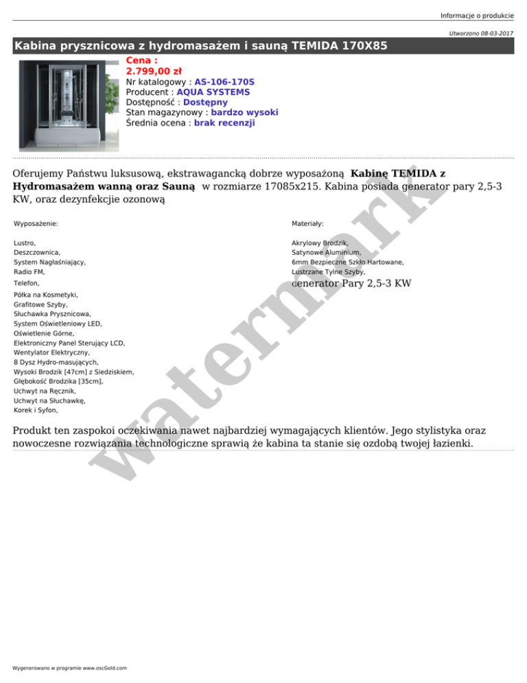 Informacje o produkcie Utworzono 08-03-2017 Kabina prysznicowa z hydromasażem i sauną TEMIDA 170X85 Cena : 2.799,00 zł Nr katalogowy : AS-106-170S Producent : AQUA SYSTEMS Dostępność : Dostępny Stan magazynowy : bardzo wysoki Średnia ocena : brak recenzji Wyposażenie: er m ar k Oferujemy Państwu luksusową, ekstrawagancką dobrze wyposażoną Kabinę TEMIDA z Hydromasażem wanną oraz Sauną w rozmiarze 17085x215. Kabina posiada generator pary 2,5-3 KW, oraz dezynfekcjie ozonową Materiały: Lustro, Deszczownica, System Nagłaśniający, Radio FM, Akrylowy Brodzik, Satynowe Aluminium, 6mm Bezpieczne Szkło Hartowane, Lustrzane Tylne Szyby, Generator Telefon, at Półka na Kosmetyki, Grafitowe Szyby, Słuchawka Prysznicowa, System Oświetleniowy LED, Oświetlenie Górne, Elektroniczny Panel Sterujący LCD, Wentylator Elektryczny, 8 Dysz Hydro-masujących, Wysoki Brodzik [47cm] z Siedziskiem, Głębokość Brodzika [35cm], Uchwyt na Ręcznik, Uchwyt na Słuchawkę, Korek i Syfon, Pary 2,5-3 KW w Produkt ten zaspokoi oczekiwania nawet najbardziej wymagających klientów. Jego stylistyka oraz nowoczesne rozwiązania technologiczne sprawią że kabina ta stanie się ozdobą twojej łazienki. Wygenerowano w programie www.oscGold.com