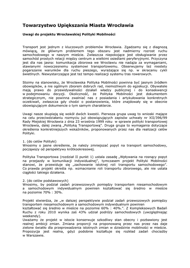 Towarzystwo Upiększania Miasta Wrocławia Uwagi do projektu Wrocławskiej Polityki Mobilności Transport jest jednym z kluczowych problemów Wrocławia. Zgadzamy się z diagnozą mówiącą, że głównym problemem tego obszaru jest nadmierny rozrost ruchu samochodowego w naszym mieście. Zwłaszcza niepokojące jest obsługiwanie przez samochód prostych relacji między centrum a wielkimi osiedlami peryferyjnymi. Przyczyna jest dla nas jasna: komunikacja zbiorowa we Wrocławiu nie nadąża za wymaganiami, stawianymi nowoczesnemu systemowi transportowemu. Obserwujemy też niestety pogarszanie warunków dla ruchu pieszego, wyrażające się np. w skracaniu cykli świetlnych. Niewystarczające jest też tempo realizacji systemu tras rowerowych. Stoimy na stanowisku, że Wrocławska Polityka Mobilności powinna być jasnym źródłem obowiązków, a nie ogólnym zbiorem dobrych rad, niemożliwym do egzekucji. Obywatele mają prawo do przewidywalności działań władzy publicznej i do konsekwencji w podejmowaniu decyzji. Okoliczność, że Polityka Mobilności jest dokumentem strategicznym, nie powinna zwalniać nas z posiadania i artykułowania konkretnych oczekiwań, zwłaszcza gdy chodzi o postanowienia, które znajdowały się w obecnie obowiązującym dokumencie o tym samym charakterze. Uwagi nasze skupiają się wokół dwóch kwestii. Pierwsza grupa uwag to wnioski mające na celu przeciwdziałaniu rozmyciu już obowiązujących zapisów uchwały nr XII/396/99 Rady Miejskiej Wrocławia z dnia 23 września 1999 roku w sprawie polityki transportowej Wrocławia, dalej zwaną „Polityką Transportową”. Druga grupa to wymagania dotyczące określenia konkretniejszych wskaźników, proponowanych przez nas dla realizacji celów Polityki. 1. (do celów Polityki) Wnosimy o jasne określenie, że należy zmniejszać popyt na transport samochodowy, począwszy od perspektywy krótkookresowej. Polityka Transportowa (rozdział II punkt 1) ustala zasadę „Wpływania na rosnący popyt na przejazdy w komunikacji indywidualnej”, tymczasem projekt Polityki Mobilności stanowi, że przewiduje się „zachowanie istotnej roli transportu samochodowego”. Co prawda projekt określa np. wzmacnianie roli transportu zbiorowego, ale nie ustala ciągłości takiego działania. 2. (do celów podstawowych) Wnosimy, by podział zadań przewozowych pomiędzy transportem niesamochodowym a samochodowym indywidualnym powinien kształtować się średnio w mieście na poziomie 70% : 30%. Projekt stwierdza, że „w dalszej perspektywie podział zadań przewozowych pomiędzy transportem niesamochodowym a samochodowym indywidualnym powinien kształtować się średnio w mieście na poziomie 60% : 40%.”. Z Kompleksowych Badań Ruchu z roku 2010 wynika zaś 43% udział podróży samochodowych (uwzględniając weekendy). Uważamy że projekt w istocie konserwuje szkodliwy stan obecny i pozbawiony jest realnej ambicji zmian. Zmiana proporcji na proponowaną przez nas przez nas daje zielone światło dla przeprowadzenia istotnych zmian w dziedzinie mobilności w mieście. Propozycja jest realna, gdyż podobnie kształtuje się rozkład zadań chociażby w Warszawie. 3. (do celów podstawowych) Wnosimy, by perspektywą długoterminową dla podziału zadań przewozowych był rok 2020. Projekt stwierdza, że „w dalszej perspektywie podział zadań przewozowych pomiędzy transportem niesamochodowym a samochodowym indywidualnym powinien kształtować się średnio w mieście na poziomie 60% : 40%.”, jednakże nie przewiduje żadnego roku, w jakim miałaby być osiągnięta, przez co jest niejasna i nie daje żadnej pewności wdrożenia. Rok 2020 to do tego rok docelowy strategii Wrocław 2020+. 4. (do celów podstawowych) Wnosimy o określenie perspektywy śródokresowej dla podziału zadań przewozowych na rok 2017 oraz wskaźnika 65% : 35% dla odpowiednio transportu niesamochodowego i samochodowego indywidualnego. W ten sposób, za pomocą jasnych i określonych czasowo kryteriów, Polityka Mobilności jest w stanie być busolą dla władz miejskich i obywateli. Przy wyznaczaniu dalekich celów należy też określać punkty kontrolne, by jasno móc oceniać stan ich realizacji. 4 lata to perspektywa kadencji władz samorządowych. 5. (do celów podstawowych) Wnosimy o jasne określenie, że ruch samochodowy nie powinien się zwiększać w jakiejkolwiek perspektywie. Są zapewnienia o zwiększaniu udziału ruchu innego niż samochodowy, ale brak określenia że musi być to proces stały i kontrolowany ciągle – brak nawet postanowienia, które znalazło się w Polityce Transportowej, by „poziom ruchu samochodowego nie przekroczył wyznaczanej okresowo granicy ekologicznej pojemności systemu.” 6. (do całości postanowień obszarów Polityki) Wnosimy o wiążące ustalenie, czym jest obszar centrum, za pomocą mapy albo słów jasno ustalających jego zakres Polityka Transportowa zawierała jasne ustalenia, co do obszarów, gdzie znajdują się strefy, Polityka Mobilności jest w tym zakresie niejasna i podatna na dowolne interpretacje kluczowych pojęć. 7. (do całości postanowień obszarów Polityki) Wnosimy o określenie, że w strefie śródmiejskiej komunikacja zbiorowa, ruch pieszy i rowerowy mają priorytet i określenie jej za pomocą mapy albo słów jasno ustalających jej zakres. Polityka Transportowa stanowiła, że w strefie II należy wprowadzić priorytet dla komunikacji zbiorowej, ruchu pieszego i rowerowego. Obecna polityka rezygnuje ze stref, co grozi zrównaniem obszaru o szczególnej wrażliwości na ruch samochodowy, tj. śródmieścia, z resztą miasta i narażeniem go na dalszą degradację niekontrolowanym jego wzrostem. 8. (do obszaru 1: planowanie przestrzenne) Wnosimy o zapisanie, że celem planowania przestrzennego w odniesieniu do systemu transportowego i kształtowania zrównoważonej mobilności powinien sprowadzać się do zmniejszenia zapotrzebowania na przejazdy wewnątr