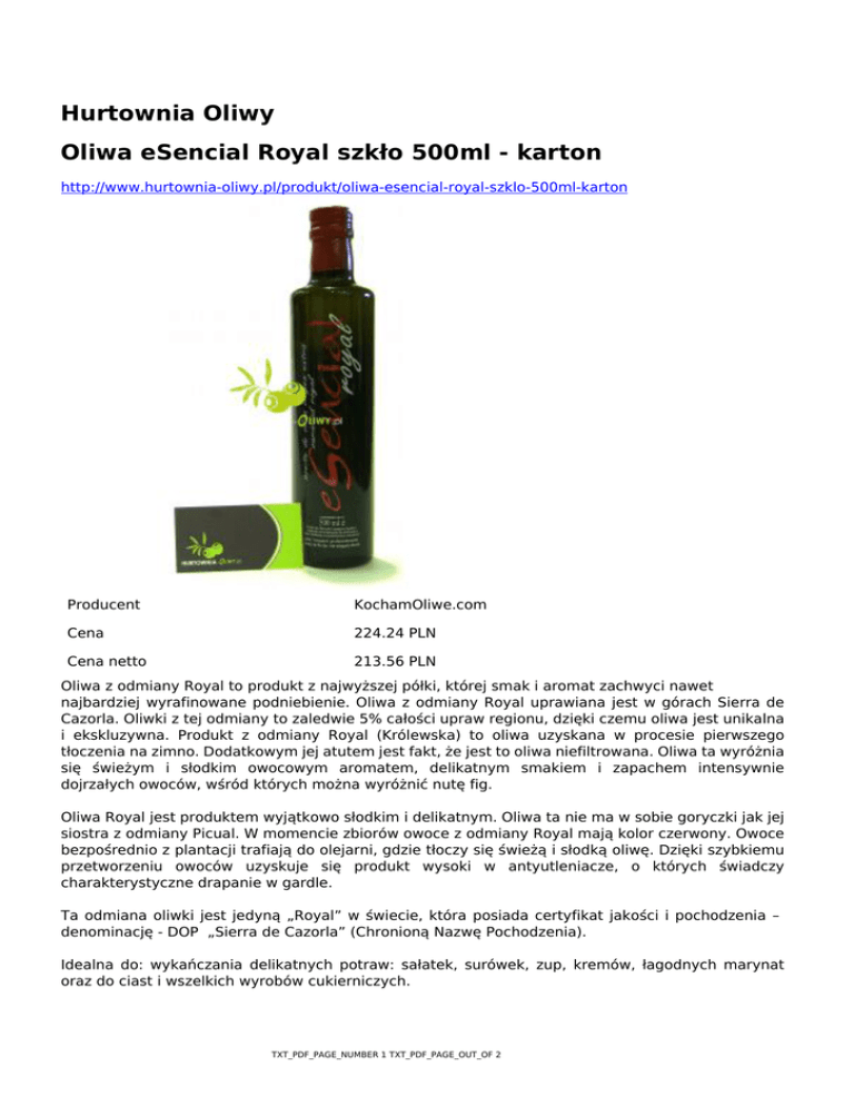 Hurtownia Oliwy Oliwa eSencial Royal szkło 500ml - karton http://www.hurtownia-oliwy.pl/produkt/oliwa-esencial-royal-szklo-500ml-karton Producent KochamOliwe.com Cena 224.24 PLN Cena netto 213.56 PLN Oliwa z odmiany Royal to produkt z najwyższej półki, której smak i aromat zachwyci nawet najbardziej wyrafinowane podniebienie. Oliwa z odmiany Royal uprawiana jest w górach Sierra de Cazorla. Oliwki z tej odmiany to zaledwie 5% całości upraw regionu, dzięki czemu oliwa jest unikalna i ekskluzywna. Produkt z odmiany Royal (Królewska) to oliwa uzyskana w procesie pierwszego tłoczenia na zimno. Dodatkowym jej atutem jest fakt, że jest to oliwa niefiltrowana. Oliwa ta wyróżnia się świeżym i słodkim owocowym aromatem, delikatnym smakiem i zapachem intensywnie dojrzałych owoców, wśród których można wyróżnić nutę fig. Oliwa Royal jest produktem wyjątkowo słodkim i delikatnym. Oliwa ta nie ma w sobie goryczki jak jej siostra z odmiany Picual. W momencie zbiorów owoce z odmiany Royal mają kolor czerwony. Owoce bezpośrednio z plantacji trafiają do olejarni, gdzie tłoczy się świeżą i słodką oliwę. Dzięki szybkiemu przetworzeniu owoców uzyskuje się produkt wysoki w antyutleniacze, o których świadczy charakterystyczne drapanie w gardle. Ta odmiana oliwki jest jedyną „Royal” w świecie, która posiada certyfikat jakości i pochodzenia – denominację - DOP „Sierra de Cazorla” (Chronioną Nazwę Pochodzenia). Idealna do: wykańczania delikatnych potraw: sałatek, surówek, zup, kremów, łagodnych marynat oraz do ciast i wszelkich wyrobów cukierniczych. TXT_PDF_PAGE_NUMBER 1 TXT_PDF_PAGE_OUT_OF 2 Pojemność: 500 ml Kwasowość - 0,2 Kolor - żółto zielony Zapach - delikatny, owocowy W kartonie znajduje się 6 sztuk. Osoby zainteresowane stałą współpracą i/lub zakupem większej partii towaru, proszę o kontakt via e-mail - prześlemy ofertę cenową, skorygowaną odpowiednio pod zapotrzebowanie klienta. TXT_PDF_PAGE_NUMBER 2 TXT_PDF_PAGE_OUT_OF 2