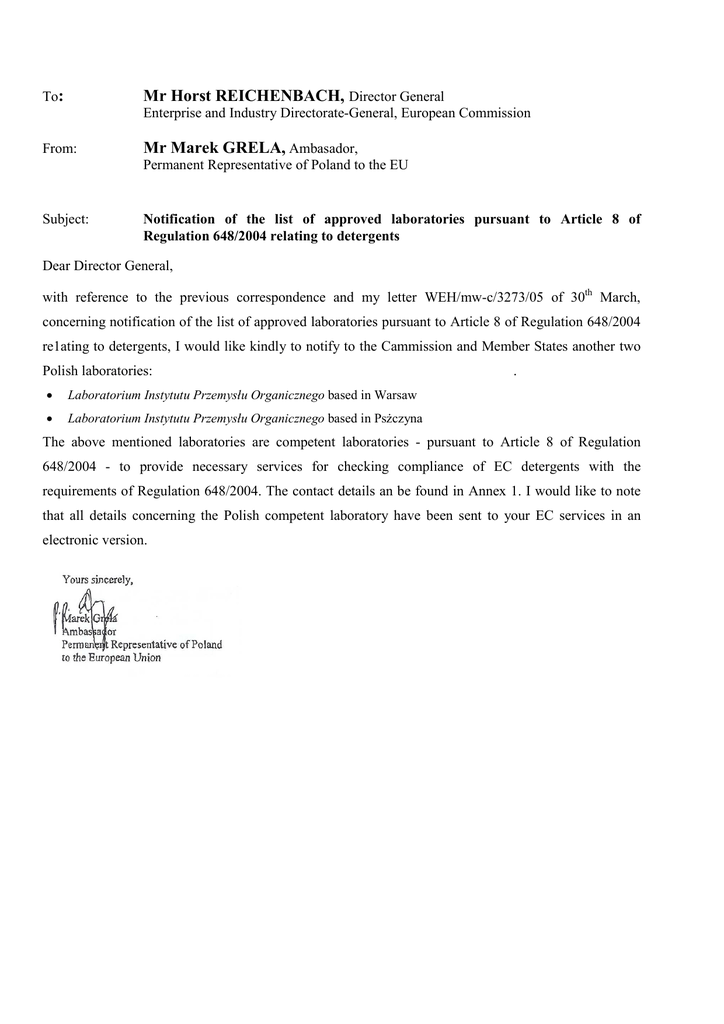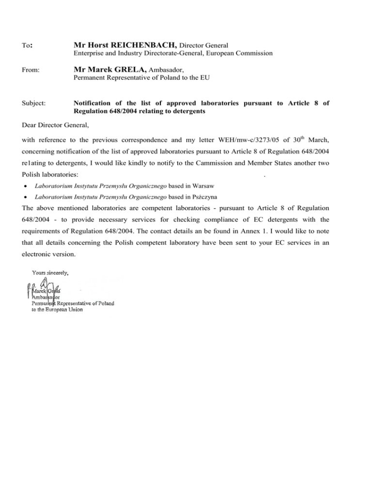 To: Mr Horst REICHENBACH, Director General Enterprise and Industry Directorate-General, European Commission From: Mr Marek GRELA, Ambasador, Permanent Representative of Poland to the EU Subject: Notification of the list of approved laboratories pursuant to Article 8 of Regulation 648/2004 relating to detergents Dear Director General, with reference to the previous correspondence and my letter WEH/mw-c/3273/05 of 30th March, concerning notification of the list of approved laboratories pursuant to Article 8 of Regulation 648/2004 re1ating to detergents, I would like kindly to notify to the Cammission and Member States another two Polish laboratories: • Laboratorium Instytutu Przemysłu Organicznego based in Warsaw • Laboratorium Instytutu Przemysłu Organicznego based in Psżczyna . The above mentioned laboratories are competent laboratories - pursuant to Article 8 of Regulation 648/2004 - to provide necessary services for checking compliance of EC detergents with the requirements of Regulation 648/2004. The contact details an be found in Annex 1. I would like to note that all details concerning the Polish competent laboratory have been sent to your EC services in an electronic version.