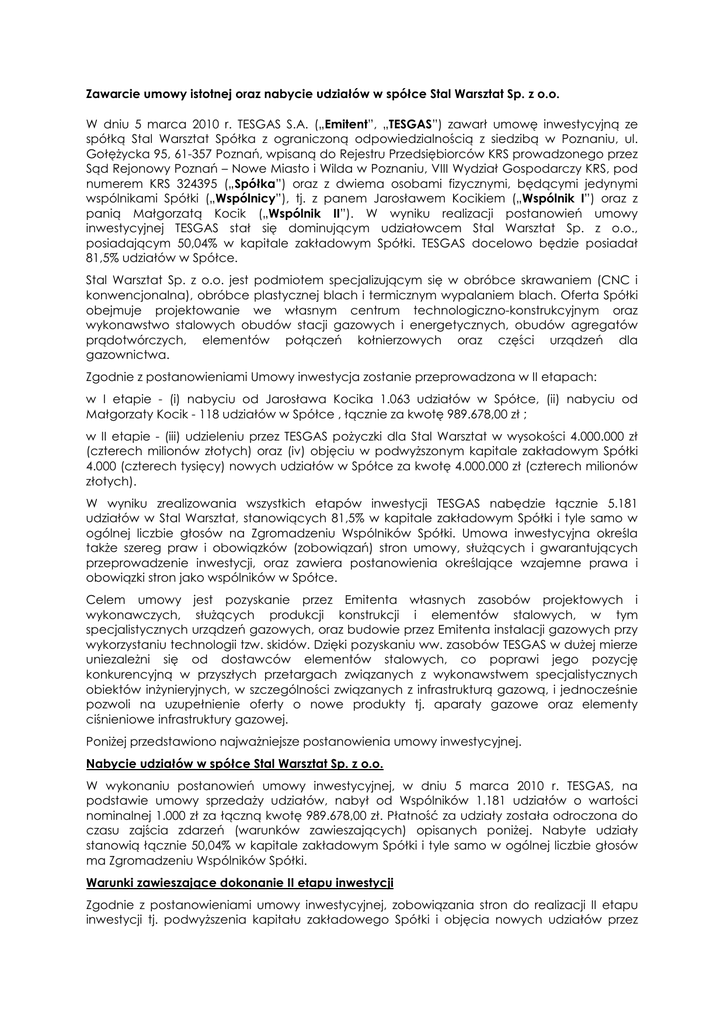 Zawarcie umowy istotnej oraz nabycie udziałów w spółce Stal Warsztat Sp. z o.o. W dniu 5 marca 2010 r. TESGAS S.A. („Emitent”, „TESGAS”) zawarł umowę inwestycyjną ze spółką Stal Warsztat Spółka z ograniczoną odpowiedzialnością z siedzibą w Poznaniu, ul. GołęŜycka 95, 61-357 Poznań, wpisaną do Rejestru Przedsiębiorców KRS prowadzonego przez Sąd Rejonowy Poznań – Nowe Miasto i Wilda w Poznaniu, VIII Wydział Gospodarczy KRS, pod numerem KRS 324395 („Spółka”) oraz z dwiema osobami fizycznymi, będącymi jedynymi wspólnikami Spółki („Wspólnicy”), tj. z panem Jarosławem Kocikiem („Wspólnik I”) oraz z panią Małgorzatą Kocik („Wspólnik II”). W wyniku realizacji postanowień umowy inwestycyjnej TESGAS stał się dominującym udziałowcem Stal Warsztat Sp. z o.o., posiadającym 50,04% w kapitale zakładowym Spółki. TESGAS docelowo będzie posiadał 81,5% udziałów w Spółce. Stal Warsztat Sp. z o.o. jest podmiotem specjalizującym się w obróbce skrawaniem (CNC i konwencjonalna), obróbce plastycznej blach i termicznym wypalaniem blach. Oferta Spółki obejmuje projektowanie we własnym centrum technologiczno-konstrukcyjnym oraz wykonawstwo stalowych obudów stacji gazowych i energetycznych, obudów agregatów prądotwórczych, elementów połączeń kołnierzowych oraz części urządzeń dla gazownictwa. Zgodnie z postanowieniami Umowy inwestycja zostanie przeprowadzona w II etapach: w I etapie - (i) nabyciu od Jarosława Kocika 1.063 udziałów w Spółce, (ii) nabyciu od Małgorzaty Kocik - 118 udziałów w Spółce , łącznie za kwotę 989.678,00 zł ; w II etapie - (iii) udzieleniu przez TESGAS poŜyczki dla Stal Warsztat w wysokości 4.000.000 zł (czterech milionów złotych) oraz (iv) objęciu w podwyŜszonym kapitale zakładowym Spółki 4.000 (czterech tysięcy) nowych udziałów w Spółce za kwotę 4.000.000 zł (czterech milionów złotych). W wyniku zrealizowania wszystkich etapów inwestycji TESGAS nabędzie łącznie 5.181 udziałów w Stal Warsztat, stanowiących 81,5% w kapitale zakładowym Spółki i tyle samo w ogólnej liczbie głosów na Zgromadzeniu Wspólników Spółki. Umowa inwestycyjna określa takŜe szereg praw i obowiązków (zobowiązań) stron umowy, słuŜących i gwarantujących przeprowadzenie inwestycji, oraz zawiera postanowienia określające wzajemne prawa i obowiązki stron jako wspólników w Spółce. Celem umowy jest pozyskanie przez Emitenta własnych zasobów projektowych i wykonawczych, słuŜących produkcji konstrukcji i elementów stalowych, w tym specjalistycznych urządzeń gazowych, oraz budowie przez Emitenta instalacji gazowych przy wykorzystaniu technologii tzw. skidów. Dzięki pozyskaniu ww. zasobów TESGAS w duŜej mierze uniezaleŜni się od dostawców elementów stalowych, co poprawi jego pozycję konkurencyjną w przyszłych przetargach związanych z wykonawstwem specjalistycznych obiektów inŜynieryjnych, w szczególności związanych z infrastrukturą gazową, i jednocześnie pozwoli na uzupełnienie oferty o nowe produkty tj. aparaty gazowe oraz elementy ciśnieniowe infrastruktury gazowej. PoniŜej przedstawiono najwaŜniejsze postanowienia umowy inwestycyjnej. Nabycie udziałów w spółce Stal Warsztat Sp. z o.o. W wykonaniu postanowień umowy inwestycyjnej, w dniu 5 marca 2010 r. TESGAS, na podstawie umowy sprzedaŜy udziałów, nabył od Wspólników 1.181 udziałów o wartości nominalnej 1.000 zł za łączną kwotę 989.678,00 zł. Płatność za udziały została odroczona do czasu zajścia zdarzeń (warunków zawieszających) opisanych poniŜej. Nabyte udziały stanowią łącznie 50,04% w kapitale zakładowym Spółki i tyle samo w ogólnej liczbie głosów ma Zgromadzeniu Wspólników Spółki. Warunki zawieszające dokonanie II etapu inwestycji Zgodnie z postanowieniami umowy inwestycyjnej, zobowiązania stron do realizacji II etapu inwestycji tj. podwyŜszenia kapitału zakładowego Spółki i objęcia nowych udziałów przez Emitenta, a takŜe zawarcia umowy poŜyczki pomiędzy Spółką a Emitentem, zaleŜą od zajścia następujących zdarzeń (warunki zawieszające): 1) zawarcia pomiędzy Spółką a Wspólnikiem I umowy sprzedaŜy na rzecz Spółki prawa uŜytkowania wieczystego nieruchomości gruntu Miasta Poznań, połoŜonego w województwie wielkopolskim, miasto Poznań, dzielnica Nowe Miasto, obręb Starołęka, połoŜonej przy ul. GołęŜyckiej 95, stanowiącej działki o numerach 2/33, 2/43, 2/41, 4/21, 4/25, 1/49 o łącznym obszarze 0.74.79 ha oraz własność posadowionych na gruncie wskazanym powyŜej, budynków i budowli, stanowiących odrębny od gruntu przedmiot własności, tj. budynku warsztatowo-magazynowego, jednokondygnacyjnego o powierzchni uŜytkowej 1098 m2 oraz budynku magazynowego z kotłownią, jednokondygnacyjnego o powierzchni uŜytkowej 469 m2 („Nieruchomość”); 2) złoŜenia zawiadomienia Spółce o nabyciu udziałów od Wspólników przez Emitenta i wpisania Emitenta do księgi udziałów Spółki jako wspólnika Spółki; 3) złoŜenia przez Spółkę wniosku do sądu rejestrowego o wpis w KRS Emitenta jako wspólnika Spółki oraz wniosku o wpis zmiany umowy Spółki, zgodnie z postanowieniami umowy inwestycyjnej; 4) dokonania wpisu Spółki jako uŜytkownika wieczystego przedmiotowej nieruchomości (oraz jako właściciela posadowionych na gruncie budynków i budowli) w księdze wieczystej numer PO2P/00190452/2. Przedstawione powyŜej warunki zawieszające zostały zastrzeŜone na korzyść Emitenta. W przypadku, gdy opisane powyŜej warunki zawieszające nie zostaną spełnione w terminie 6 (sześciu) miesięcy od daty zawarcia umowy inwestycyjnej, Emitent nie będzie zobowiązany do kontynuowania wykonania zobowiązań określonych w tej umowie inwestycyjnej. Ponadto, jeŜeli warunek zawieszający nie zostanie spełniony w terminie 6 (sześciu) miesięcy od daty zawarcia umowy inwestycyjnej, Emitentowi 
