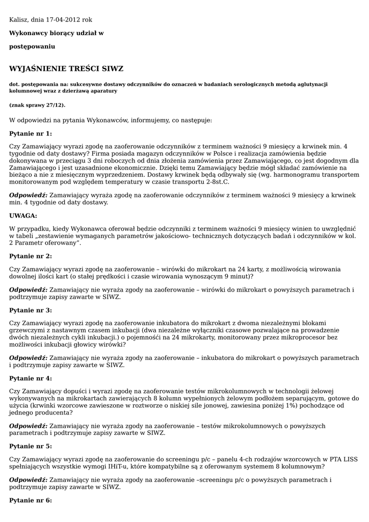 Kalisz,dnia17-04-2012rok Wykonawcybiorącyudziałw postępowaniu WYJAŚNIENIETREŚCISIWZ dot.postępowaniana:sukcesywnedostawyodczynnikówdooznaczeńwbadaniachserologicznychmetodąaglutynacji kolumnowejwrazzdzierżawąaparatury (znaksprawy27/12). WodpowiedzinapytaniaWykonawców,informujemy,conastępuje: Pytanienr1: CzyZamawiającywyrazizgodęnazaoferowanieodczynnikówzterminemważności9miesięcyakrwinekmin.4 tygodnieoddatydostawy?FirmaposiadamagazynodczynnikówwPolsceirealizacjazamówieniabędzie dokonywanawprzeciągu3dniroboczychoddniazłożeniazamówieniaprzezZamawiającego,cojestdogodnymdla Zamawiającegoijestuzasadnioneekonomicznie.DziękitemuZamawiającybędziemógłskładaćzamówieniena bieżącoaniezmiesięcznymwyprzedzeniem.Dostawykrwinekbędąodbywałysię(wg.harmonogramutransportem monitorowanympodwzględemtemperaturywczasietransportu2-8st.C. Odpowiedź:Zamawiającywyrażazgodęnazaoferowanieodczynnikówzterminemważności9miesięcyakrwinek min.4tygodnieoddatydostawy. UWAGA: Wprzypadku,kiedyWykonawcaoferowałbędzieodczynnikizterminemważności9miesięcywinientouwzględnić wtabeli„zestawieniewymaganychparametrówjakościowo-technicznychdotyczącychbadańiodczynnikówwkol. 2Parametroferowany”. Pytanienr2: CzyZamawiającywyrazizgodęnazaoferowanie–wirówkidomikrokartna24karty,zmożliwościąwirowania dowolnejilościkart(ostałejprędkościiczasiewirowaniawynoszącym9minut)? Odpowiedź:Zamawiającyniewyrażazgodynazaoferowanie–wirówkidomikrokartopowyższychparametrachi podtrzymujezapisyzawartewSIWZ. Pytanienr3: CzyZamawiającywyrazizgodęnazaoferowanieinkubatoradomikrokartzdwomaniezależnymiblokami grzewczymiznastawnymczaseminkubacji(dwaniezależnewyłącznikiczasowepozwalającenaprowadzenie dwóchniezależnychcykliinkubacji.)opojemnośćina24mikrokarty,monitorowanyprzezmikroprocesorbez możliwościinkubacjigłowicywirówki? Odpowiedź:Zamawiającyniewyrażazgodynazaoferowanie–inkubatoradomikrokartopowyższychparametrach ipodtrzymujezapisyzawartewSIWZ. Pytanienr4: CzyZamawiającydopuściiwyrazizgodęnazaoferowanietestówmikrokolumnowychwtechnologiiżelowej wykonywanychnamikrokartachzawierających8kolumnwypełnionychżelowympodłożemseparującym,gotowedo użycia(krwinkiwzorcowezawieszonewroztworzeoniskiejsilejonowej,zawiesinaponiżej1%)pochodząceod jednegoproducenta? Odpowiedź:Zamawiającyniewyrażazgodynazaoferowanie–testówmikrokolumnowychopowyższych parametrachipodtrzymujezapisyzawartewSIWZ. Pytanienr5: CzyZamawiającywyrazizgodęnazaoferowaniedoscreeningup/c–panelu4-chrodzajówwzorcowychwPTALISS spełniającychwszystkiewymogiIHiT-u,którekompatybilnesązoferowanymsystemem8kolumnowym? Odpowiedź:Zamawiającyniewyrażazgodynazaoferowanie–screeningup/copowyższychparametrachi podtrzymujezapisyzawartewSIWZ. Pytanienr6: CzyZamawiającywyrazizgodęnazaoferowaniemożliwościwykonaniaTestówdooznaczaniaprzeciwciał Treponemapallidiumwrazzkontroląwilościwyszczególnionychwformularzuasortymentowo-cenowym(testna syfilispkt.7)naobecniedzierżawionymprzezZamawiającegoanalizatorzeimmunologicznymnakosztOferenta? ZamawiającymającmożliwośćwykonaniategotestunadzierżawionymobecnieanalizatorzeArchitekti1000na kosztoferentaumożliwiłobywzięcieudziałuwpostępowaniuinnymoferentomniżfirmawybranajużprzez Zamawiającego. Odpowiedź:ZamawiającyniewyrażazgodynapowyższąpropozycjęipodtrzymujezapisyzawartewSIWZ. ZMIANATREŚCISIWZ Zamawiającyinformuje,żetreśćodpowiedzinapytanienr1stanowizgodniezart.38ust.4ustawy„Prawo zamówieńpublicznych”(Dz.U.z2010r.Nr113,poz.759zpóźn.zmn.)zmianętreściSIWZijestwiążącadla wszystkichWykonawcówbiorącychudziałwprzedmiotowympostępowaniu. PozostałezapisySIWZpozostająbezzmian.