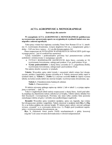 ACTA AGROPHYSICA MONOGRAPHIAE Instrukcja dla autorów W czasopiśmie ACTA AGROPHYSICA MONOGRAPHIAE publikowane są recenzowane opracowania oparte na oryginalnych wynikach badań oraz monografie z zakresu agrofizyki. Tekst pracy winien być napisany czcionką Times New Roman CE nr 11, interlinia 13, wyrównanie dwustronne, wcięcie akapitowe 0,6 cm, z marginesami: górny i dolny – 5,65 cm; lewy i prawy – 4,1 cm dla formatu papieru A4. Praca rozpoczyna się WYKAZEM WAŻNIEJSZYCH OZNACZEŃ (jeśli tego wymaga praca) – jest to rozdział bez numeracji Tytuły rozdziałów i podrozdziałów powinny być ponumerowane cyframi arabskimi i zróżnicowane w następujący sposób: • TYTUŁY ROZDZIAŁÓW GŁÓWNYCH: duże litery, czcionka nr 10, wyrównanie lewostronne, odstęp nad tytułem 15 pt, pod tytułem 10 pt; • Tytuły podrozdziałów: z dużej litery czcionka nr 11, pogrubiona (bold), wyrównanie lewostronne, odstęp (nad i pod tytułem) 10 pt; Nie należy dzielić wyrazów w tytułach. Tabele: Wszystkie opisy tabel (tytuły i zawartość tabel) winny być dwujęzyczne: polskie i angielskie, pisane czcionką nr 9. Należy stosować pełny zapis w tytułach tabel, tj. Tabela 1. (Table 1.) i używać czcionki bold do zapisu wyrazu tabela; na końcu tytułu tabeli nie stawiać kropki; wyrównywanie dwustronne, np.: Tabela 1. Charakterystyka badanych odmian Table 1. Characteristics ……… W tekście używamy pełnego zapisu np. tabela 1, lub w tabeli 1, a cytując zapisujemy w nawiasie – (tab. 1). Tekst w nagłówkach tabeli należy rozpoczynać z dużej litery. Jeżeli pod tabelą znajdują się objaśnienia należy zakończyć je kropką. Tabele należy składać bez linii bocznych i wewnętrznych. Powinny one mieć tylko cienkie linie poziome zamykające tabelę od góry i od dołu oraz podkreślające nagłówek. Rysunki: Wszystkie opisy rysunków (podpisy, opisy osi, legendy, itp.) winny być dwujęzyczne: polskie i angielskie. Należy stosować w podpisie skrót Rys. 1. (Fig. 1.), a na końcu podpisu nie stawiać kropki. W tekście pracy należy używać pełnego wyrazu „rysunek”, a w cytowaniu skrótu (rys. 1). Podpis pod rysunkiem zapisujemy z wyrównywaniem dwustronnym, np. Rys. 1. Zależność ilości jonów Fe(II) uruchamianych z gleby lessowej (mg⋅dm-3) od czasu trwania doświadczenia w dwóch temperaturach Fig. 1. Relation between Fe(II) ions (mg dm-3) activated in the loess soil and the experimental time at two temperatures W opisach osi rysunków stosujemy następująca zasadę: zaczynamy dużą literą i podajemy jednostkę w nawiasie okrągłym, np. Wilgotność – Moisture (%). Jeśli opis jest długi zapisujemy wersję polską w jednej linijce, angielską w drugiej, a po niej jednostkę, np. Udział ziaren uszkodzonych i zdolność kiełkowania Share of damaged grains and germination capacity (%) Wzory: należy zapisać czcionką nr 11, wyrównywanie centralne. Odstęp nad i pod wzorem powinien wynosić 0,5 cm. Wzory powinny być ponumerowane, a numery należy umieścić w nawiasach okrągłych przy prawym marginesie. Kursywą należy wyróżnić zarówno w tekście jak i we wzorach: - symbole wielkości fizycznych; - jedno- i wieloliterowe skróty wyrazów w indeksach (tn, Wkońc.) lub wykładnikach (bz); - nazwy łacińskie. Prostym pismem składa się: - cyfrowe wykładniki potęg oraz cyfrowe frakcje górne i dolne (22, b3, t2, k2); - skróty funkcji trygonometrycznych i hiperbolicznych (cos, tg), symbole operatorów wektorowych (grad, div), znaki pierwiastka i całki oraz stałe symbole funkcyjne (d, f, π, Σ, const, exp), symbole jednostek miary (Ω, µm), symbole jednostek miary w indeksach dolnych (hm), symbole pierwiastków chemicznych (Cu, kFe), symbole stałych fizycznych (Re - liczba Reynoldsa), oznaczenia typów maszyn i przyrządów, litery przy numerach rysunków (Rys. 15a), wszelkie nawiasy. Cytowane pozycje literatury powinny być w PIŚMIENNICTWIE (REFERENCES w wersji angielskiej) uszeregowane alfabetycznie według nazwisk autorów. W przypadku artykułów pisanych w języku angielskim, tytuły cytowanych w nich prac należy podawać również w języku angielskim (z wyjątkiem publikacji francusko- i niemieckojęzycznych) z zaznaczeniem oryginalnego języka, np. (in Polish), (in Russian). Literatura powinna być cytowana w tekście w nawiasach okrągłych poprzez podanie nazwiska autora i roku wydania publikacji – (Kowalski 1999) lub (Kowalski i Dorn 1998) – w wersji angielskiej (Kowalski and Dorn 1998). Przy cytowaniu nazwisk autorów publikacji, gdy jest ich więcej niż dwóch, należy stosować skrót: (Kowalski i in. 2002), w wersji angielskiej (Kowalski et al. 2002). Nie powinno się jednorazowo cytować więcej niż 5 pozycji literatury. Przykład: PIŚMIENNICTWO Domian E., Oręziak S., 2010. Wpływ składnika białkowego na wybrane właściwości fizyczne suszonych rozpyłowo emulsji oleju rzepakowego. Zesz. Probl. Post. Nauk Roln., 553, 63-73. Jury W.A., Roth K., 1990. Transfer Function and Solute Movement through Soil: Theory and Applications. Birkhäser Verlag, Basel, Switzerland. Lee S.J., Ying D.Y., 2008. Encapsulation of fish oils. In. N. Garti N. (Ed.) Delivery and controlled release of bioactives in foods and nutraceuticals. Woodhead Publishing Limited Cambridge, England, 370-403. Sillick M., Gregson C.M., 2010. Critical water activity of disaccharide/maltodextrin blends. Carbohydr. Polymer, 79, 1028-1033. Na końcu pracy powinno być streszczenie w języku polskim i angielskim (SUMMARY) – około 1 strony) wraz z angielskim tytułem pracy, miejscem pracy i słowami kluczowymi (do 5 wyrazów) oraz adresy autorów. W liczbach dziesiętnych może być 5 miejsc łącznie z przecinkiem. Obowiązuje system jednostek SI. Jednostki należy zapisywać potęgowo. W wersji polskiej: (m⋅s-1) Autor/autorzy zobowiązani są złożyć oświadczenie, że praca nie była publikowana w innym czasopiśmie. Autorzy prac partycypuj