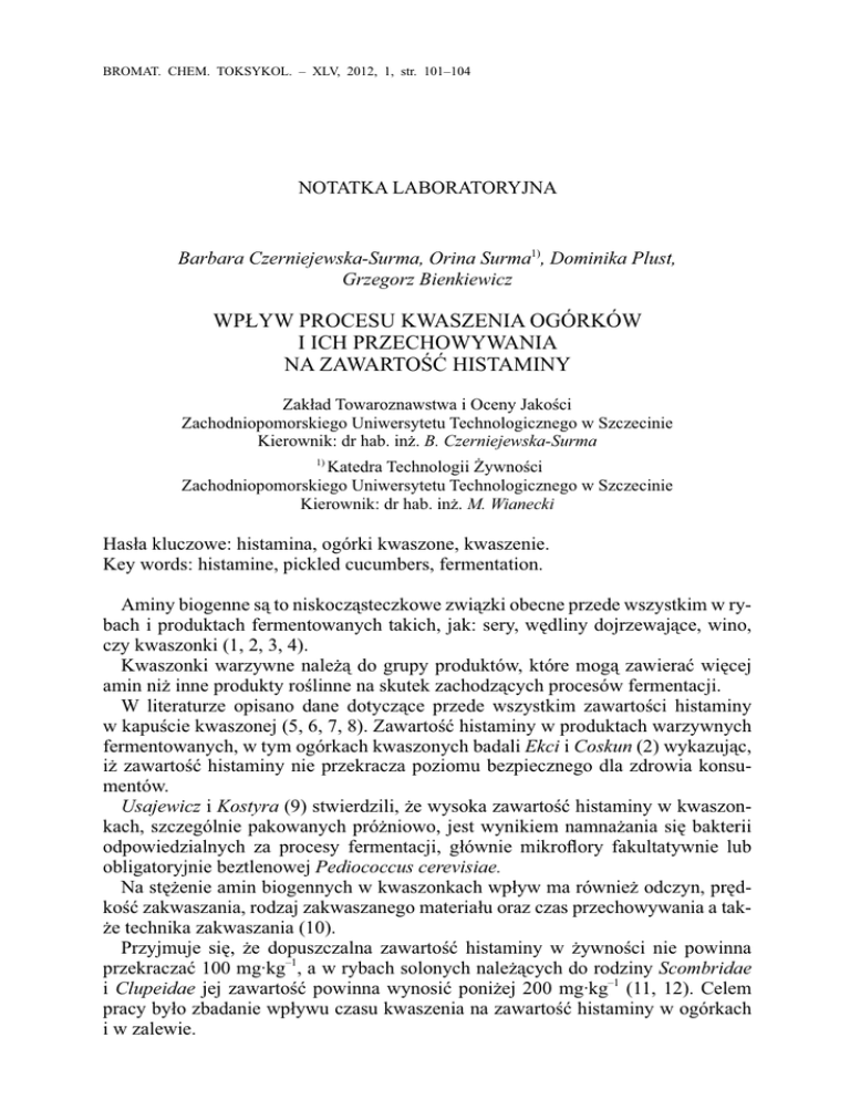 BROMAT. CHEM. TOKSYKOL. – XLV, 2012, 1, str. 101–104 NOTATKA LABORATORYJNA Barbara Czerniejewska-Surma, Orina Surma1), Dominika Plust, Grzegorz Bienkiewicz WPŁYW PROCESU KWASZENIA OGÓRKÓW I ICH PRZECHOWYWANIA NA ZAWARTOŚĆ HISTAMINY Zakład Towaroznawstwa i Oceny Jakości Zachodniopomorskiego Uniwersytetu Technologicznego w Szczecinie Kierownik: dr hab. inż. B. Czerniejewska-Surma 1) Katedra Technologii Żywności Zachodniopomorskiego Uniwersytetu Technologicznego w Szczecinie Kierownik: dr hab. inż. M. Wianecki Hasła kluczowe: histamina, ogórki kwaszone, kwaszenie. Key words: histamine, pickled cucumbers, fermentation. Aminy biogenne są to niskocząsteczkowe związki obecne przede wszystkim w rybach i produktach fermentowanych takich, jak: sery, wędliny dojrzewające, wino, czy kwaszonki (1, 2, 3, 4). Kwaszonki warzywne należą do grupy produktów, które mogą zawierać więcej amin niż inne produkty roślinne na skutek zachodzących procesów fermentacji. W literaturze opisano dane dotyczące przede wszystkim zawartości histaminy w kapuście kwaszonej (5, 6, 7, 8). Zawartość histaminy w produktach warzywnych fermentowanych, w tym ogórkach kwaszonych badali Ekci i Coskun (2) wykazując, iż zawartość histaminy nie przekracza poziomu bezpiecznego dla zdrowia konsumentów. Usajewicz i Kostyra (9) stwierdzili, że wysoka zawartość histaminy w kwaszonkach, szczególnie pakowanych próżniowo, jest wynikiem namnażania się bakterii odpowiedzialnych za procesy fermentacji, głównie mikroflory fakultatywnie lub obligatoryjnie beztlenowej Pediococcus cerevisiae. Na stężenie amin biogennych w kwaszonkach wpływ ma również odczyn, prędkość zakwaszania, rodzaj zakwaszanego materiału oraz czas przechowywania a także technika zakwaszania (10). Przyjmuje się, że dopuszczalna zawartość histaminy w żywności nie powinna przekraczać 100 mg·kg–1, a w rybach solonych należących do rodziny Scombridae i Clupeidae jej zawartość powinna wynosić poniżej 200 mg·kg–1 (11, 12). Celem pracy było zbadanie wpływu czasu kwaszenia na zawartość histaminy w ogórkach i w zalewie. 102 B. Czerniejewska-Surma i inni Nr 1 MATERIAŁ I METODY W celu określenia stężenia histaminy podczas procesu fermentacji ogórków kwaszonych badania prowadzono na ogórkach świeżych (Cucumis dativus L. odm. ´Śremska F1´). Wyprodukowano z nich ogórki kwaszone przechowywane w słojach, w kontrolowanych warunkach temp. 15/13°C (dzień/noc). Ogórki świeże (Cucumis dativus L. odm. ´Śremska F1´) zakwaszano w słojach wg PN-70/A-77701 (13). Odpowiadały one wymaganiom I klasy jakości, wg PN-85/R75359 (14). Ogórki i zalewę badano po 7, 14, 21 i 90 dniach od momentu wyprodukowania. Warzywa do badań otrzymano z zakładu przetwórstwa rolnego mieszczącego się w województwie zachodniopomorskim. Do badań warzywa rozdrabniano przy użyciu robota kuchennego Severin. Każdorazowo do badań pobierano po ok. 0,5–2 kg warzyw. Zawartość histaminy oznaczano metodą kolorymetryczną, wg PN-87-A-86784 (15). Metoda polegała na wyodrębnieniu histaminy z próby poprzez ekstrakcję za pomocą kwasu trichlorooctowego oraz eliminację substancji balastowych na anionicie Sephadex DEAE A-25. Przeprowadzono reakcję sprzęgania z chlorkiem pnitrobenzenodiazoniowym. Pomiar barwnego produktu sprzęgania w octanie etylu wykonano przy dł. fal 500 nm, na spektrofotometrze UV-VIS Helios. WYNIKI I ICH OMÓWIENIE Jak wynika z ryc. 1 proces kwaszenia ogórków ma wpływ na zawartość histaminy. Zmiany zawartości tej aminy w czasie przechowywania zarówno w ogórkach kwaszonych, jak i w zalewie miały przebieg prostoliniowy. Ryc. 1. Zmiany zawartości histaminy w ogórkach kwaszonych i zalewie w czasie przechowywania. Próby oznaczone tą samą literą nie różnią się istotnie (p < 0,05, n = 5) Fig. 1. Changes in histamine content during fermentation of cucumbers. Po 90 dniach od momentu rozpoczęcia procesu kwaszenia zawartość histaminy w ogórkach wzrosła prawie 3-krotnie w porównaniu z początkową zawartością tej Nr 1 Notatka laboratoryjna 103 aminy w ogórkach świeżych. Jednocześnie zaobserwowano zwiększającą się ilość aminy w zalewie. Między 21 a 90 dniem przechowywania stwierdzono istotny wzrost zawartości histaminy w ogórkach (o ok. 99%) i w zalewie (o ok. 61%). Tak duży wzrost zawartości histaminy może wynikać z namnażania się bakterii odpowiedzialnych za proces fermentacji (16). Sugeruje to, że tworzenie się histaminy może być efektem przemian biochemicznych składników w poszczególnych etapach fermentacji. Proces kwaszenia trwający 7 dni nie spowodował wzrostu zawartości histaminy (17). Zawartość histaminy w ogórkach i w zalewie w całym okresie kwaszenia nie przekraczała zawartości bezpiecznej dla człowieka. Według Ekci i Coskun (2) ogórki kwaszone dostępne na rynku tureckim zawierały od 26,66 do 44,72 mg·kg–1 produktu, czyli wartości bardzo zbliżone do wyników uzyskanych w niniejszej pracy. Wyniki zawartości histaminy w kapuście kwaszonej dostępne w piśmiennictwie są bardziej zróżnicowane. Badania Mayera i Pause (7) oraz Taylora i współpr. (8) wykazały, że zawartość histaminy w kapuście kwaszonej kształtowała się w zakresie od 0,07 do 2,0 mg·kg–1 produktu. Polska kapusta kwaszona analizowana przez Gajewską i współpr. (5) zawierała tej aminy maksymalnie 1,1 mg·kg–1 produktu. Według Ganowiaka i współpr. (6) zawartość histaminy w kapuście świeżej wynosiła 31 do 54 mg/kg, a w miesiąc po jej zakwaszeniu w krajance – od 28 do 158 mg·kg–1. Natomiast w soku z kapusty – od 112 do 262 mg·kg–1. W przypadku ogórków badanych w niniejszej pracy zaobserwowane zmiany zawartości histaminy były podobne, z tym, że w przypadku kapusty kwaszonej zalewa wykazywała znacznie wyższą zawartość badanej aminy niż produkt. WNIOSKI 1. Ogórki kwaszone i zalewa nie zawierają histaminy w ilościach prze