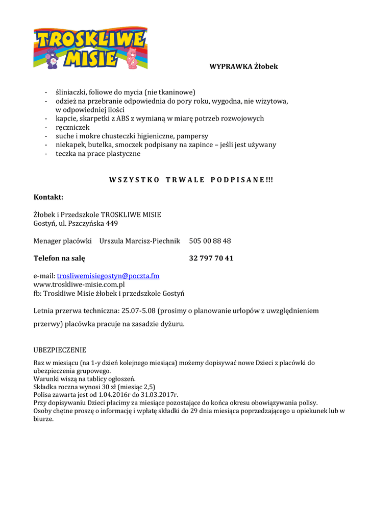 WYPRAWKA Żłobek - śliniaczki, foliowe do mycia (nie tkaninowe) odzież na przebranie odpowiednia do pory roku, wygodna, nie wizytowa, w odpowiedniej ilości kapcie, skarpetki z ABS z wymianą w miarę potrzeb rozwojowych ręczniczek suche i mokre chusteczki higieniczne, pampersy niekapek, butelka, smoczek podpisany na zapince – jeśli jest używany teczka na prace plastyczne W S Z Y S T K O T R W A L E P O D P I S A N E !!! Kontakt: Żłobek i Przedszkole TROSKLIWE MISIE Gostyń, ul. Pszczyńska 449 Menager placówki Urszula Marcisz-Piechnik Telefon na salę 505 00 88 48 32 797 70 41 e-mail: [email protected] www.troskliwe-misie.com.pl fb: Troskliwe Misie żłobek i przedszkole Gostyń Letnia przerwa techniczna: 25.07-5.08 (prosimy o planowanie urlopów z uwzględnieniem przerwy) placówka pracuje na zasadzie dyżuru. UBEZPIECZENIE Raz w miesiącu (na 1-y dzień kolejnego miesiąca) możemy dopisywać nowe Dzieci z placówki do ubezpieczenia grupowego. Warunki wiszą na tablicy ogłoszeń. Składka roczna wynosi 30 zł (miesiąc 2,5) Polisa zawarta jest od 1.04.2016r do 31.03.2017r. Przy dopisywaniu Dzieci płacimy za miesiące pozostające do końca okresu obowiązywania polisy. Osoby chętne proszę o informację i wpłatę składki do 29 dnia miesiąca poprzedzającego u opiekunek lub w biurze.