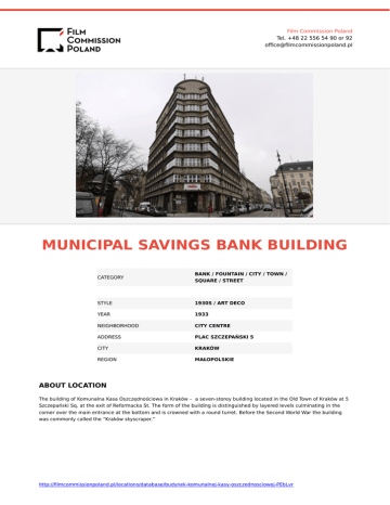 Film Commission Poland Tel. +48 22 556 54 90 or 92 office@filmcommissionpoland.pl MUNICIPAL SAVINGS BANK BUILDING CATEGORY BANK / FOUNTAIN / CITY / TOWN / SQUARE / STREET STYLE 1930S / ART DECO YEAR 1933 NEIGHBORHOOD CITY CENTRE ADDRESS PLAC SZCZEPAŃSKI 5 CITY KRAKÓW REGION MAŁOPOLSKIE ABOUT LOCATION The building of Komunalna Kasa Oszczędnościowa in Kraków – a seven-storey building located in the Old Town of Kraków at 5 Szczepański Sq. at the exit of Reformacka St. The form of the building is distinguished by layered levels culminating in the corner over the main entrance at the bottom and is crowned with a round turret. Before the Second World War the building was commonly called the “Kraków skyscraper.” http://filmcommissionpoland.pl/locations/database/budynek-komunalnej-kasy-oszczednosciowej-PEbLvr